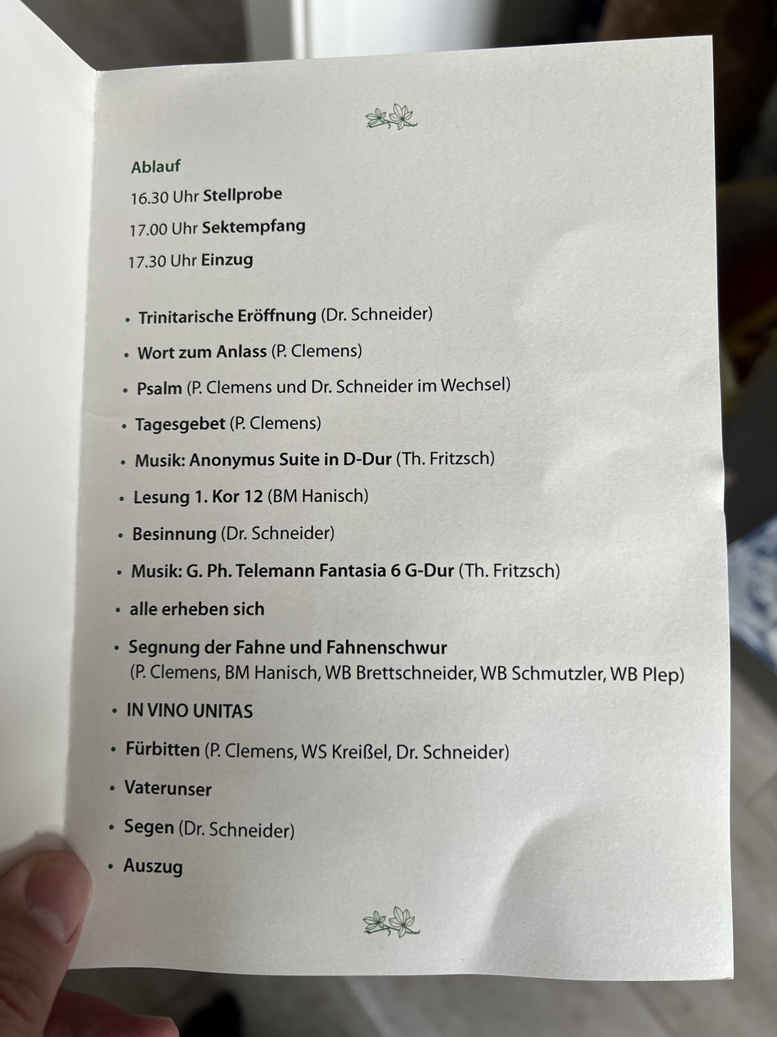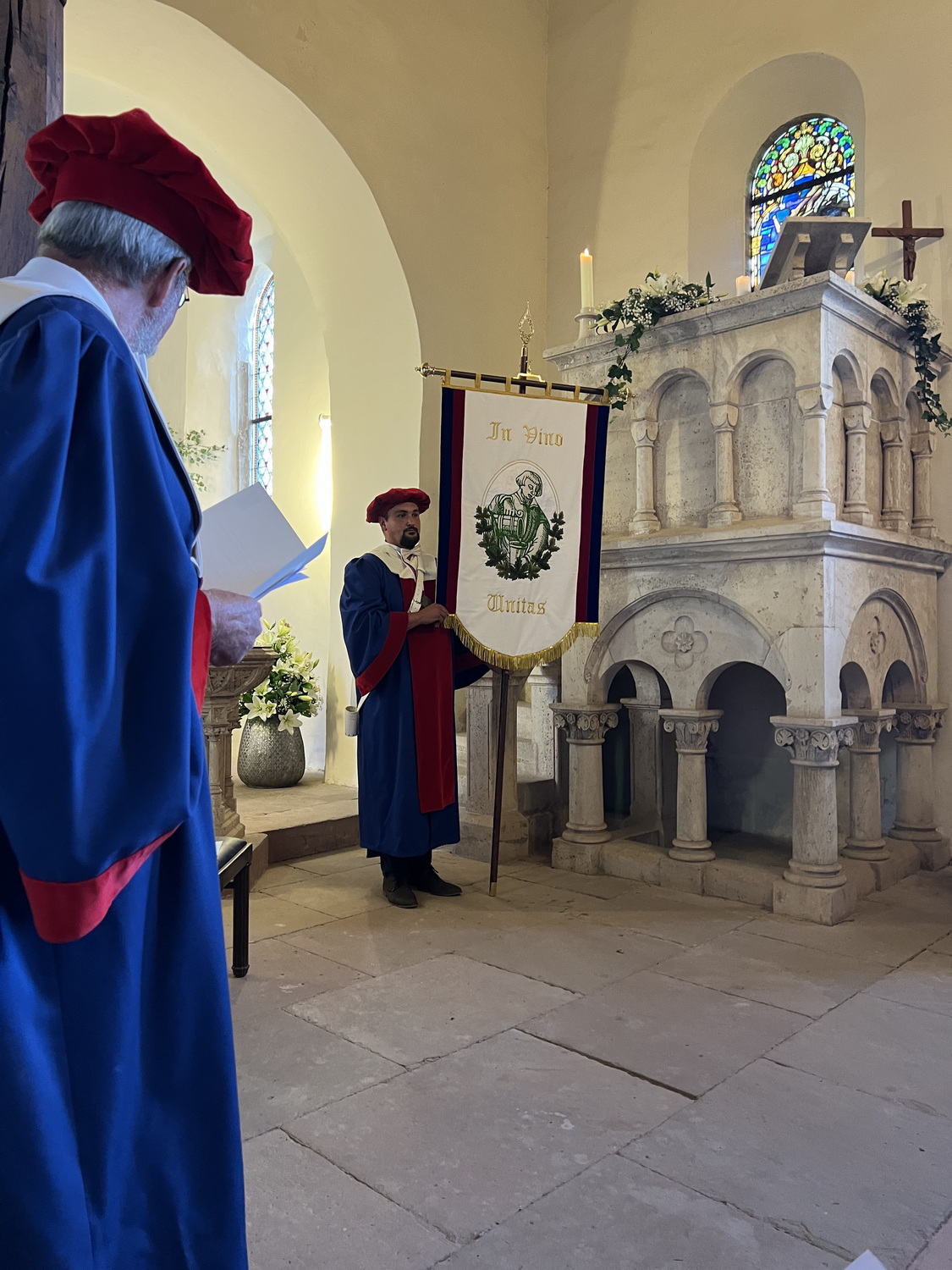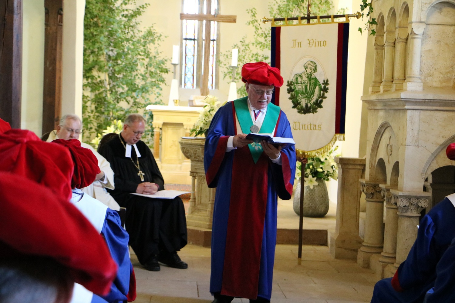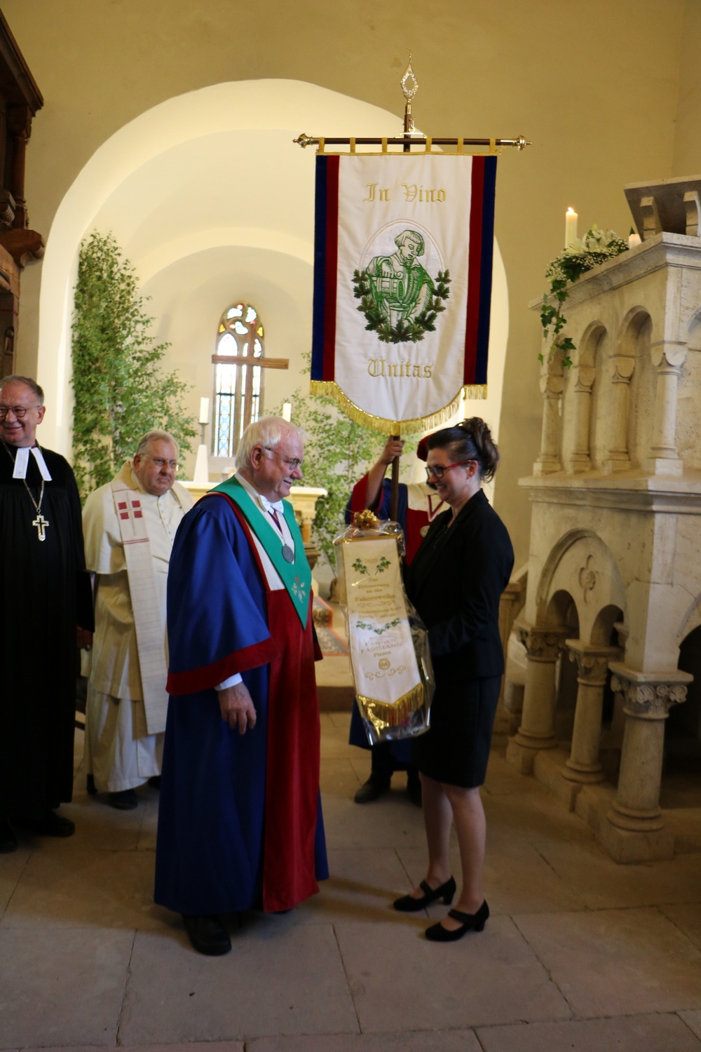 Um 17:30 Uhr zogen die Weinschwestern und Weinbrüder in die festlich geschmückte Klosterkirche ein. In dem ehrfurchtgebietenden Raum begann die feierliche Weihe der neuen Fahne, ein Moment von großer Bedeutung, der alle Anwesenden tief berührte. Die Zeremonie wurde von Bischof Dr. Johann Schneider und Prior Prof. Dr. Clemens Dölken mit großer Würde geleitet. Präzeptor Weinbruder Braun koordinierte den Ablauf und sorgte für eine harmonische und feierliche Zeremonie. Bischof Schneider eröffnete die Feier trinitarisch, bevor Prior Dölken mit warmen und tiefsinnigen Worten auf die Bedeutung dieses Tages einstimmte. Psalmgebet, Tagesgebet und eine besinnliche Ansprache erfüllten die Kirche mit einer ergreifenden Stille.