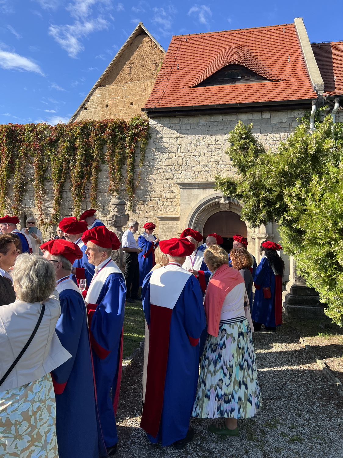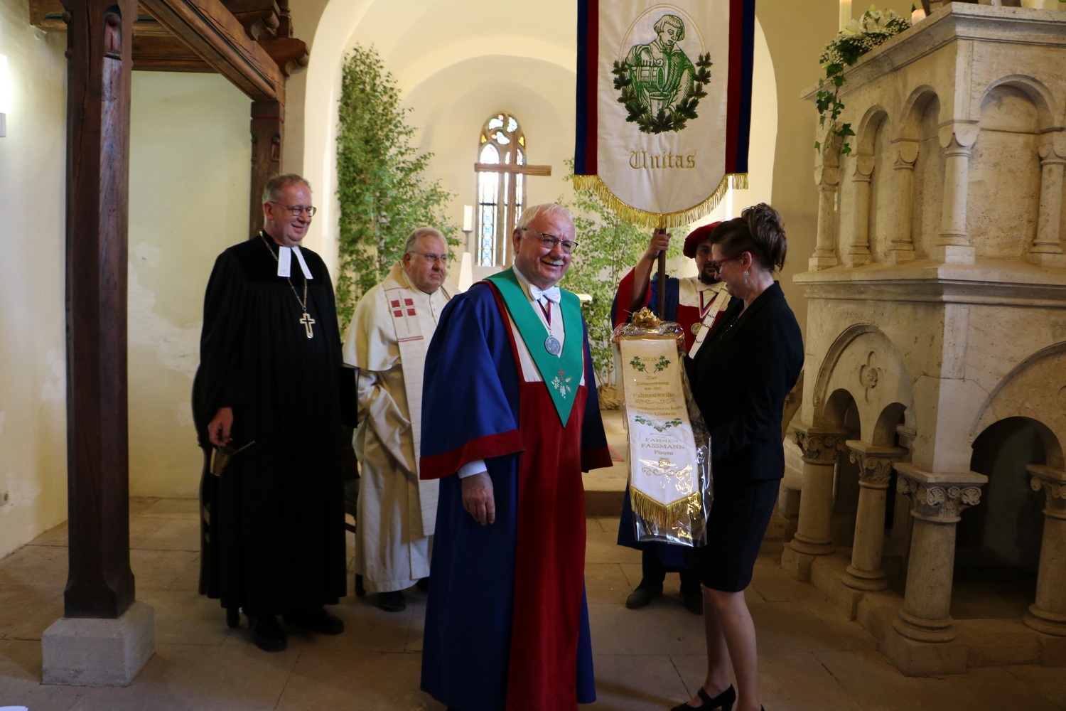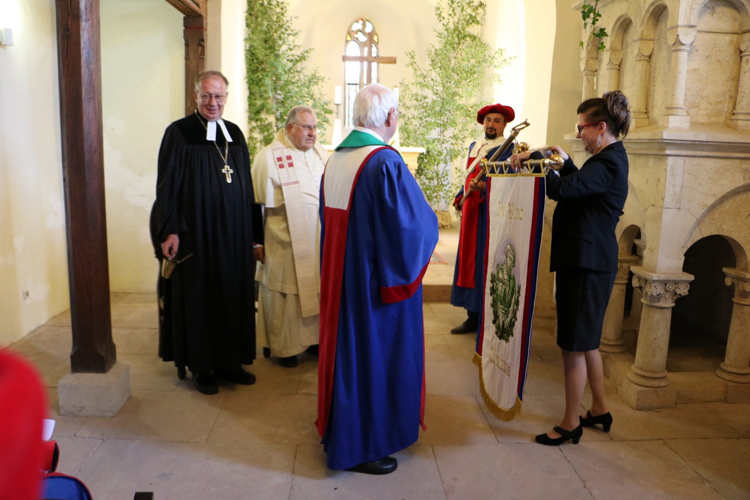 Um 17:30 Uhr zogen die Weinschwestern und Weinbrüder in die festlich geschmückte Klosterkirche ein. In dem ehrfurchtgebietenden Raum begann die feierliche Weihe der neuen Fahne, ein Moment von großer Bedeutung, der alle Anwesenden tief berührte. Die Zeremonie wurde von Bischof Dr. Johann Schneider und Prior Prof. Dr. Clemens Dölken mit großer Würde geleitet. Präzeptor Weinbruder Braun koordinierte den Ablauf und sorgte für eine harmonische und feierliche Zeremonie. Bischof Schneider eröffnete die Feier trinitarisch, bevor Prior Dölken mit warmen und tiefsinnigen Worten auf die Bedeutung dieses Tages einstimmte. Psalmgebet, Tagesgebet und eine besinnliche Ansprache erfüllten die Kirche mit einer ergreifenden Stille.