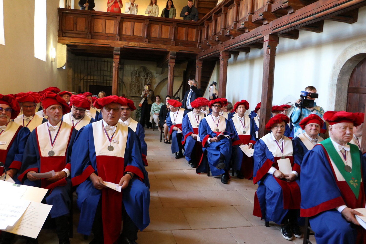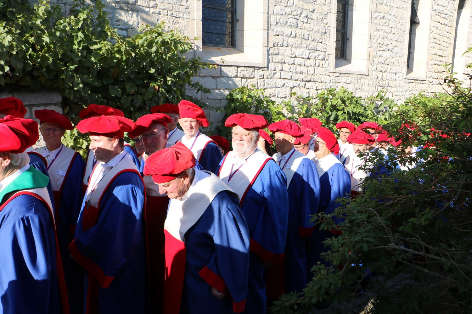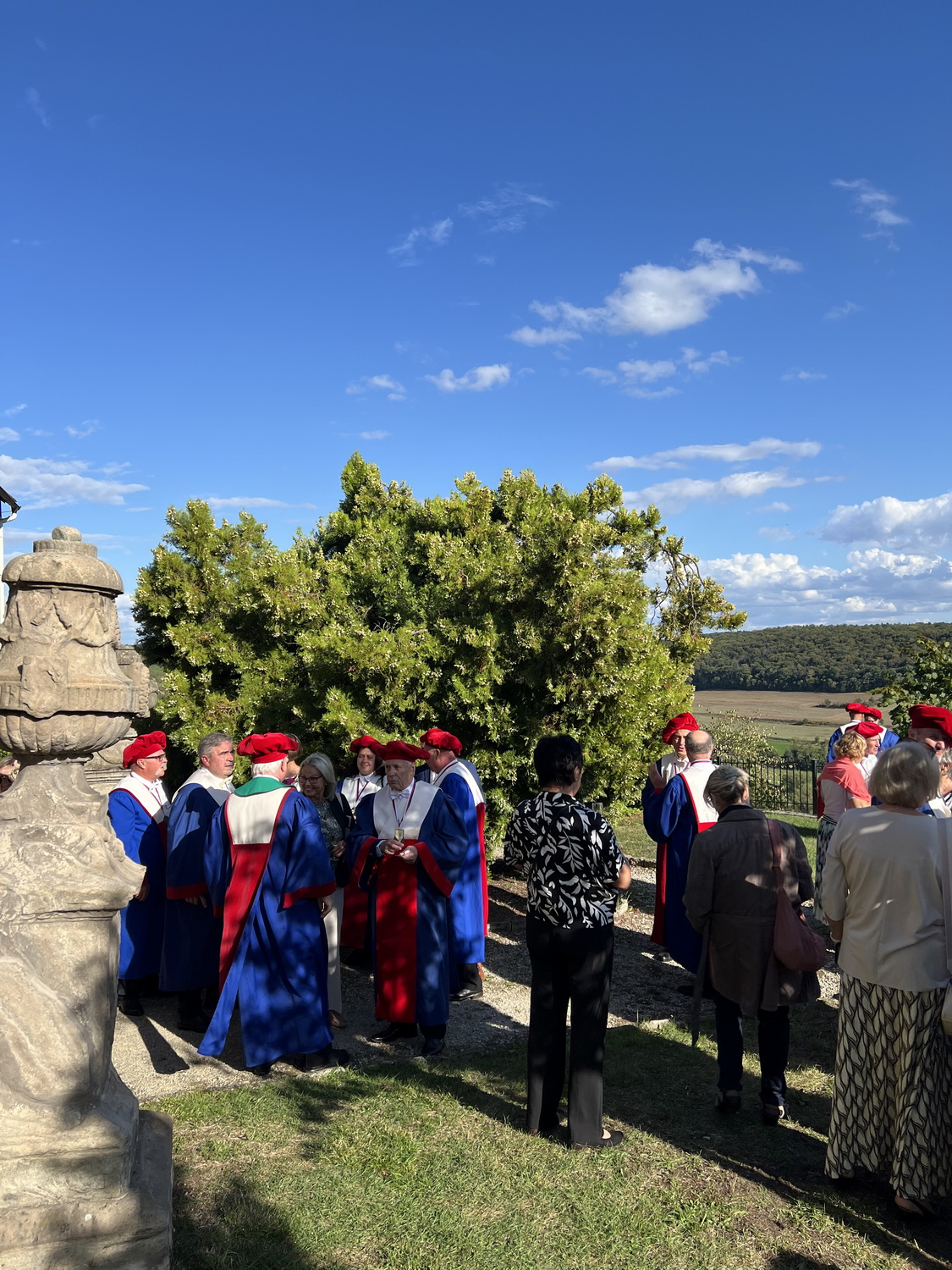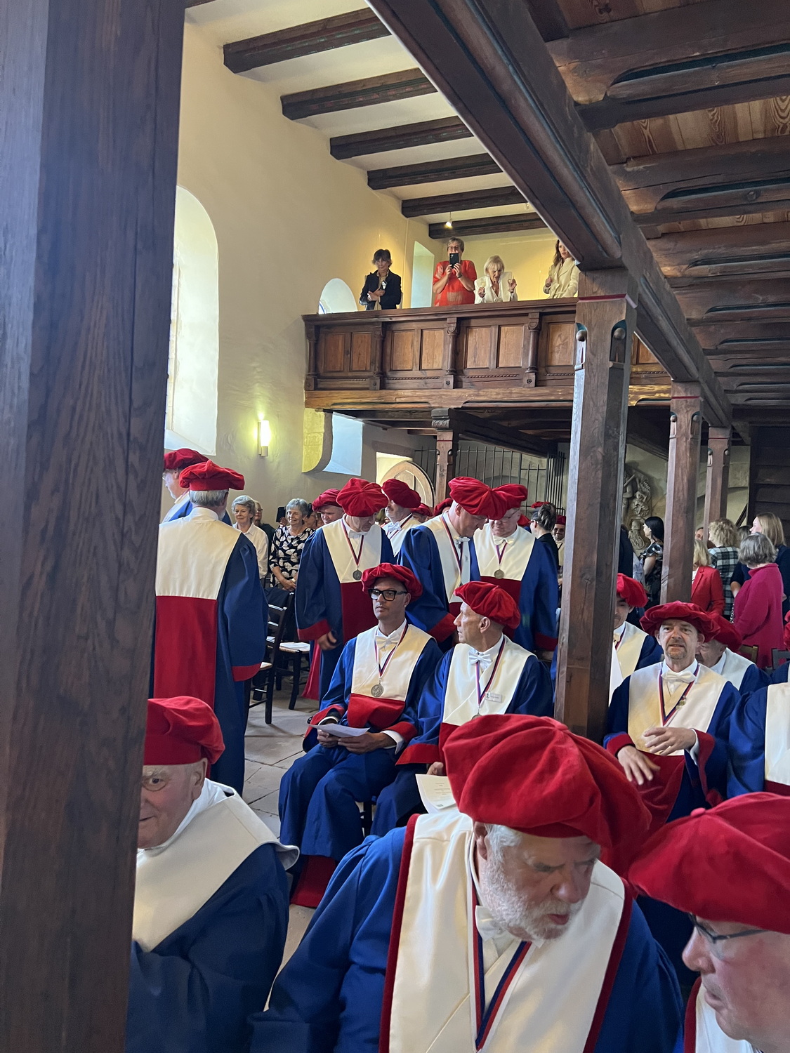 Um 17:30 Uhr zogen die Weinschwestern und Weinbrüder in die festlich geschmückte Klosterkirche ein. In dem ehrfurchtgebietenden Raum begann die feierliche Weihe der neuen Fahne, ein Moment von großer Bedeutung, der alle Anwesenden tief berührte. Die Zeremonie wurde von Bischof Dr. Johann Schneider und Prior Prof. Dr. Clemens Dölken mit großer Würde geleitet. Präzeptor Weinbruder Braun koordinierte den Ablauf und sorgte für eine harmonische und feierliche Zeremonie. Bischof Schneider eröffnete die Feier trinitarisch, bevor Prior Dölken mit warmen und tiefsinnigen Worten auf die Bedeutung dieses Tages einstimmte. Psalmgebet, Tagesgebet und eine besinnliche Ansprache erfüllten die Kirche mit einer ergreifenden Stille.