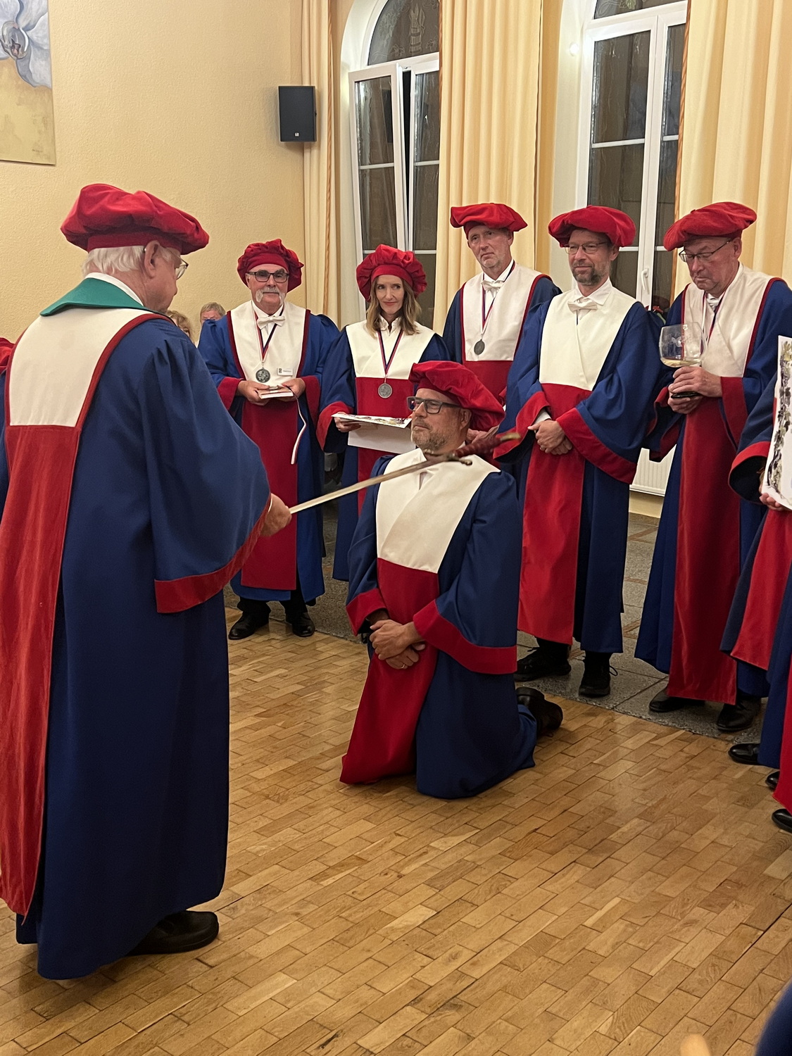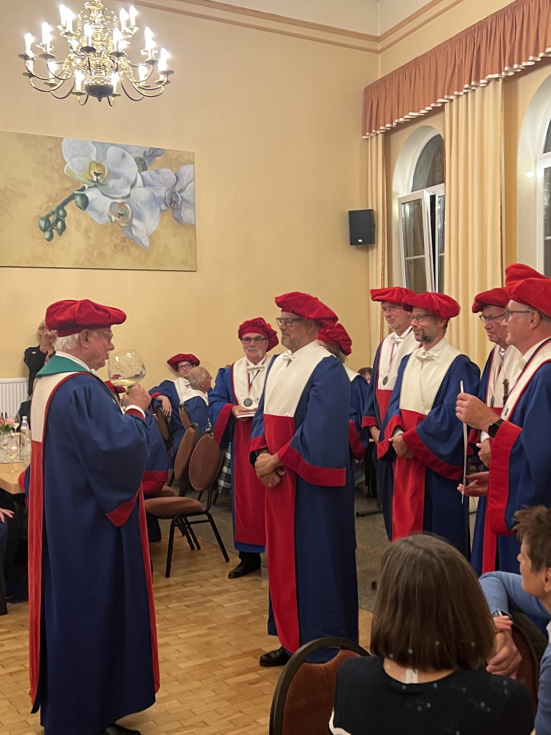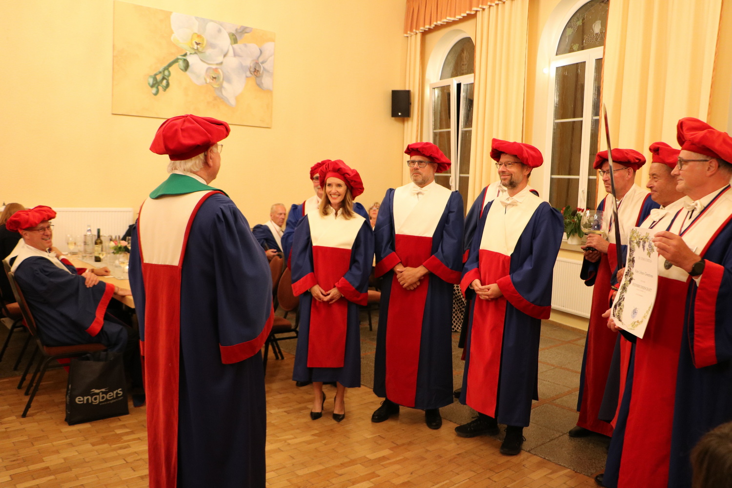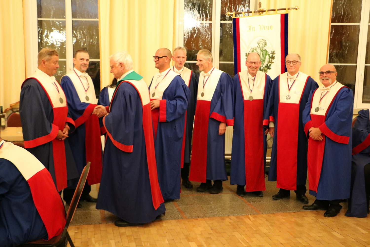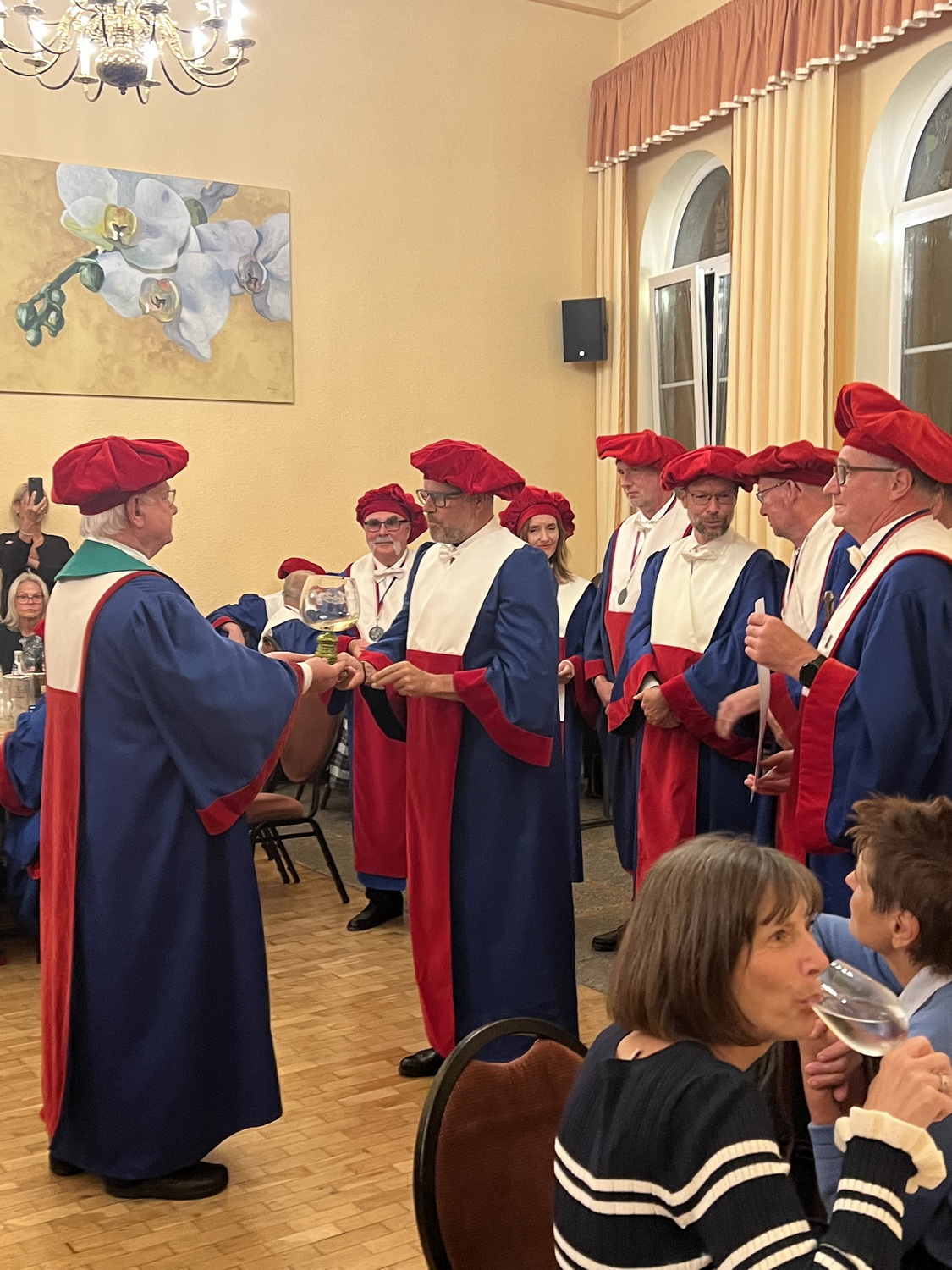 Jeder Anwärter stellte sich zunächst kurz vor und bestätigte seinen feierlichen Aufnahmeschwur. Danach erfolgte der symbolische Schwertschlag durch Ersten Bruderschaftsmeister Dieter Hanisch, ein Moment voller Geschichte und Bedeutung. Den Abschluss dieser besonderen Aufnahme bildete ein gemeinsamer Schluck Wein aus einem großen Glas, ein Zeichen echter Gemeinschaft. Anschließend erhielten die neuen Mitglieder ihre Bruderschaftsmedaille und die Aufnahmeurkunde. Ein Abend voller Genuss und Herzlichkeit. Beim gemeinsamen Abendessen hallten die Eindrücke des Tages noch lange nach. Gespräche erfüllten den Raum, mal bewegt, mal fröhlich, und oft erfüllt von Erinnerungen. Die anschließende Weinverkostung mit besonderen Weinen aus Rheinhessen, ausgewählt auf der Weinfahrt im Mai und vorgestellt von Kellermeister Andre Gussek, setzte einen genussvollen Schlusspunkt. Ein Tag, der in Erinnerung bleibt.