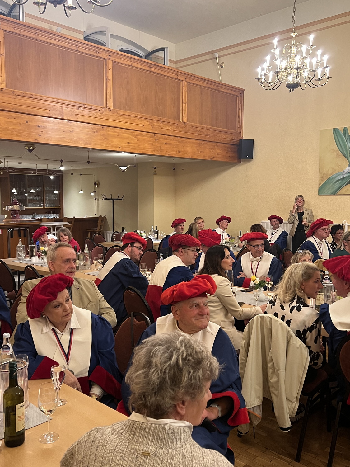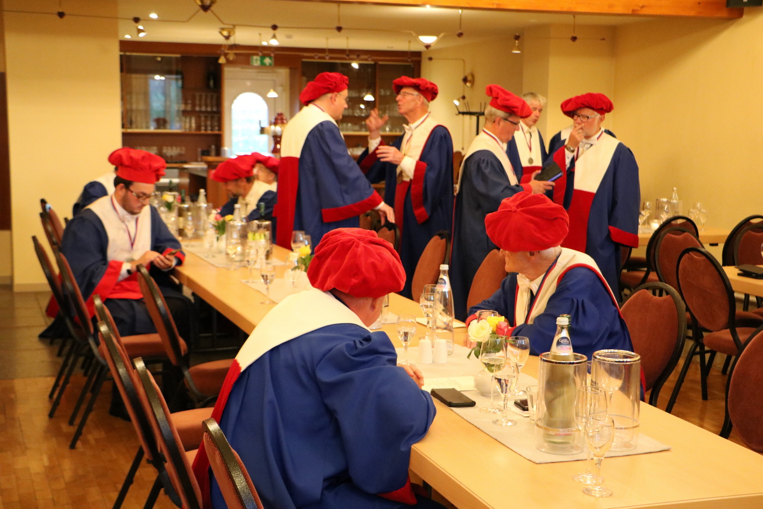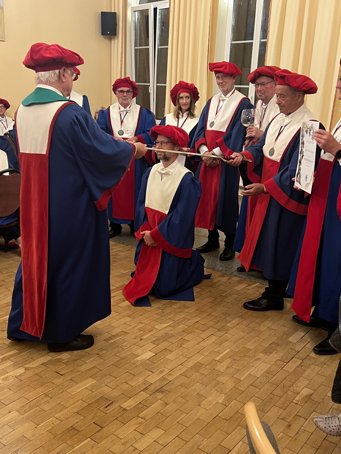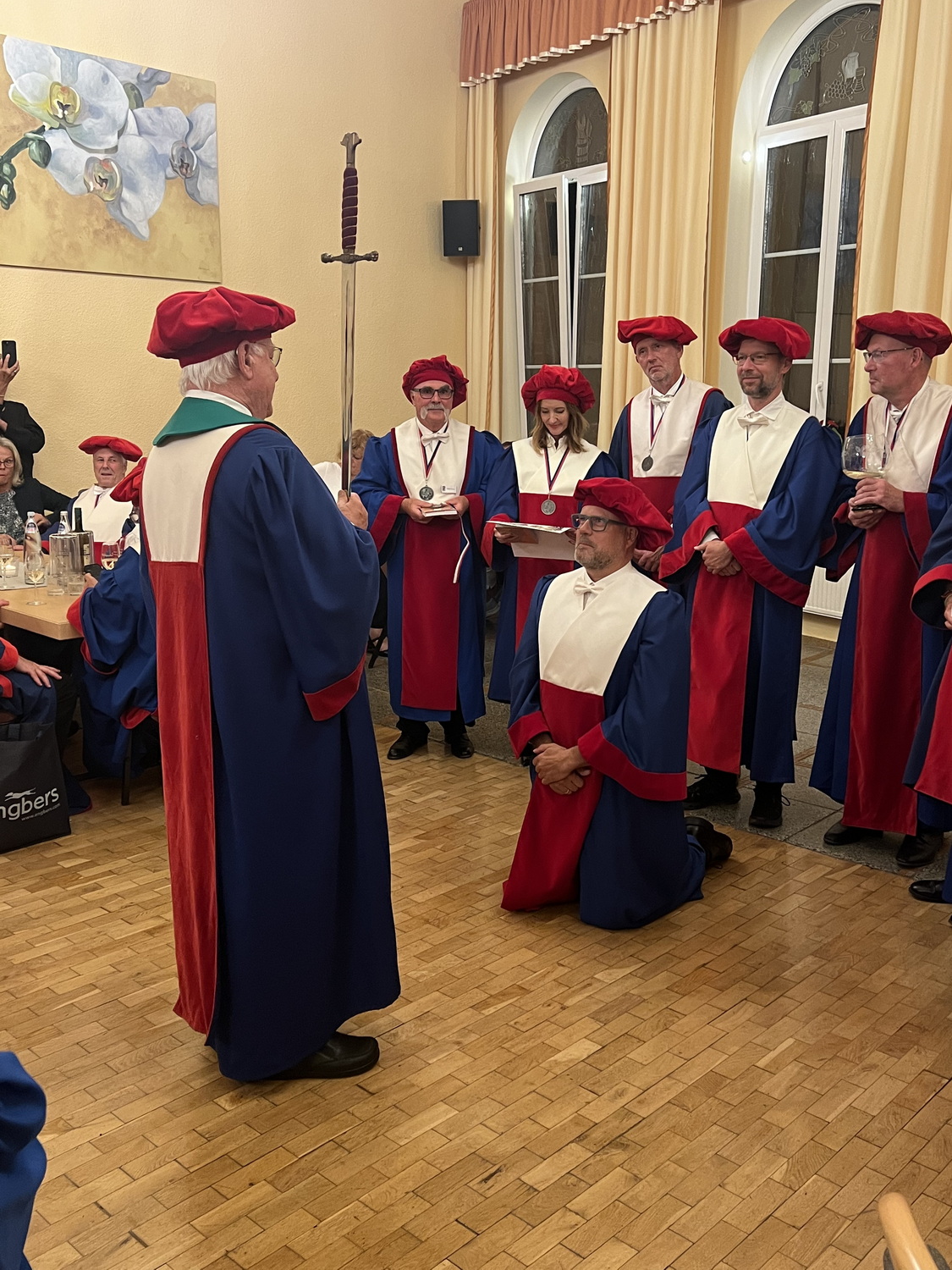 Jeder Anwärter stellte sich zunächst kurz vor und bestätigte seinen feierlichen Aufnahmeschwur. Danach erfolgte der symbolische Schwertschlag durch Ersten Bruderschaftsmeister Dieter Hanisch, ein Moment voller Geschichte und Bedeutung. Den Abschluss dieser besonderen Aufnahme bildete ein gemeinsamer Schluck Wein aus einem großen Glas, ein Zeichen echter Gemeinschaft. Anschließend erhielten die neuen Mitglieder ihre Bruderschaftsmedaille und die Aufnahmeurkunde. Ein Abend voller Genuss und Herzlichkeit. Beim gemeinsamen Abendessen hallten die Eindrücke des Tages noch lange nach. Gespräche erfüllten den Raum, mal bewegt, mal fröhlich, und oft erfüllt von Erinnerungen. Die anschließende Weinverkostung mit besonderen Weinen aus Rheinhessen, ausgewählt auf der Weinfahrt im Mai und vorgestellt von Kellermeister Andre Gussek, setzte einen genussvollen Schlusspunkt. Ein Tag, der in Erinnerung bleibt.