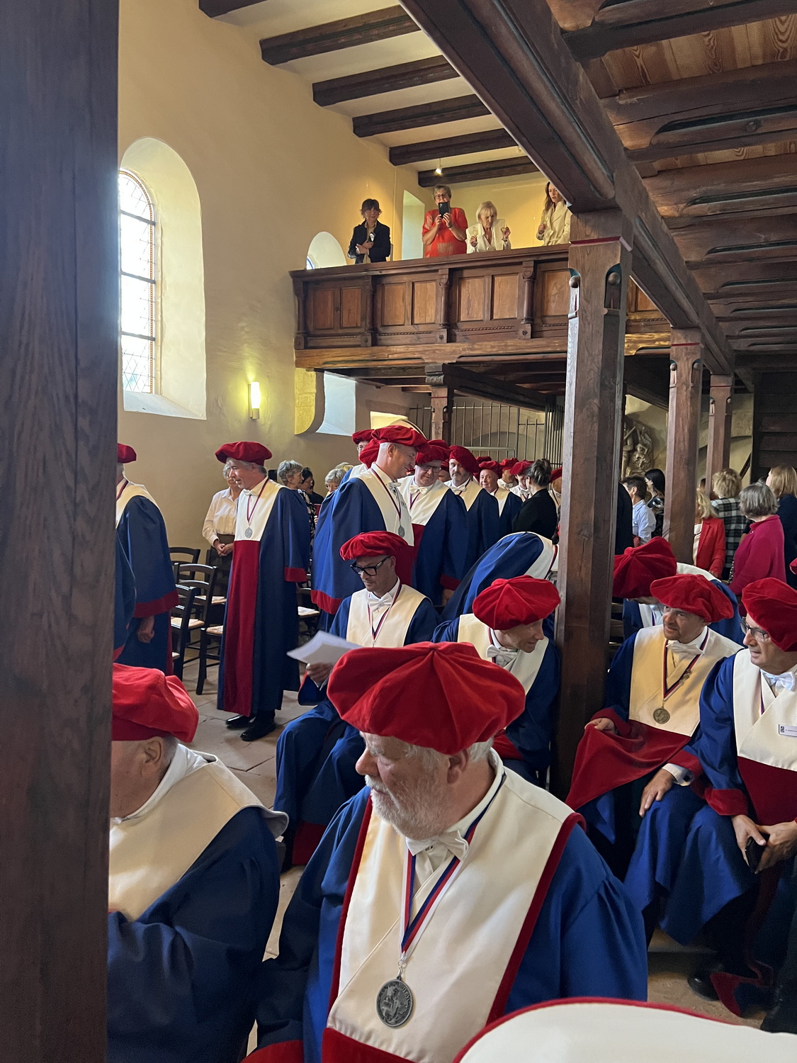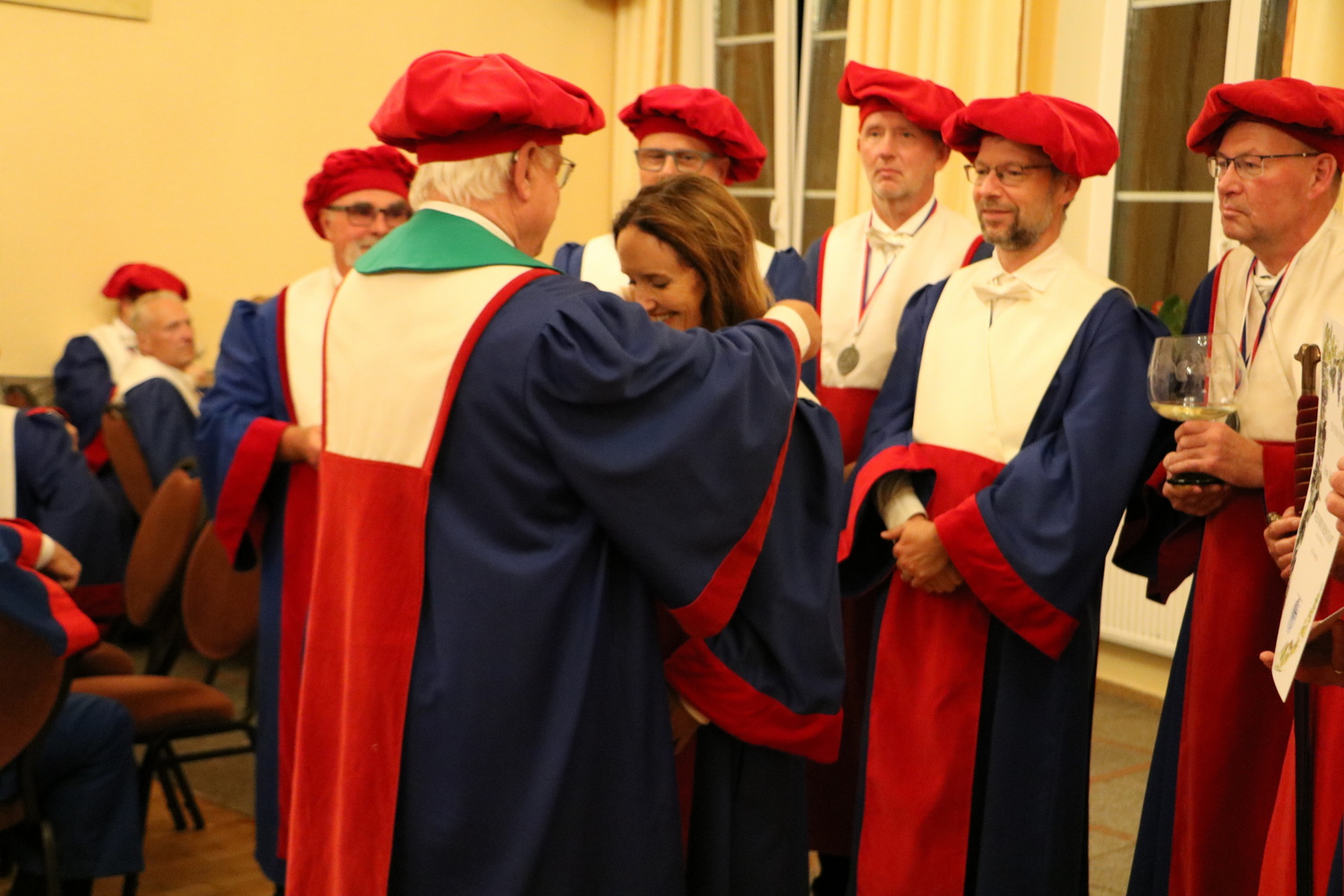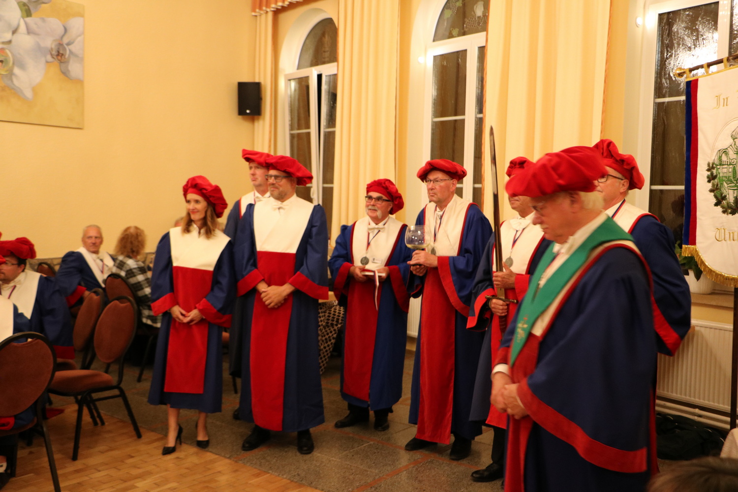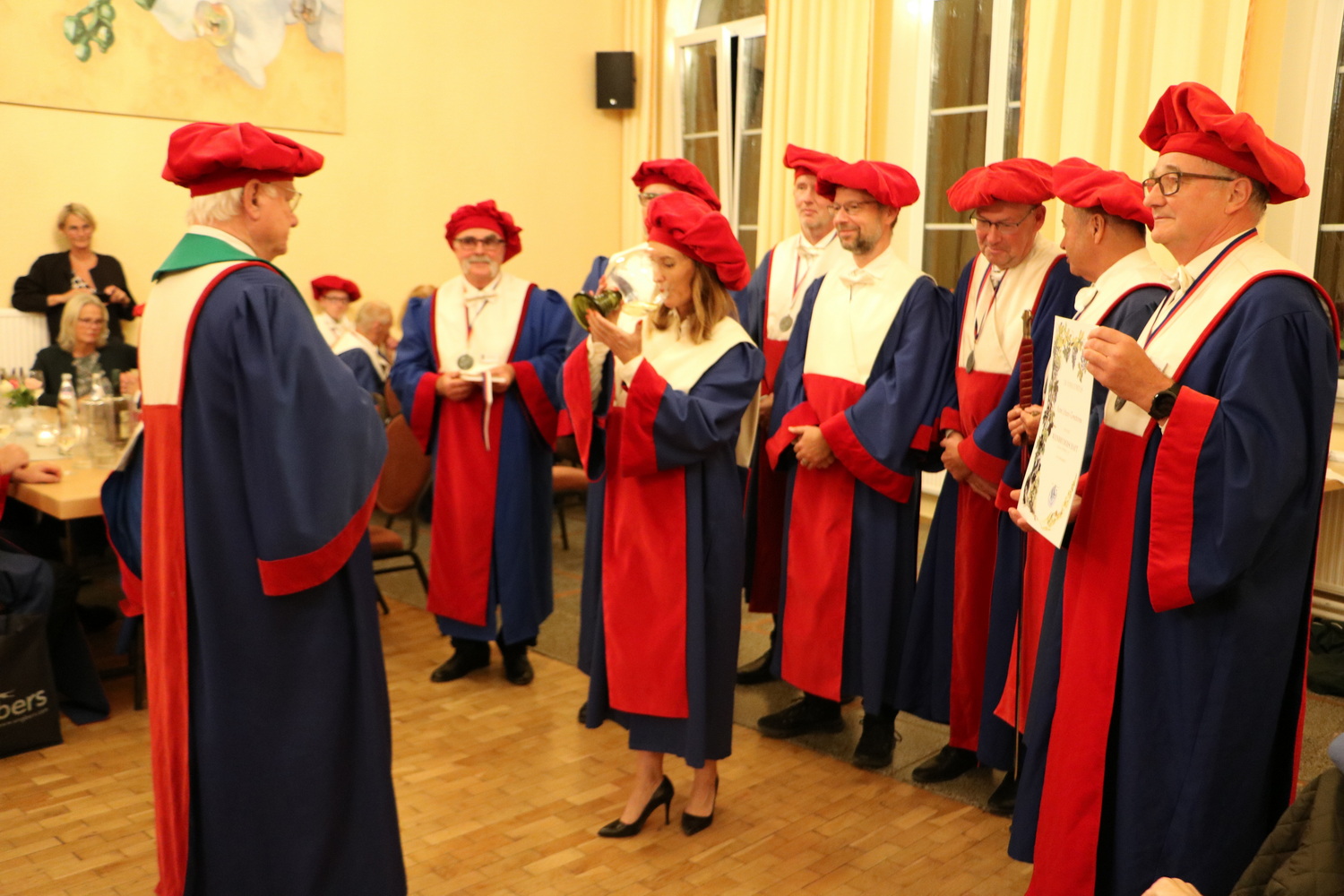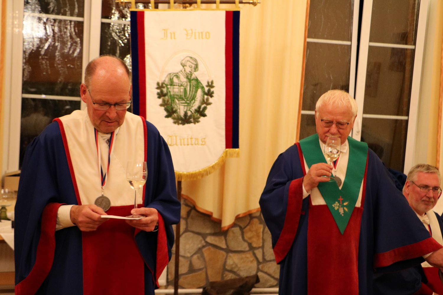 Jeder Anwärter stellte sich zunächst kurz vor und bestätigte seinen feierlichen Aufnahmeschwur. Danach erfolgte der symbolische Schwertschlag durch Ersten Bruderschaftsmeister Dieter Hanisch, ein Moment voller Geschichte und Bedeutung. Den Abschluss dieser besonderen Aufnahme bildete ein gemeinsamer Schluck Wein aus einem großen Glas, ein Zeichen echter Gemeinschaft. Anschließend erhielten die neuen Mitglieder ihre Bruderschaftsmedaille und die Aufnahmeurkunde. Ein Abend voller Genuss und Herzlichkeit. Beim gemeinsamen Abendessen hallten die Eindrücke des Tages noch lange nach. Gespräche erfüllten den Raum, mal bewegt, mal fröhlich, und oft erfüllt von Erinnerungen. Die anschließende Weinverkostung mit besonderen Weinen aus Rheinhessen, ausgewählt auf der Weinfahrt im Mai und vorgestellt von Kellermeister Andre Gussek, setzte einen genussvollen Schlusspunkt. Ein Tag, der in Erinnerung bleibt.