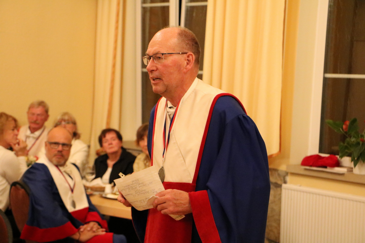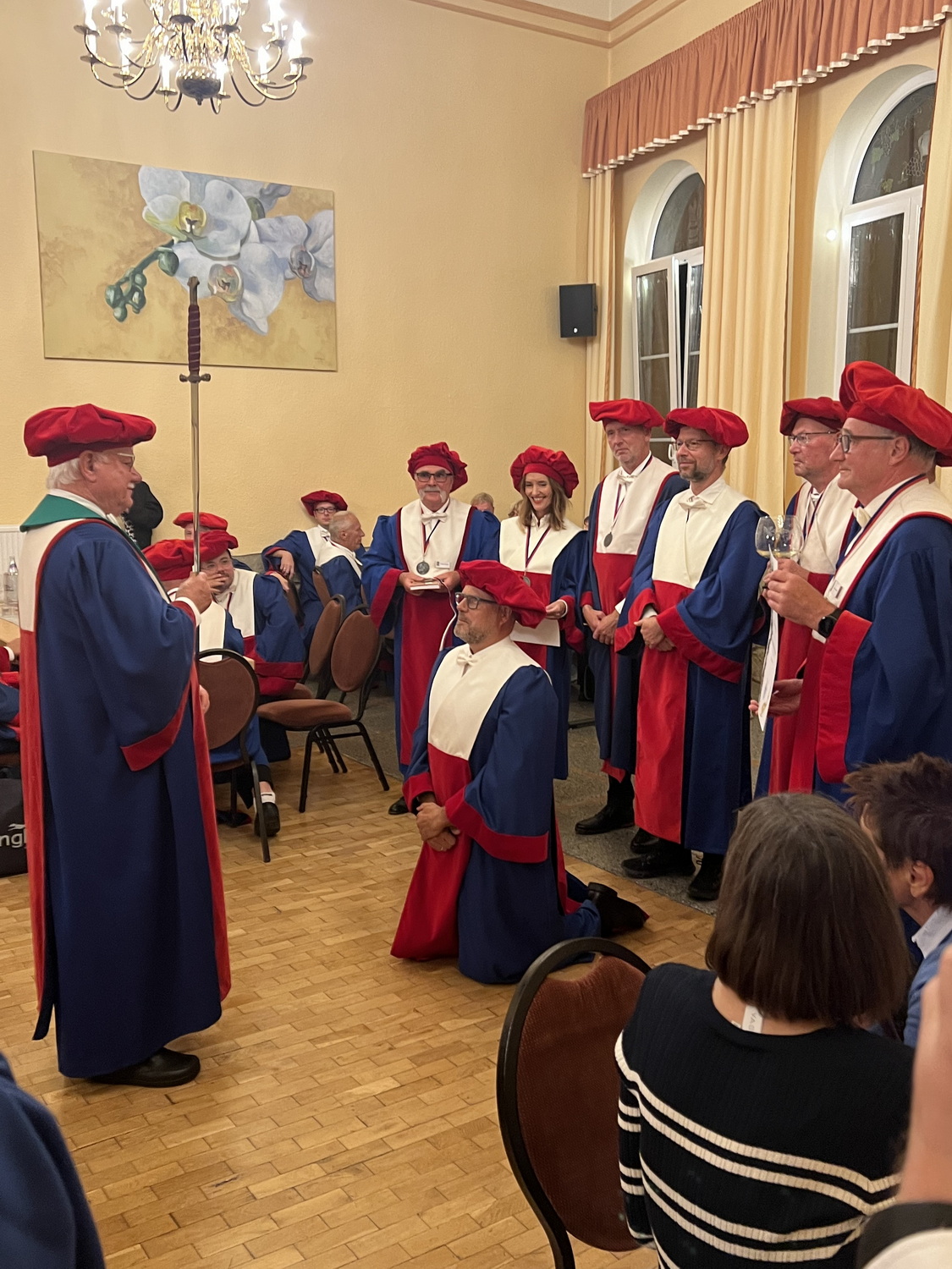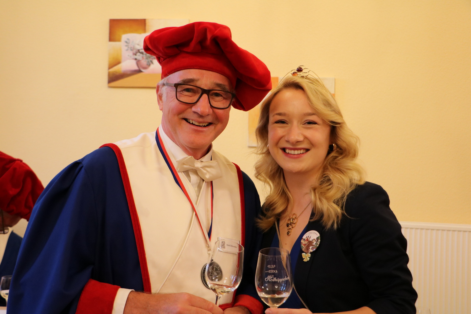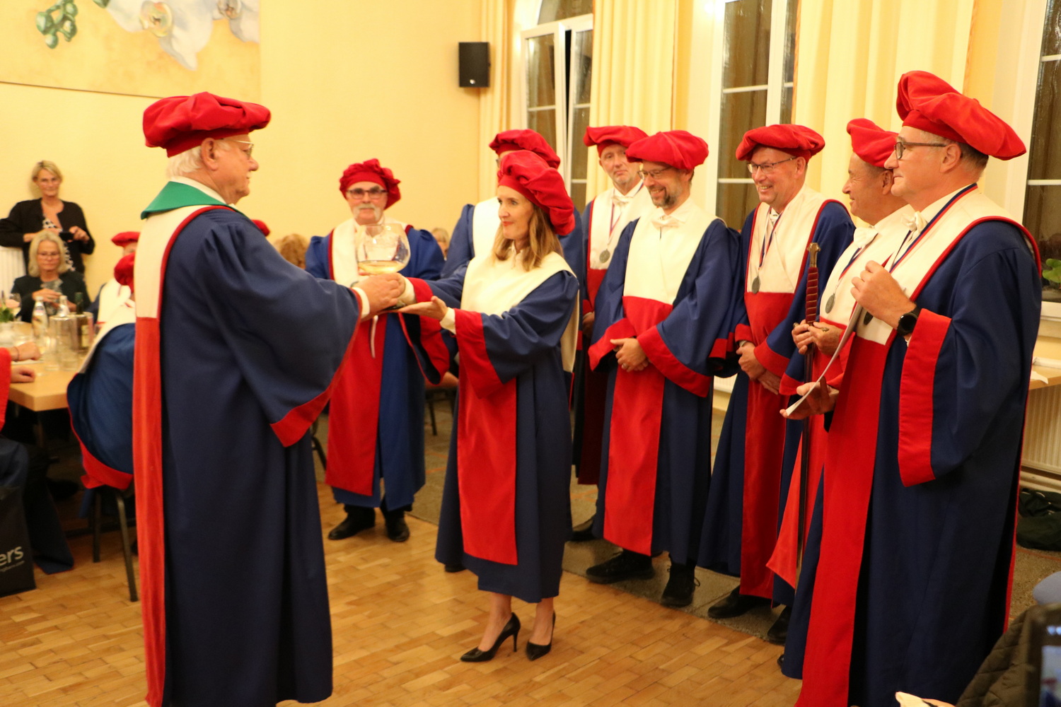 Jeder Anwärter stellte sich zunächst kurz vor und bestätigte seinen feierlichen Aufnahmeschwur. Danach erfolgte der symbolische Schwertschlag durch Ersten Bruderschaftsmeister Dieter Hanisch, ein Moment voller Geschichte und Bedeutung. Den Abschluss dieser besonderen Aufnahme bildete ein gemeinsamer Schluck Wein aus einem großen Glas, ein Zeichen echter Gemeinschaft. Anschließend erhielten die neuen Mitglieder ihre Bruderschaftsmedaille und die Aufnahmeurkunde. Ein Abend voller Genuss und Herzlichkeit. Beim gemeinsamen Abendessen hallten die Eindrücke des Tages noch lange nach. Gespräche erfüllten den Raum, mal bewegt, mal fröhlich, und oft erfüllt von Erinnerungen. Die anschließende Weinverkostung mit besonderen Weinen aus Rheinhessen, ausgewählt auf der Weinfahrt im Mai und vorgestellt von Kellermeister Andre Gussek, setzte einen genussvollen Schlusspunkt. Ein Tag, der in Erinnerung bleibt.