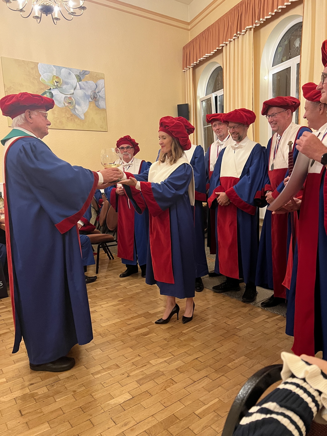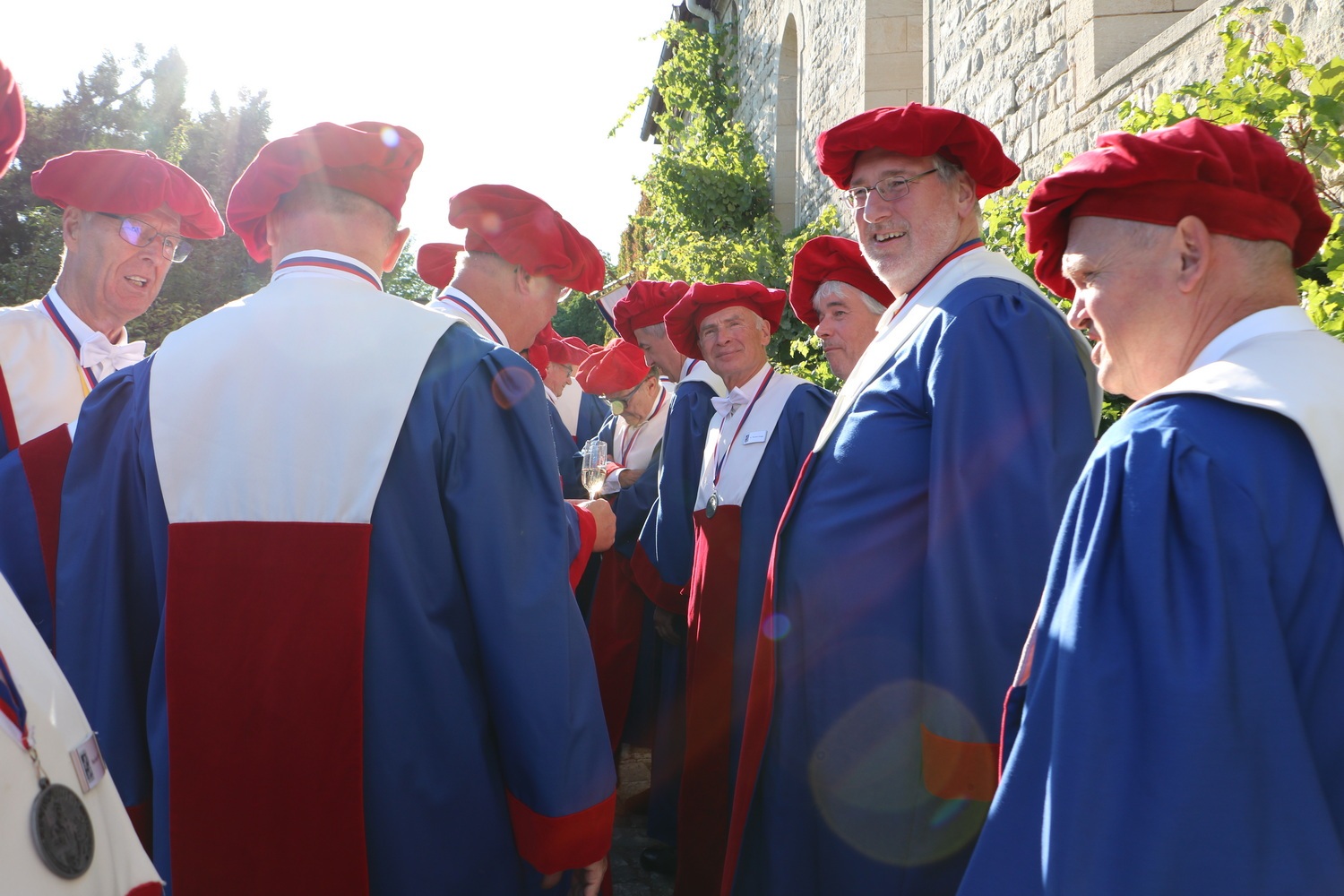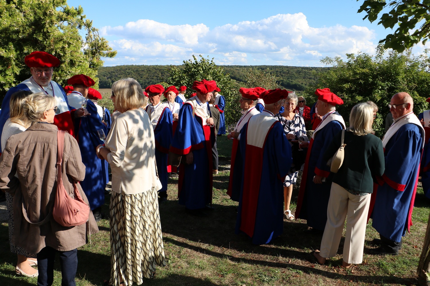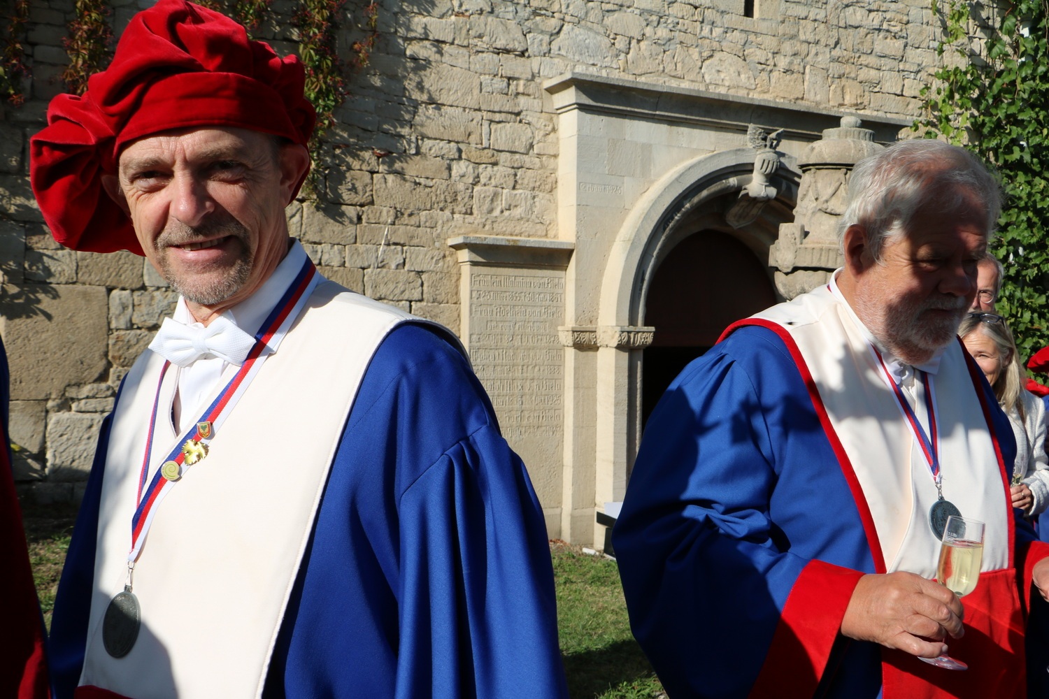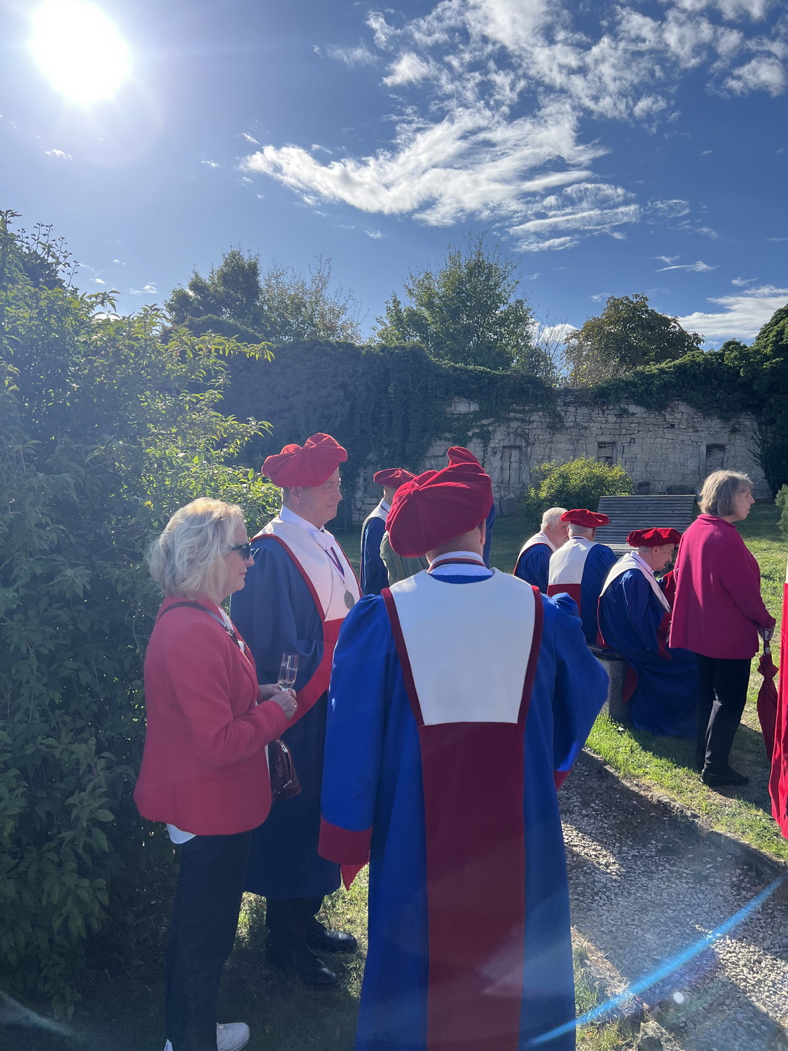 Jeder Anwärter stellte sich zunächst kurz vor und bestätigte seinen feierlichen Aufnahmeschwur. Danach erfolgte der symbolische Schwertschlag durch Ersten Bruderschaftsmeister Dieter Hanisch, ein Moment voller Geschichte und Bedeutung. Den Abschluss dieser besonderen Aufnahme bildete ein gemeinsamer Schluck Wein aus einem großen Glas, ein Zeichen echter Gemeinschaft. Anschließend erhielten die neuen Mitglieder ihre Bruderschaftsmedaille und die Aufnahmeurkunde. Ein Abend voller Genuss und Herzlichkeit. Beim gemeinsamen Abendessen hallten die Eindrücke des Tages noch lange nach. Gespräche erfüllten den Raum, mal bewegt, mal fröhlich, und oft erfüllt von Erinnerungen. Die anschließende Weinverkostung mit besonderen Weinen aus Rheinhessen, ausgewählt auf der Weinfahrt im Mai und vorgestellt von Kellermeister Andre Gussek, setzte einen genussvollen Schlusspunkt. Ein Tag, der in Erinnerung bleibt.
