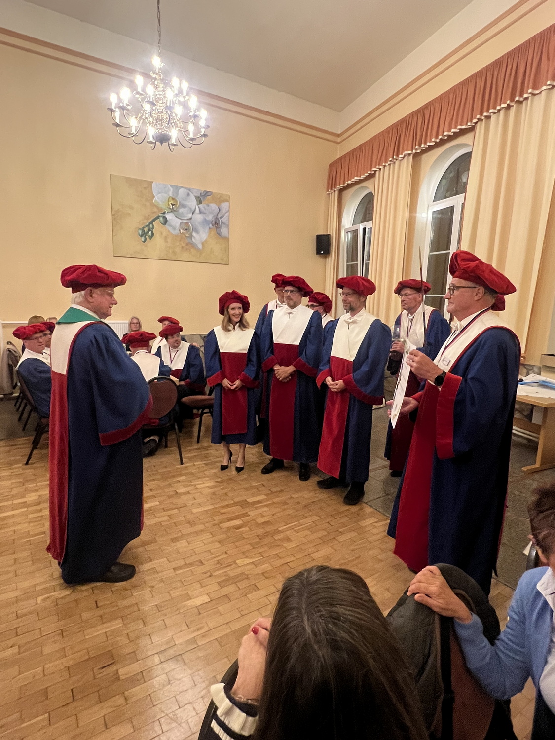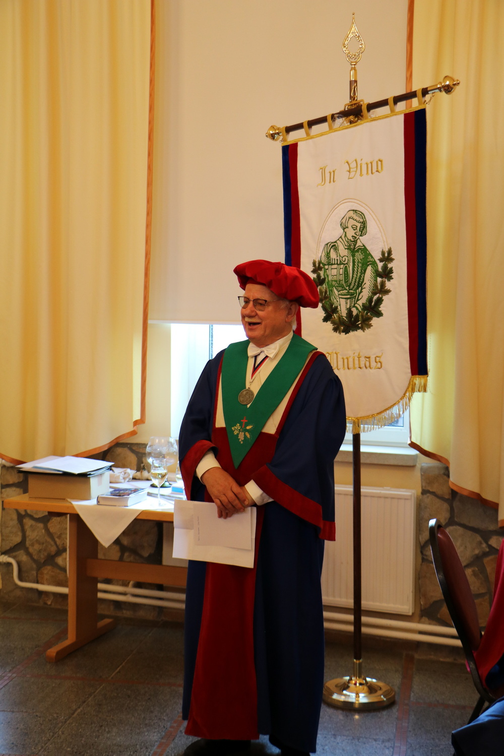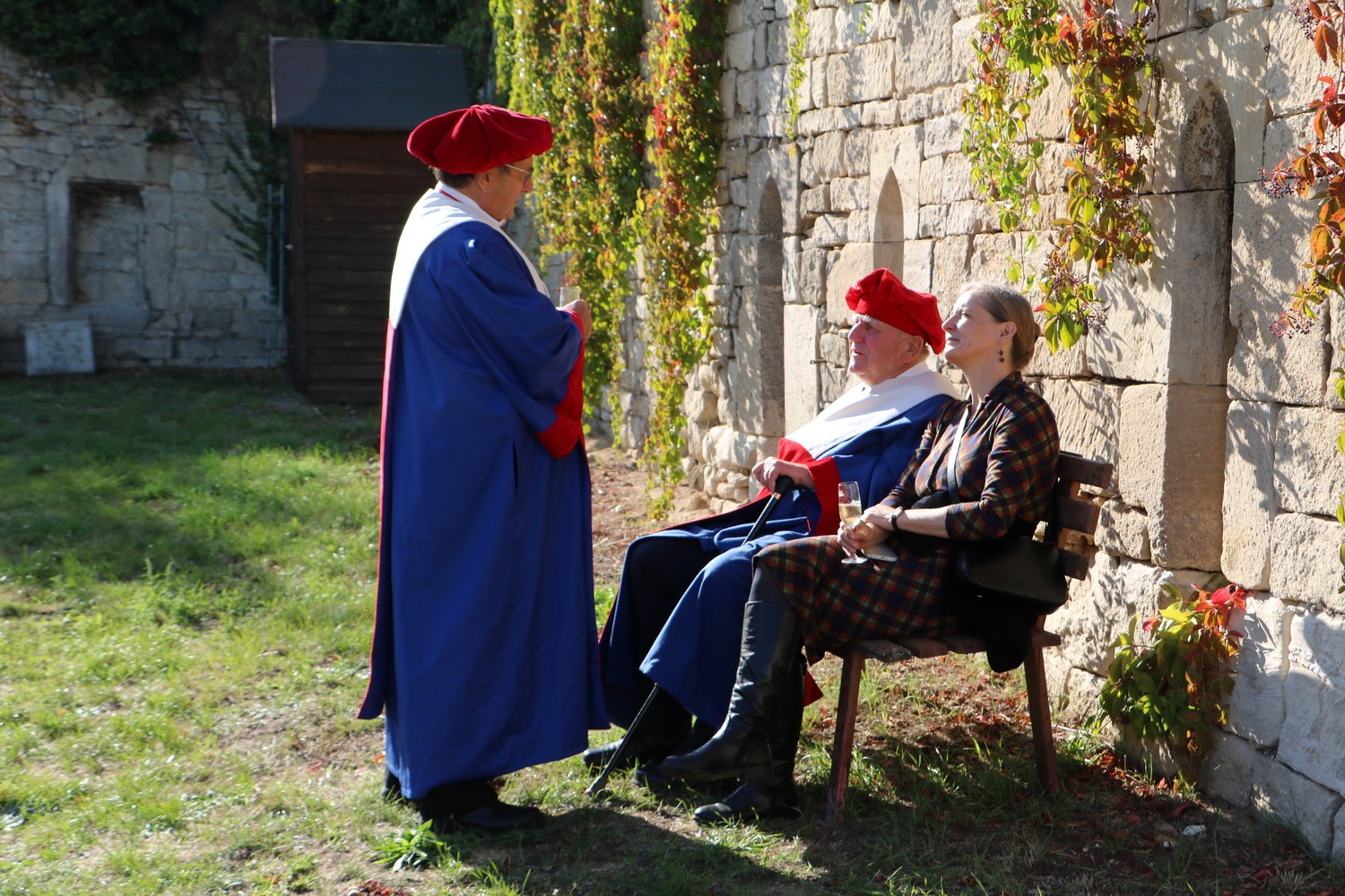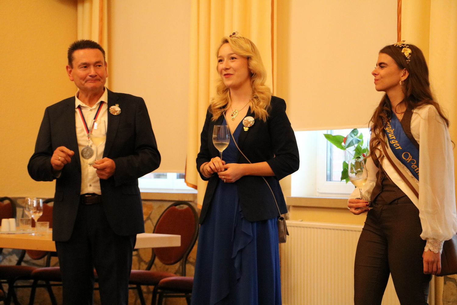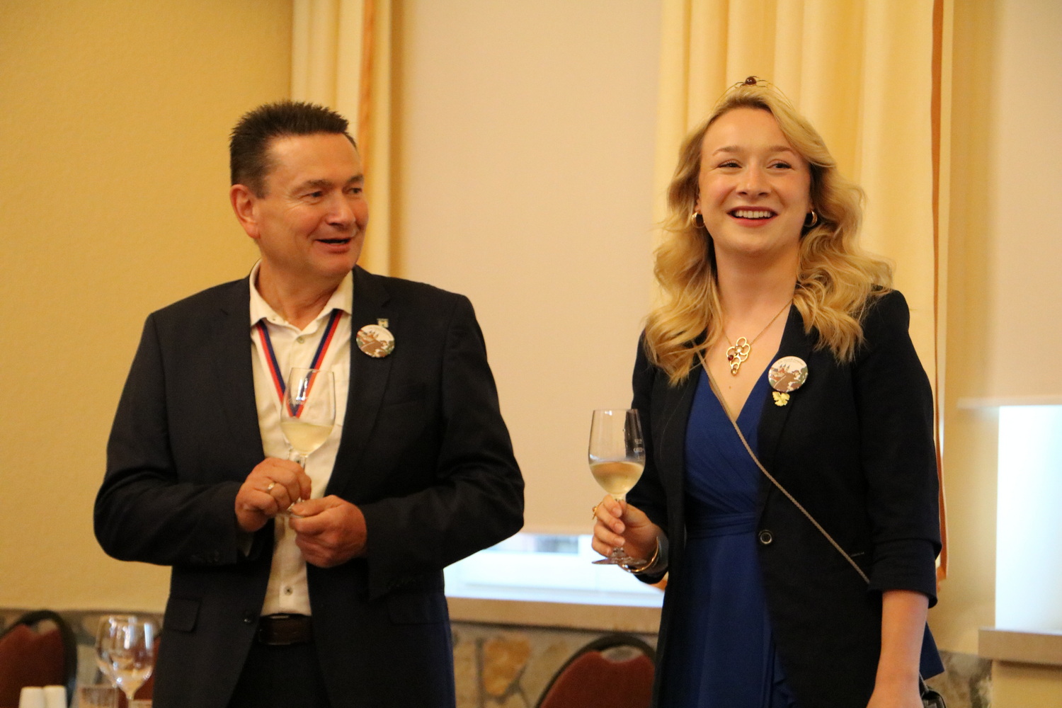 Jeder Anwärter stellte sich zunächst kurz vor und bestätigte seinen feierlichen Aufnahmeschwur. Danach erfolgte der symbolische Schwertschlag durch Ersten Bruderschaftsmeister Dieter Hanisch, ein Moment voller Geschichte und Bedeutung. Den Abschluss dieser besonderen Aufnahme bildete ein gemeinsamer Schluck Wein aus einem großen Glas, ein Zeichen echter Gemeinschaft. Anschließend erhielten die neuen Mitglieder ihre Bruderschaftsmedaille und die Aufnahmeurkunde. Ein Abend voller Genuss und Herzlichkeit. Beim gemeinsamen Abendessen hallten die Eindrücke des Tages noch lange nach. Gespräche erfüllten den Raum, mal bewegt, mal fröhlich, und oft erfüllt von Erinnerungen. Die anschließende Weinverkostung mit besonderen Weinen aus Rheinhessen, ausgewählt auf der Weinfahrt im Mai und vorgestellt von Kellermeister Andre Gussek, setzte einen genussvollen Schlusspunkt. Ein Tag, der in Erinnerung bleibt.