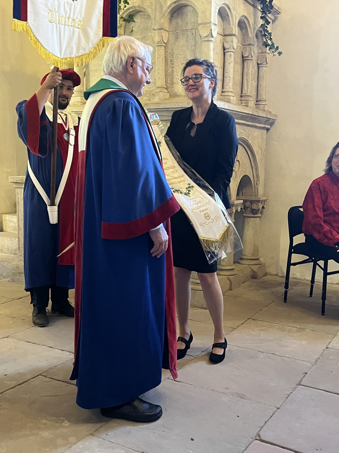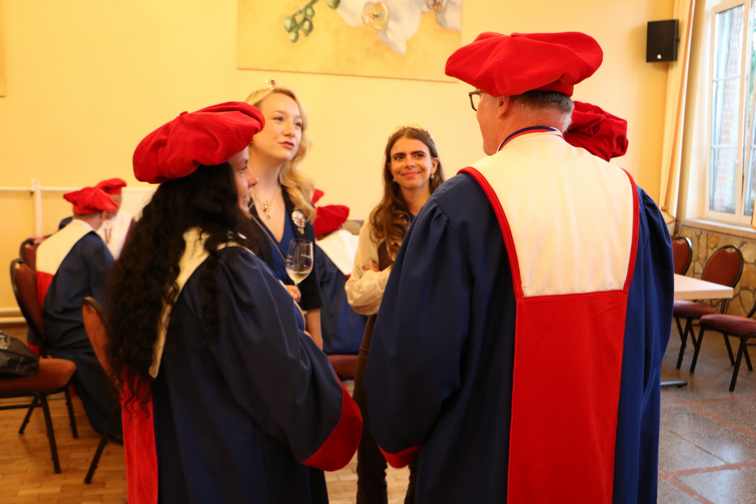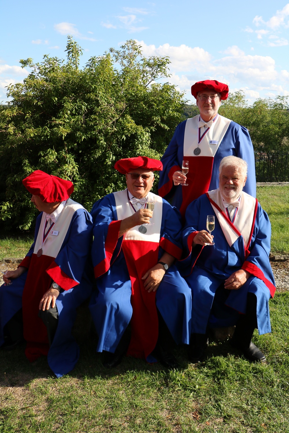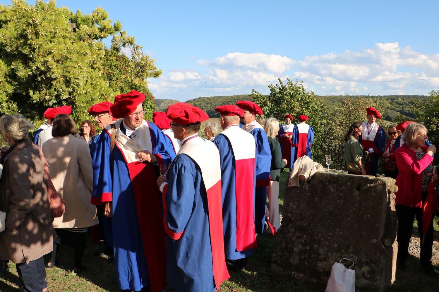 Jeder Anwärter stellte sich zunächst kurz vor und bestätigte seinen feierlichen Aufnahmeschwur. Danach erfolgte der symbolische Schwertschlag durch Ersten Bruderschaftsmeister Dieter Hanisch, ein Moment voller Geschichte und Bedeutung. Den Abschluss dieser besonderen Aufnahme bildete ein gemeinsamer Schluck Wein aus einem großen Glas, ein Zeichen echter Gemeinschaft. Anschließend erhielten die neuen Mitglieder ihre Bruderschaftsmedaille und die Aufnahmeurkunde. Ein Abend voller Genuss und Herzlichkeit. Beim gemeinsamen Abendessen hallten die Eindrücke des Tages noch lange nach. Gespräche erfüllten den Raum, mal bewegt, mal fröhlich, und oft erfüllt von Erinnerungen. Die anschließende Weinverkostung mit besonderen Weinen aus Rheinhessen, ausgewählt auf der Weinfahrt im Mai und vorgestellt von Kellermeister Andre Gussek, setzte einen genussvollen Schlusspunkt. Ein Tag, der in Erinnerung bleibt.