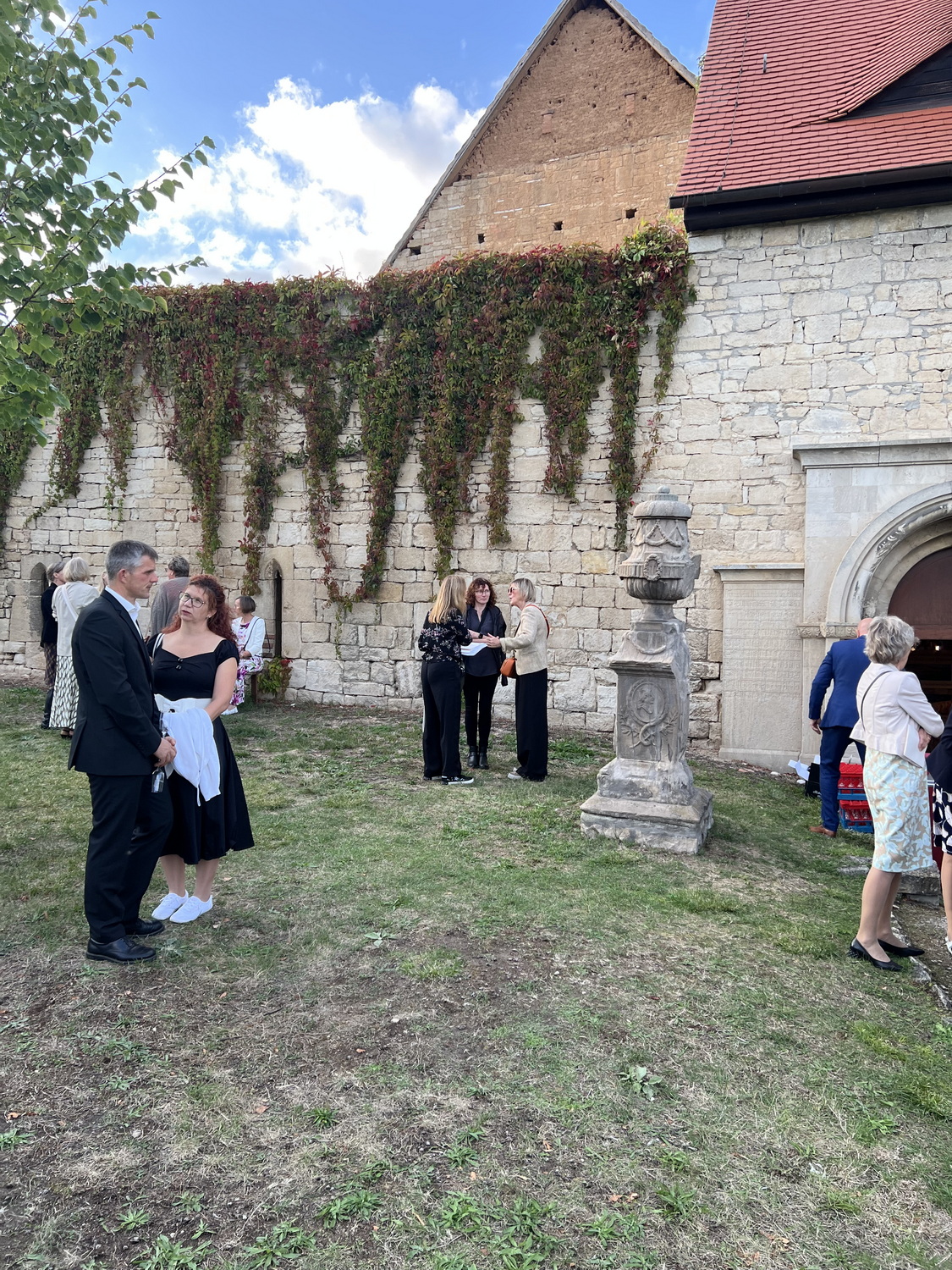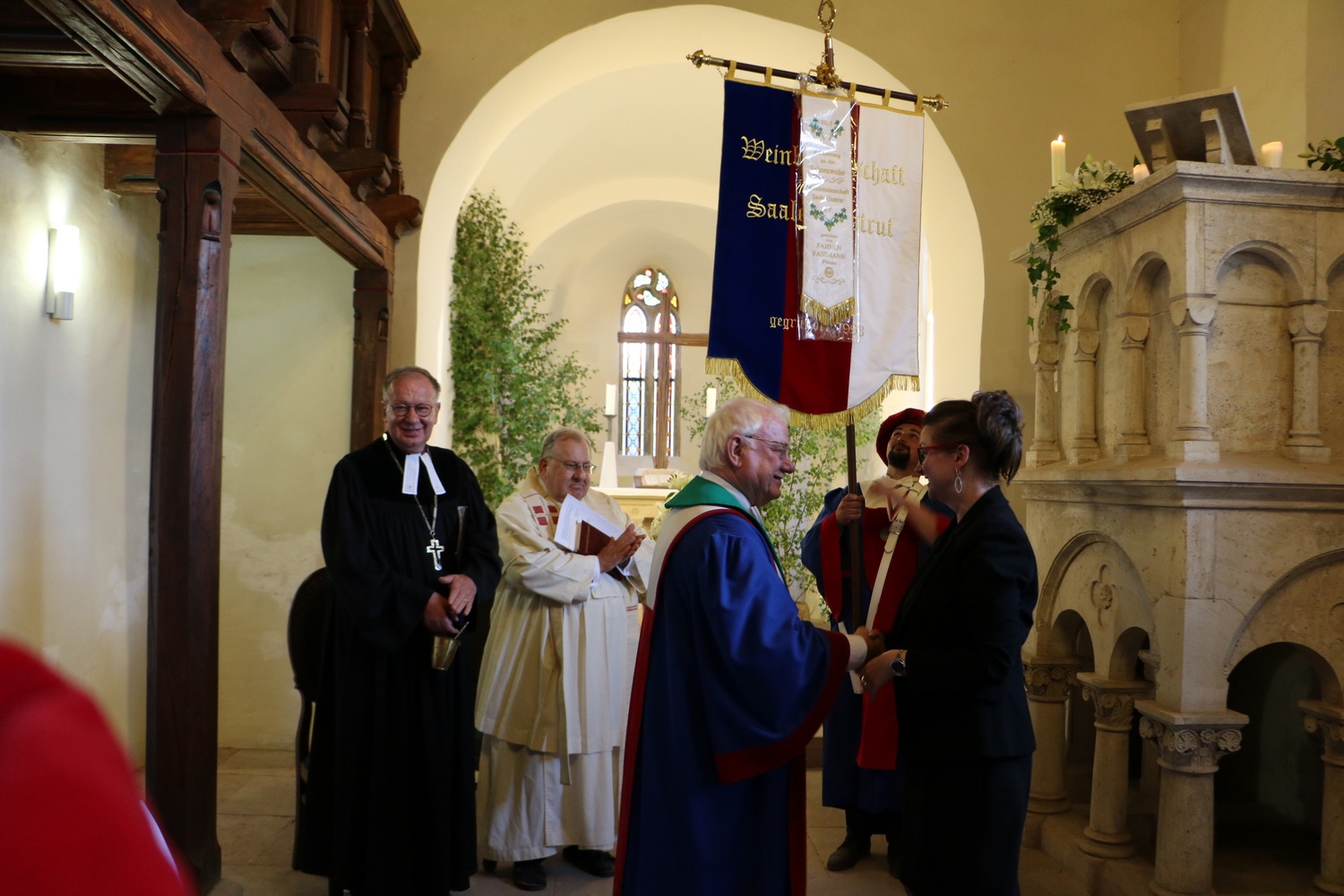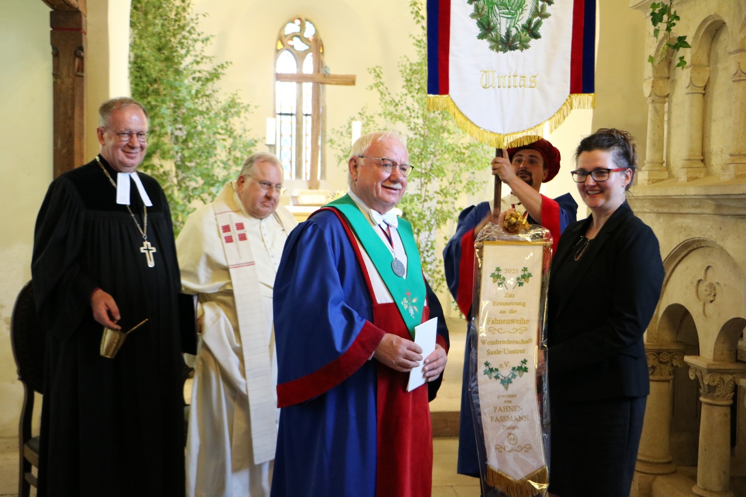 Es war ein später Sommernachmittag, als die Weinbruderschaft Saale-Unstrut e.V. am 12. September 2025 zusammenkam, ein Tag, der sich schon beim ersten Schritt in das Tal nach Zscheiplitz wie ein besonderer Moment anfühlte. Die ehrwürdige Klosterkirche erhob sich still über den Weinbergen, und wer an diesem Nachmittag eintraf, spürte sofort, dass heute ein Stück Bruderschaftsgeschichte geschrieben werden würde. Ein Beginn voller Begegnungen. Bereits um 16:30 Uhr füllte sich der Vorplatz der Kirche mit Stimmen, Lachen und lebhaften Begrüßungen. Beim Sektempfang klirrten die Gläser, während Weinschwestern und Weinbrüder wie alte Freunde aufeinander zugingen. Bekannte Gesichter strahlten, neue Mitglieder und Begleitungen fühlten sich sofort willkommen, und eine Atmosphäre von Herzlichkeit, Gemeinschaft und gespannter Vorfreude lag über dem Platz. Als die Stellprobe zur Fahnenweihe begann, glitt die gesellige Stimmung sanft in feierliche Konzentration hinüber, und der Übergang in den Einzug in die Kirche vollzog sich wie ein kleines Ritual, ruhig, würdevoll und getragen vom Gefühl, Teil eines besonderen Tages zu sein. Die Weihe der neuen Vereinsfahne.