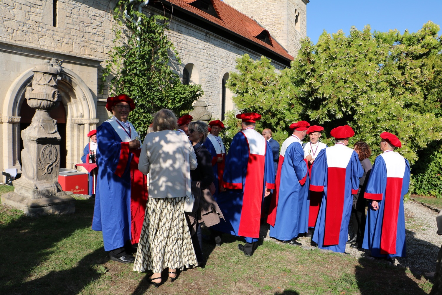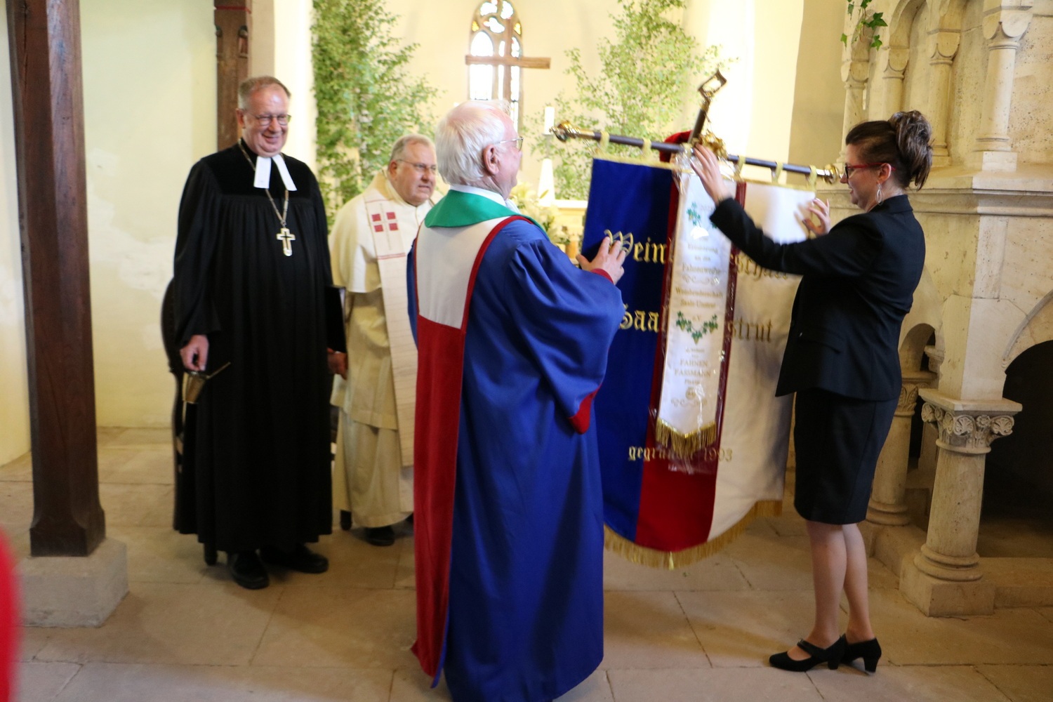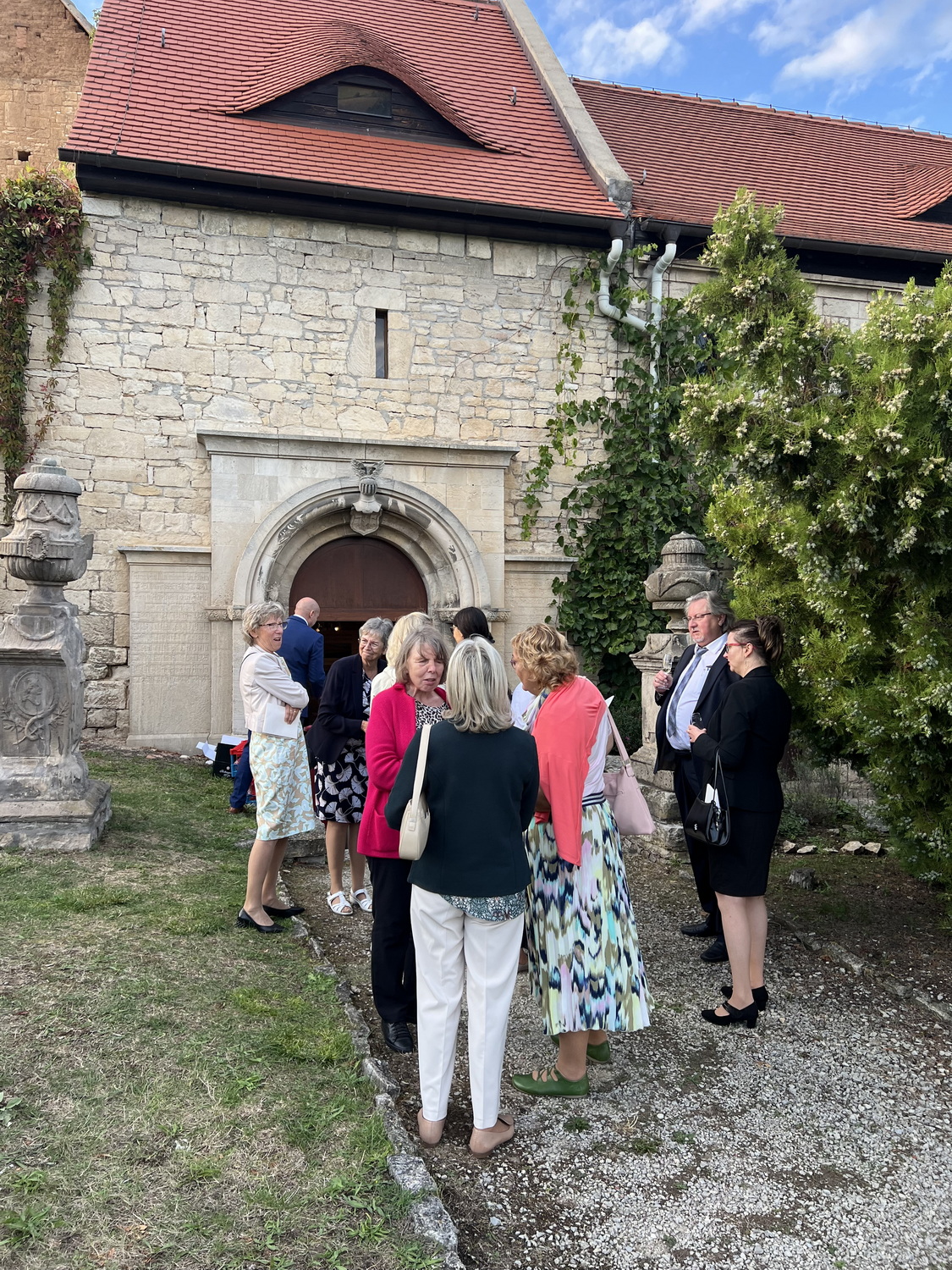 Es war ein später Sommernachmittag, als die Weinbruderschaft Saale-Unstrut e.V. am 12. September 2025 zusammenkam, ein Tag, der sich schon beim ersten Schritt in das Tal nach Zscheiplitz wie ein besonderer Moment anfühlte. Die ehrwürdige Klosterkirche erhob sich still über den Weinbergen, und wer an diesem Nachmittag eintraf, spürte sofort, dass heute ein Stück Bruderschaftsgeschichte geschrieben werden würde. Ein Beginn voller Begegnungen. Bereits um 16:30 Uhr füllte sich der Vorplatz der Kirche mit Stimmen, Lachen und lebhaften Begrüßungen. Beim Sektempfang klirrten die Gläser, während Weinschwestern und Weinbrüder wie alte Freunde aufeinander zugingen. Bekannte Gesichter strahlten, neue Mitglieder und Begleitungen fühlten sich sofort willkommen, und eine Atmosphäre von Herzlichkeit, Gemeinschaft und gespannter Vorfreude lag über dem Platz. Als die Stellprobe zur Fahnenweihe begann, glitt die gesellige Stimmung sanft in feierliche Konzentration hinüber, und der Übergang in den Einzug in die Kirche vollzog sich wie ein kleines Ritual, ruhig, würdevoll und getragen vom Gefühl, Teil eines besonderen Tages zu sein. Die Weihe der neuen Vereinsfahne.
