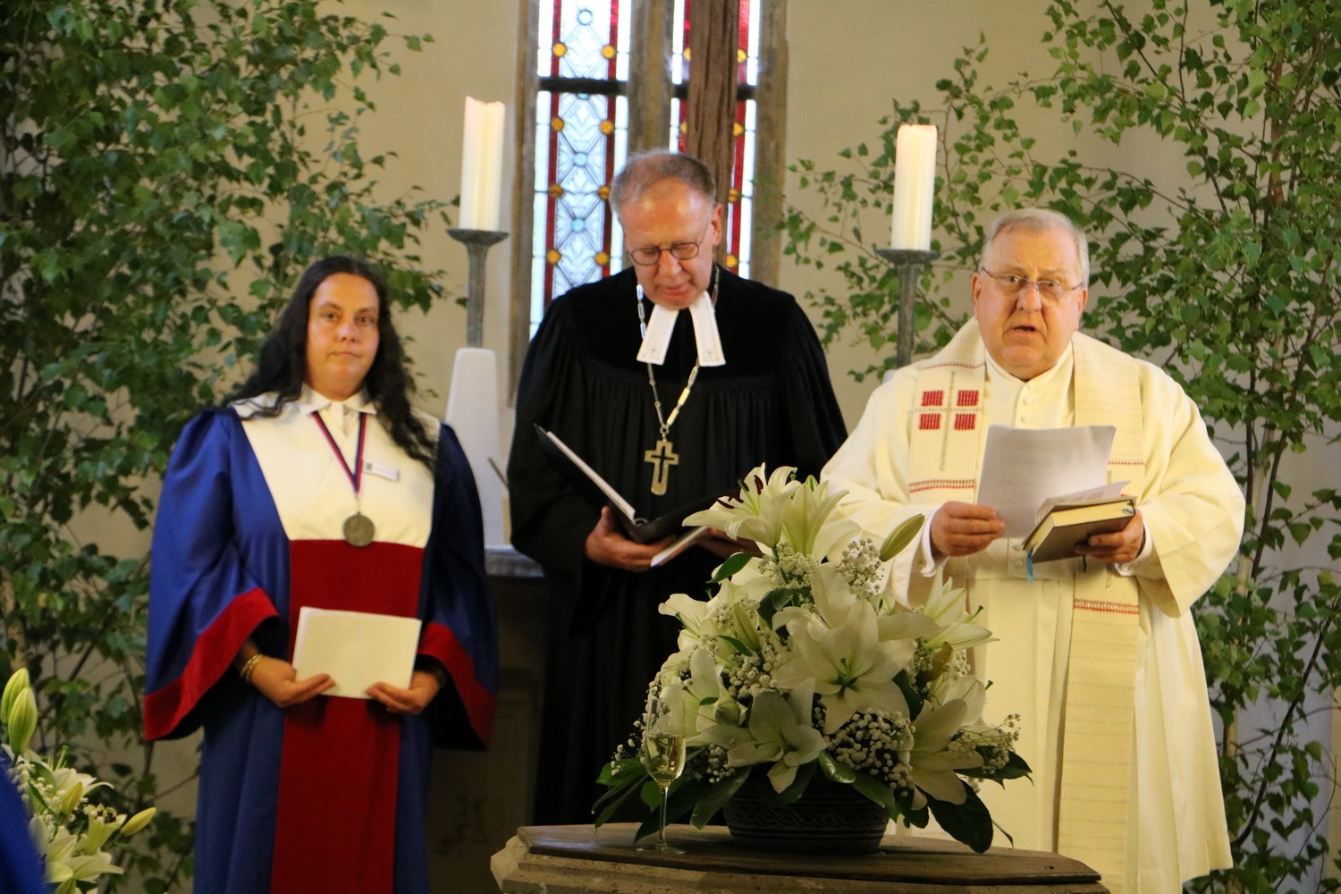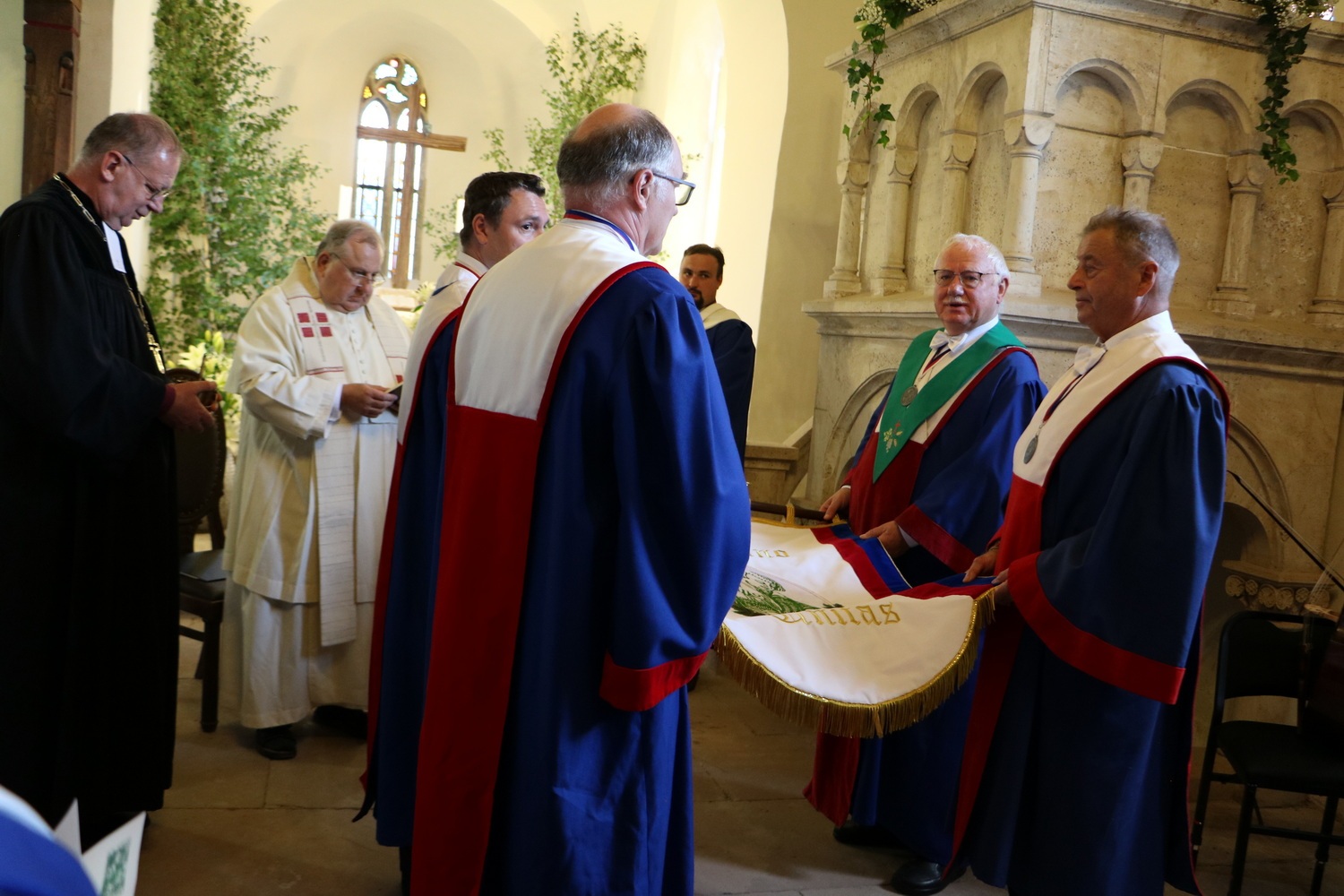 Dann kam der Höhepunkt, die Segnung der neuen Vereinsfahne. Bruderschaftsmeister Dieter Hanisch, Prior Clemens Dölken und die Weinbrüder Jörgen Bretschneider, Dirk Schmutzler und Alexander Plep sprachen gemeinsam den Fahnenschwur. Und als die gesamte Bruderschaft den Ruf „IN VINO UNITAS“ erhob, halte er kraftvoll durch das Kirchenschiff und ließ einen Moment echter Verbundenheit entstehen. Mit den gemeinsamen Fürbitten von Weinschwester Jacqueline Kreisel, Bischof Schneider und Prior Dölken, dem Vaterunser und dem Segen endete die Weihe so würdevoll, wie sie begonnen hatte.