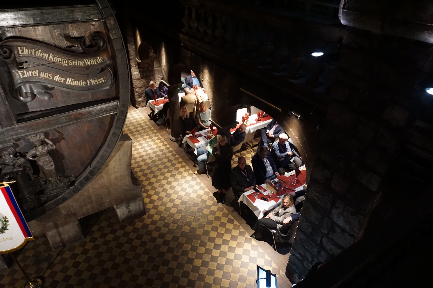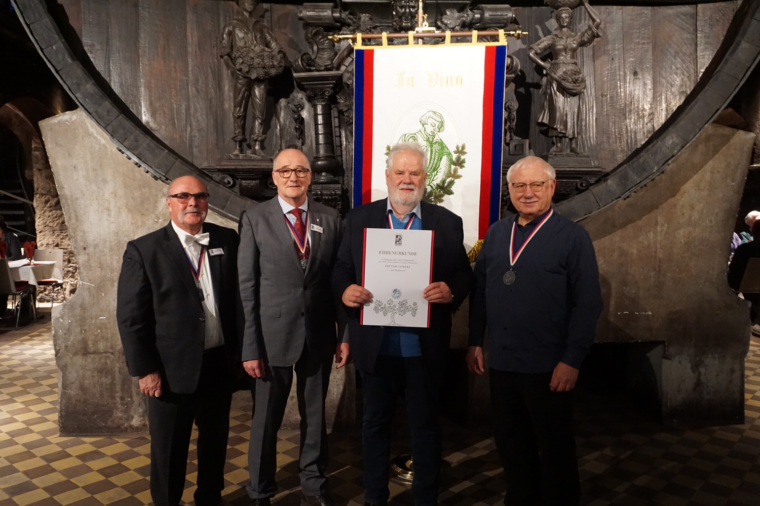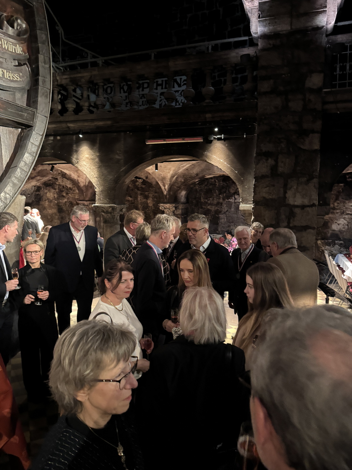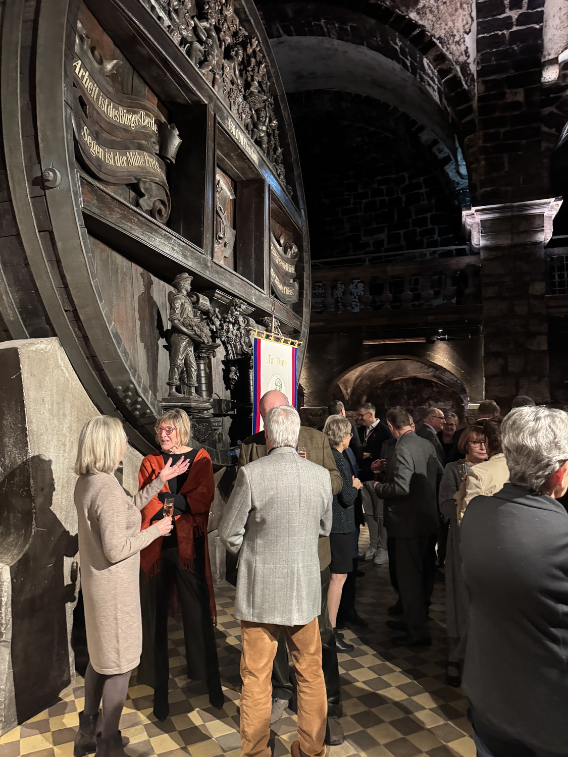 Die Feier fand im beeindruckenden Domkeller der Sektkellerei statt, in dessen historischem Gewölbe das größte Cuvéefass Deutschlands steht und vor dem die Fahne der Bruderschaft aufgestellt war.