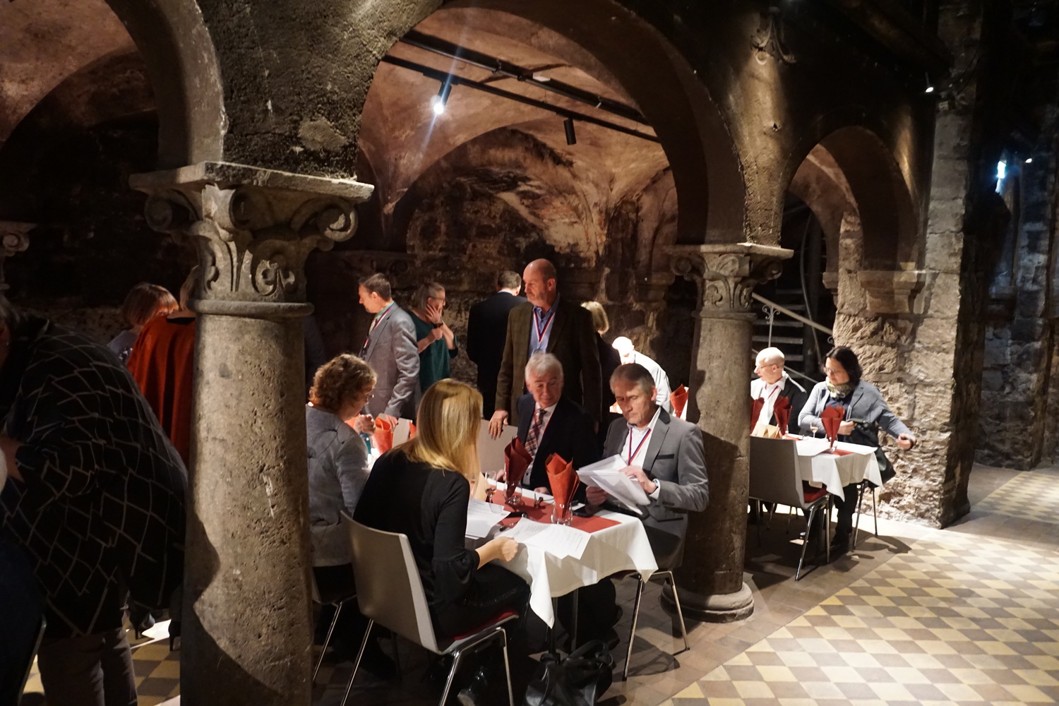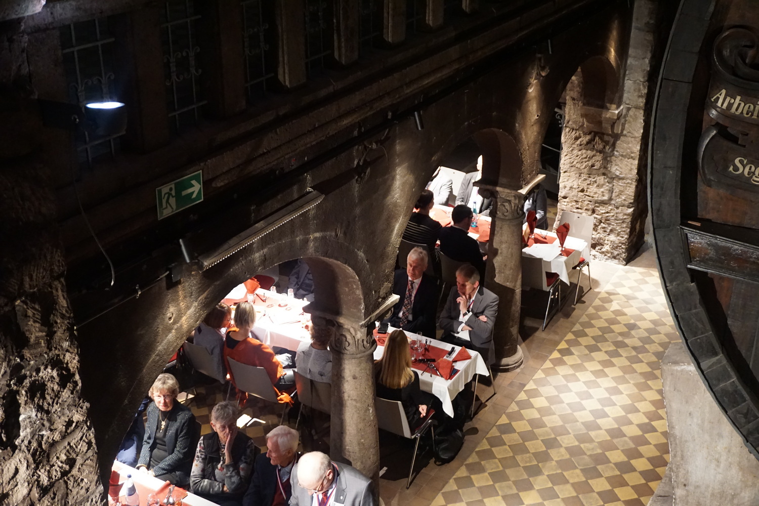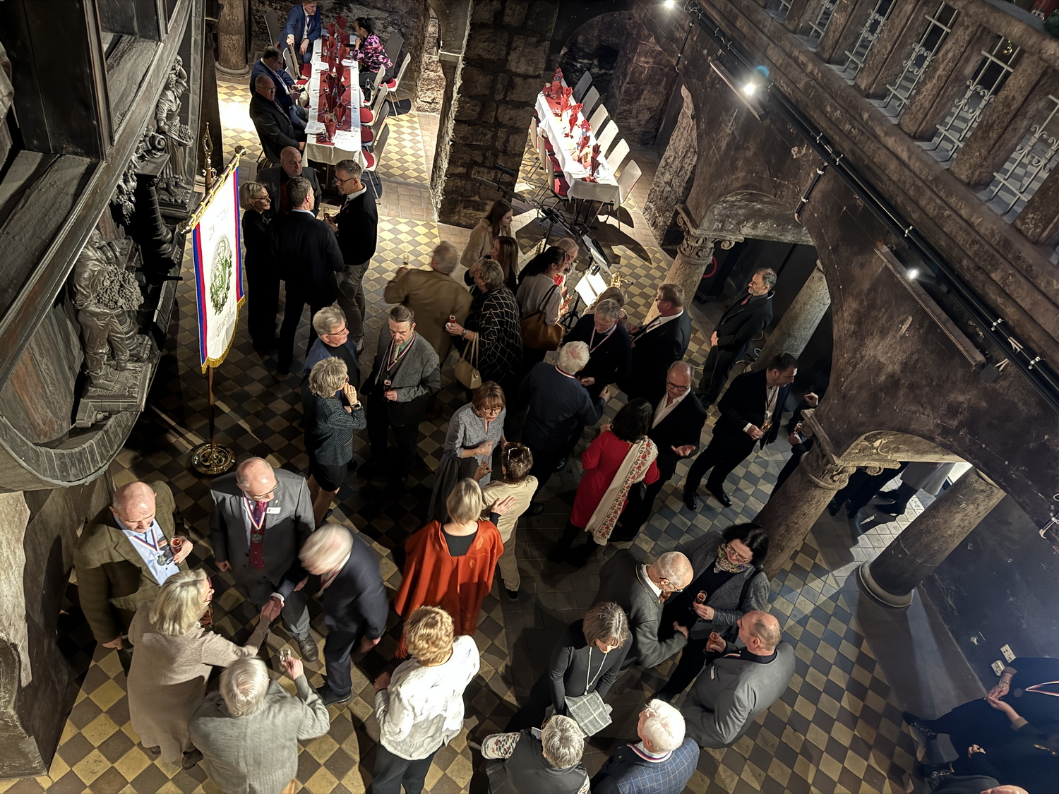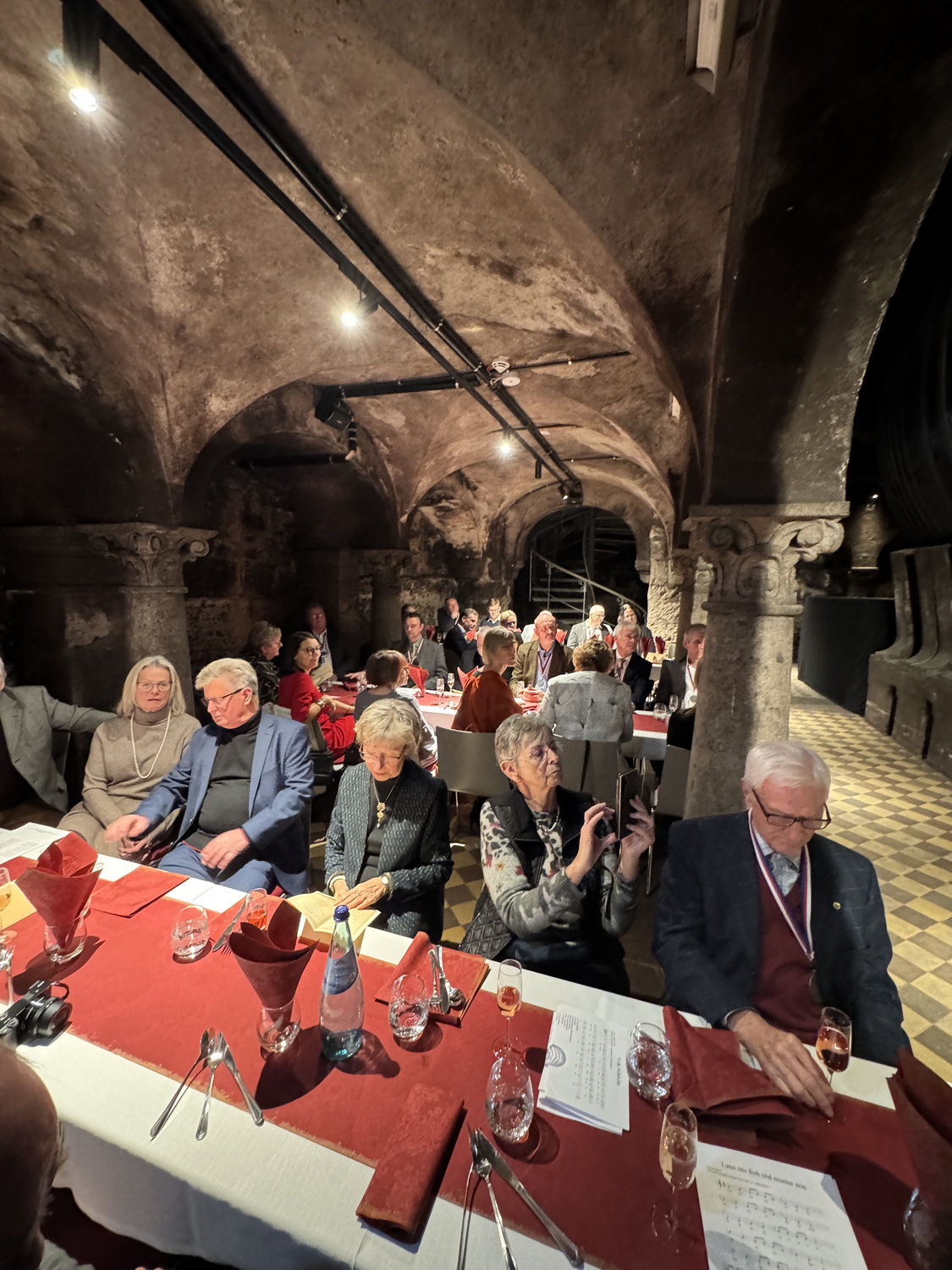 Die Feier fand im beeindruckenden Domkeller der Sektkellerei statt, in dessen historischem Gewölbe das größte Cuvéefass Deutschlands steht und vor dem die Fahne der Bruderschaft aufgestellt war.