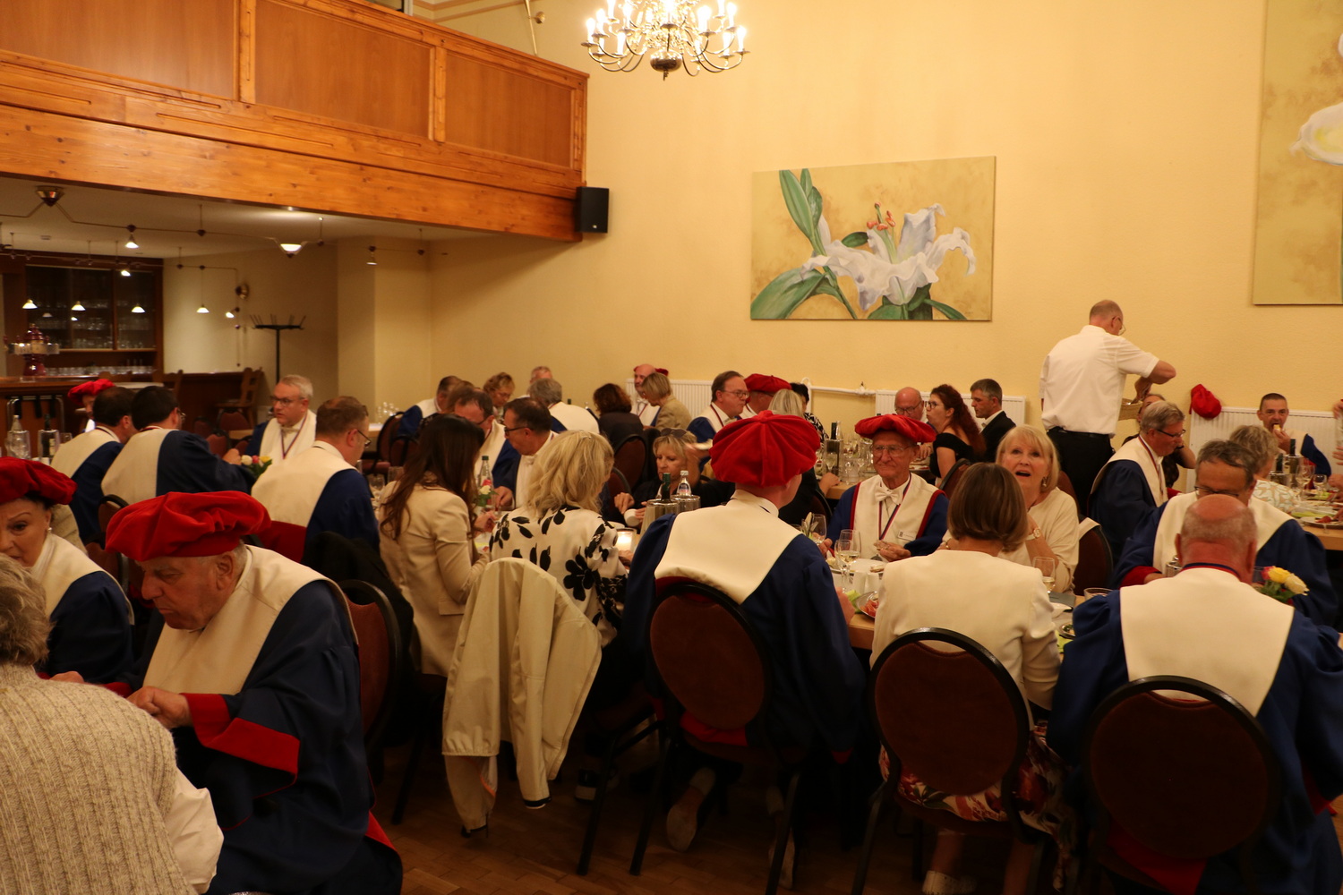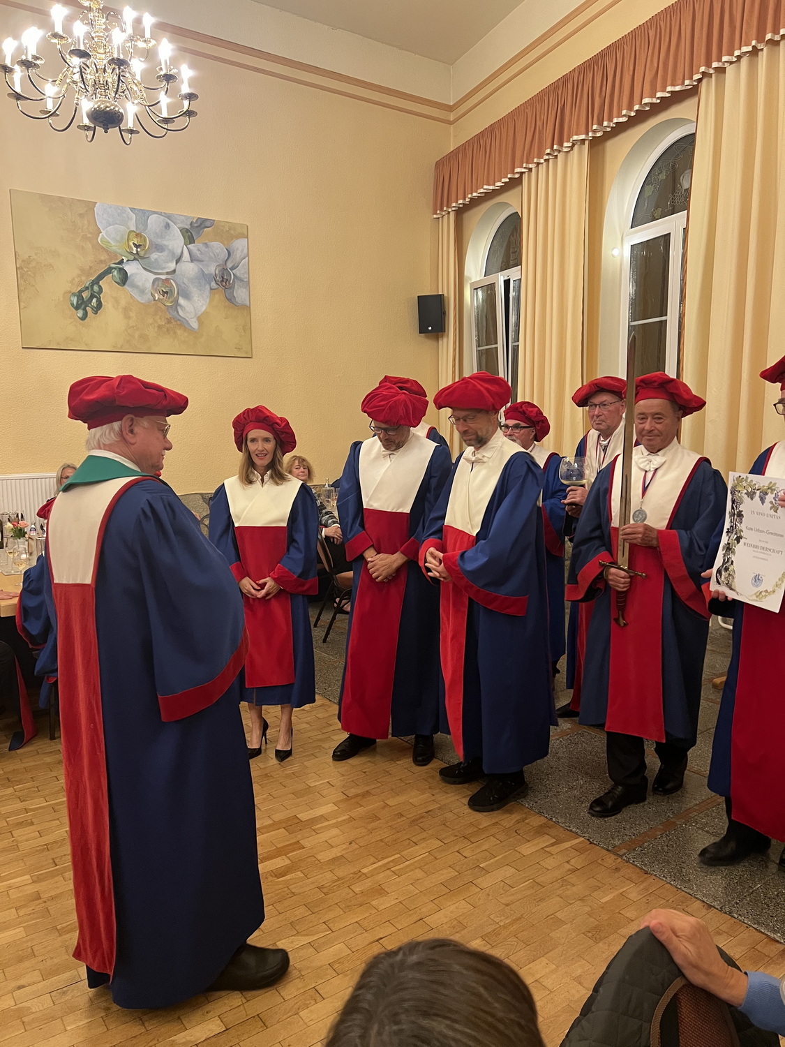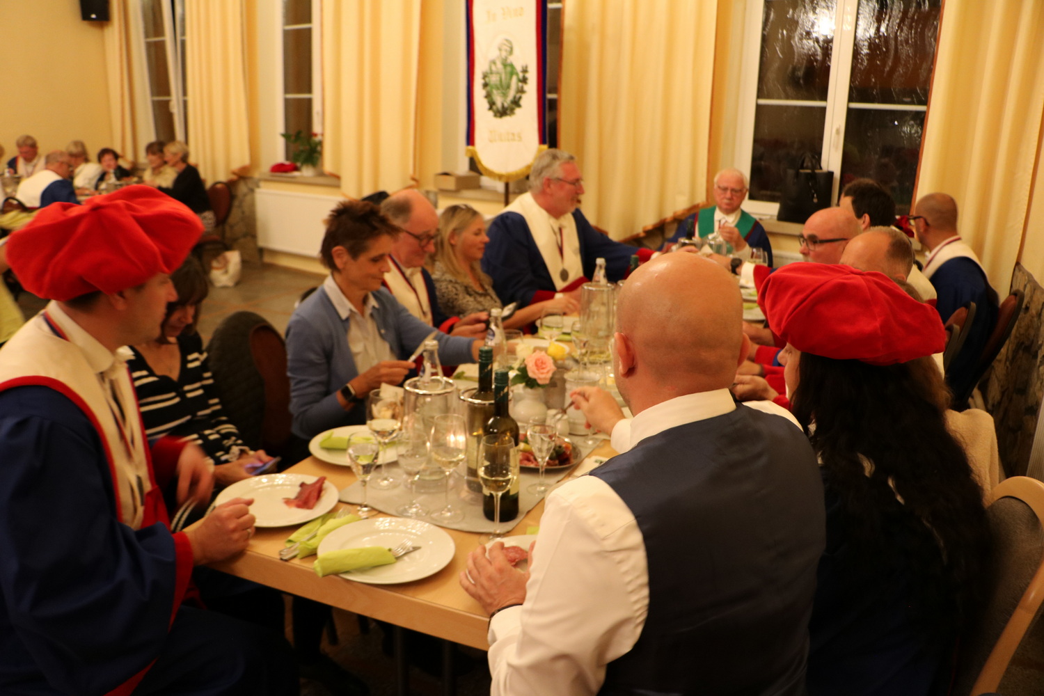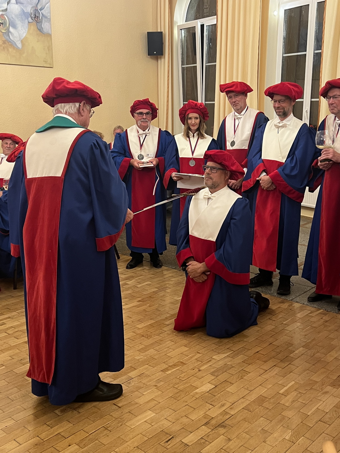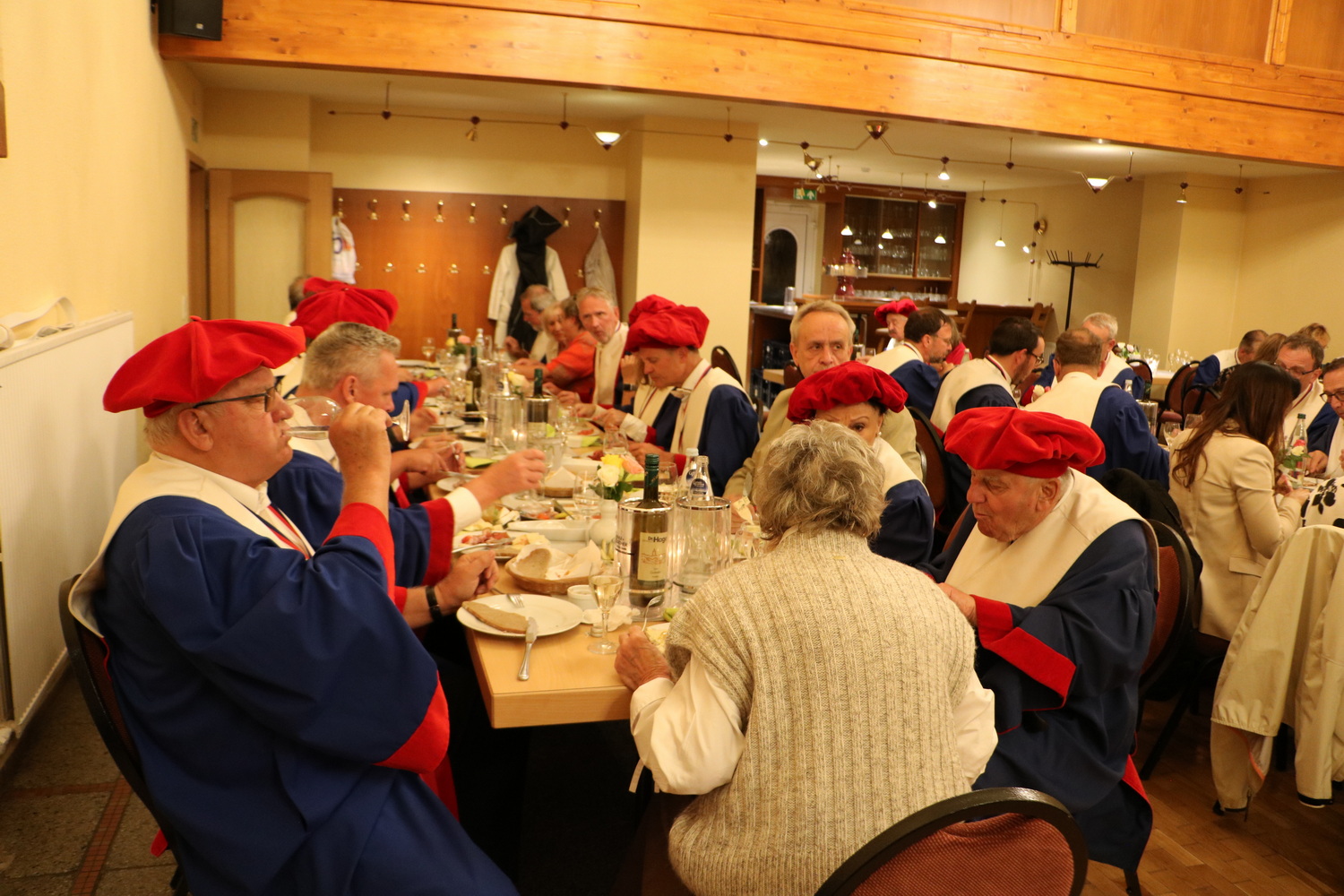 Jeder Anwärter stellte sich zunächst kurz vor und bestätigte seinen feierlichen Aufnahmeschwur. Danach erfolgte der symbolische Schwertschlag durch Ersten Bruderschaftsmeister Dieter Hanisch, ein Moment voller Geschichte und Bedeutung. Den Abschluss dieser besonderen Aufnahme bildete ein gemeinsamer Schluck Wein aus einem großen Glas, ein Zeichen echter Gemeinschaft. Anschließend erhielten die neuen Mitglieder ihre Bruderschaftsmedaille und die Aufnahmeurkunde. Ein Abend voller Genuss und Herzlichkeit. Beim gemeinsamen Abendessen hallten die Eindrücke des Tages noch lange nach. Gespräche erfüllten den Raum, mal bewegt, mal fröhlich, und oft erfüllt von Erinnerungen. Die anschließende Weinverkostung mit besonderen Weinen aus Rheinhessen, ausgewählt auf der Weinfahrt im Mai und vorgestellt von Kellermeister Andre Gussek, setzte einen genussvollen Schlusspunkt. Ein Tag, der in Erinnerung bleibt.