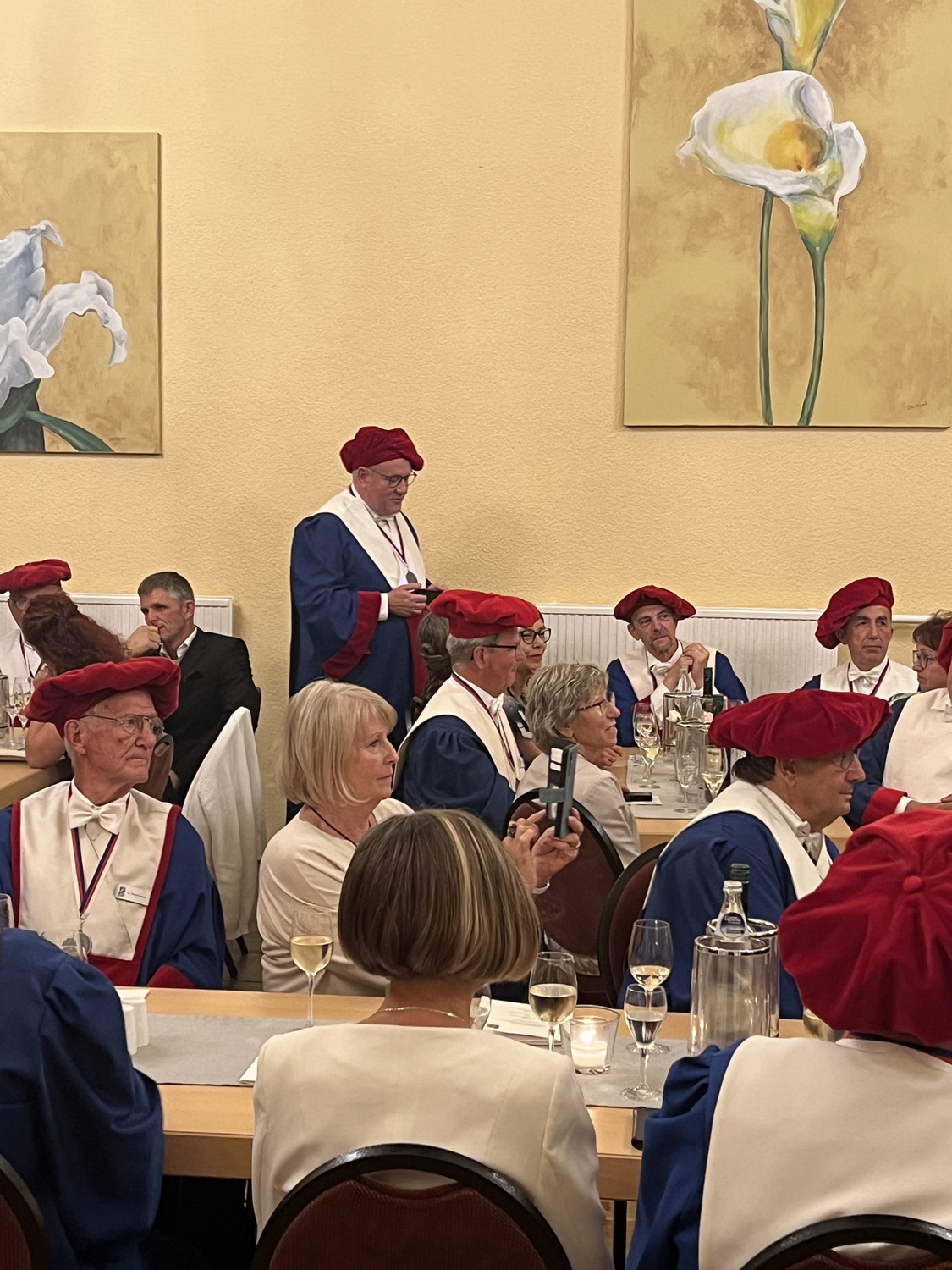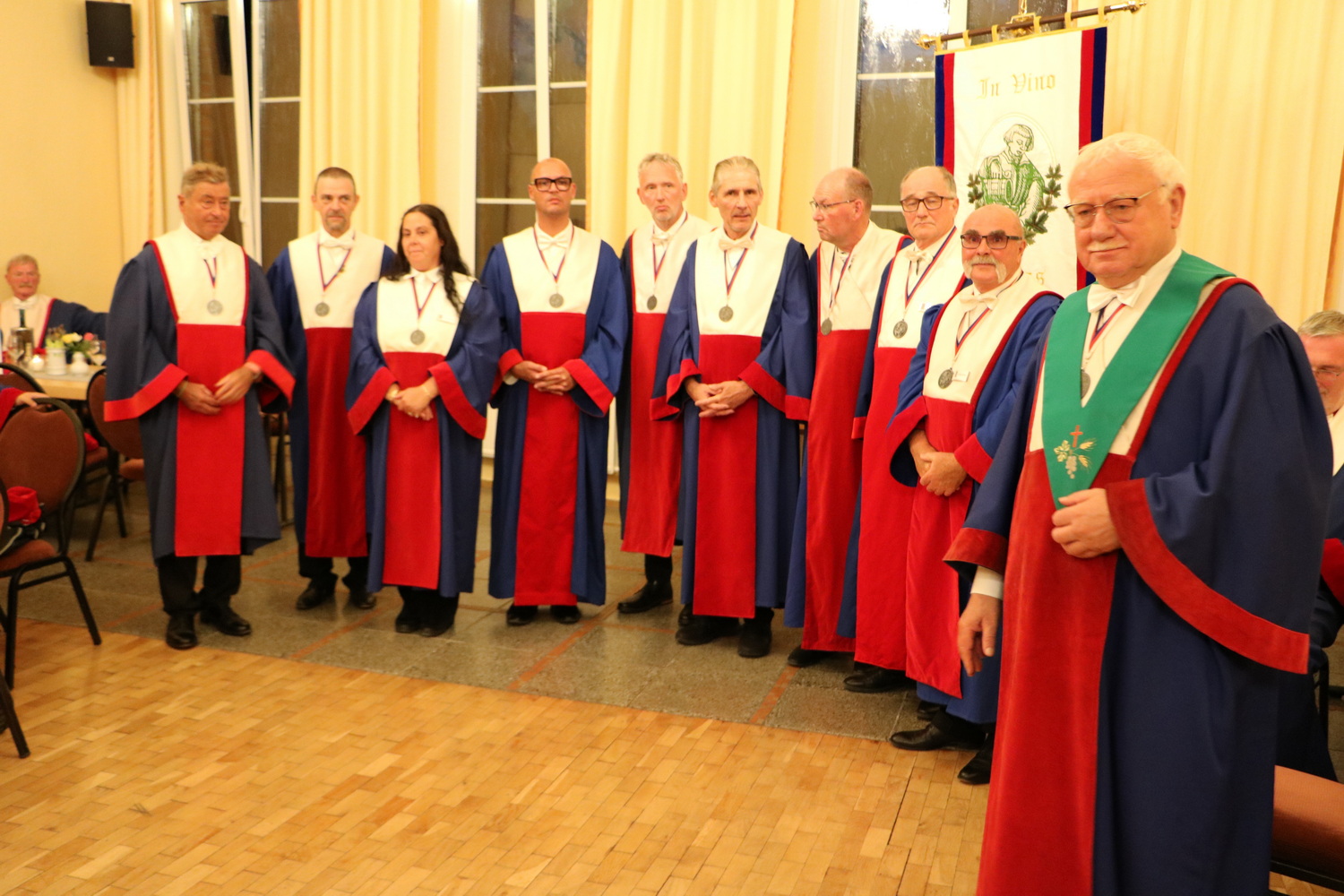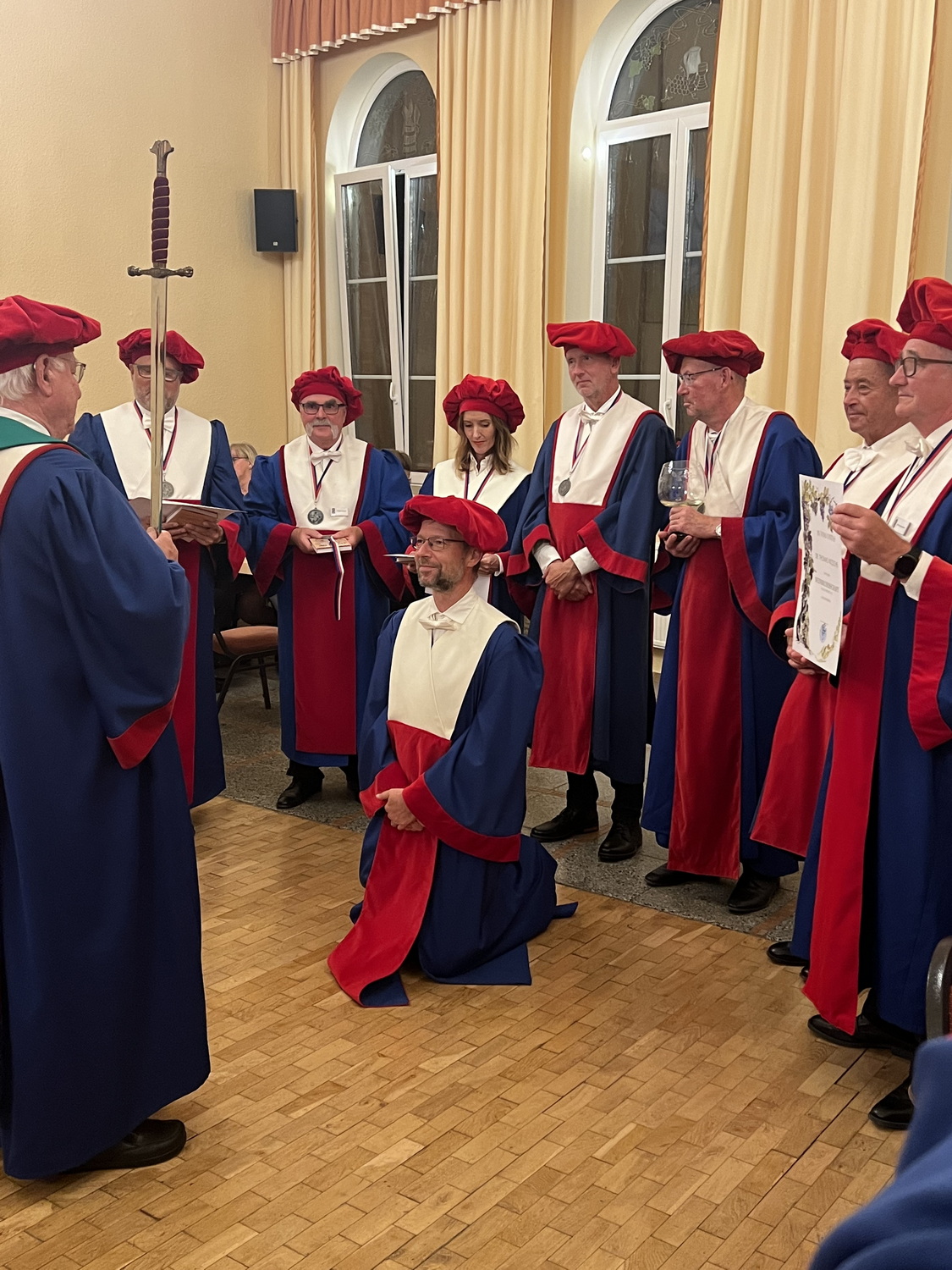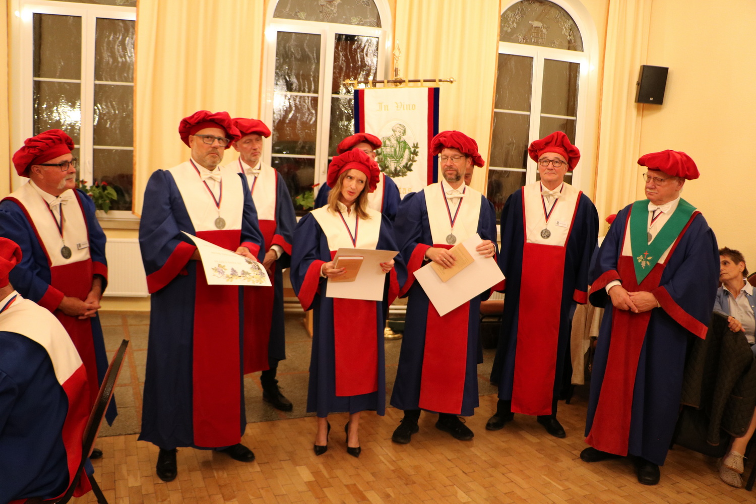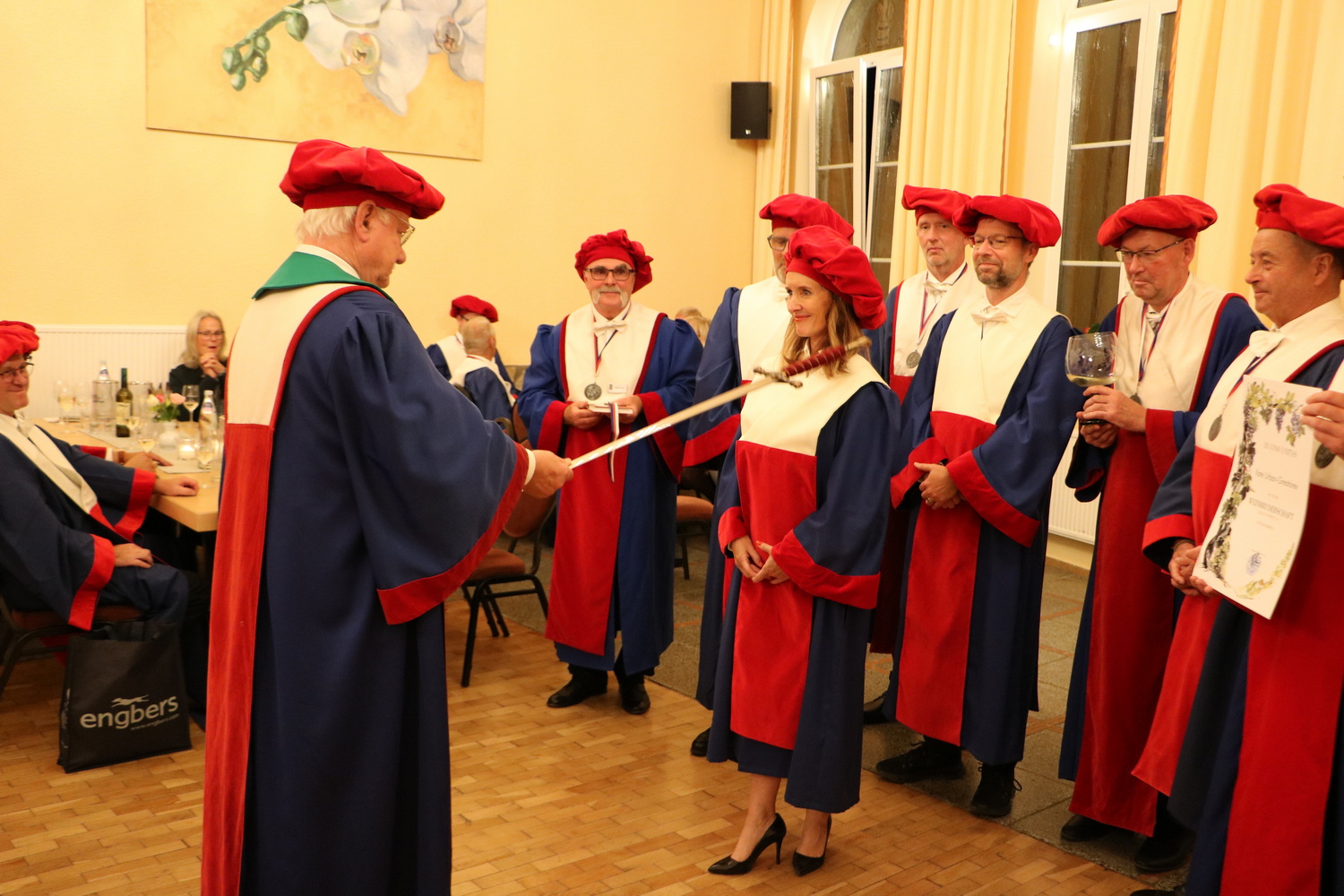 Jeder Anwärter stellte sich zunächst kurz vor und bestätigte seinen feierlichen Aufnahmeschwur. Danach erfolgte der symbolische Schwertschlag durch Ersten Bruderschaftsmeister Dieter Hanisch, ein Moment voller Geschichte und Bedeutung. Den Abschluss dieser besonderen Aufnahme bildete ein gemeinsamer Schluck Wein aus einem großen Glas, ein Zeichen echter Gemeinschaft. Anschließend erhielten die neuen Mitglieder ihre Bruderschaftsmedaille und die Aufnahmeurkunde. Ein Abend voller Genuss und Herzlichkeit. Beim gemeinsamen Abendessen hallten die Eindrücke des Tages noch lange nach. Gespräche erfüllten den Raum, mal bewegt, mal fröhlich, und oft erfüllt von Erinnerungen. Die anschließende Weinverkostung mit besonderen Weinen aus Rheinhessen, ausgewählt auf der Weinfahrt im Mai und vorgestellt von Kellermeister Andre Gussek, setzte einen genussvollen Schlusspunkt. Ein Tag, der in Erinnerung bleibt.