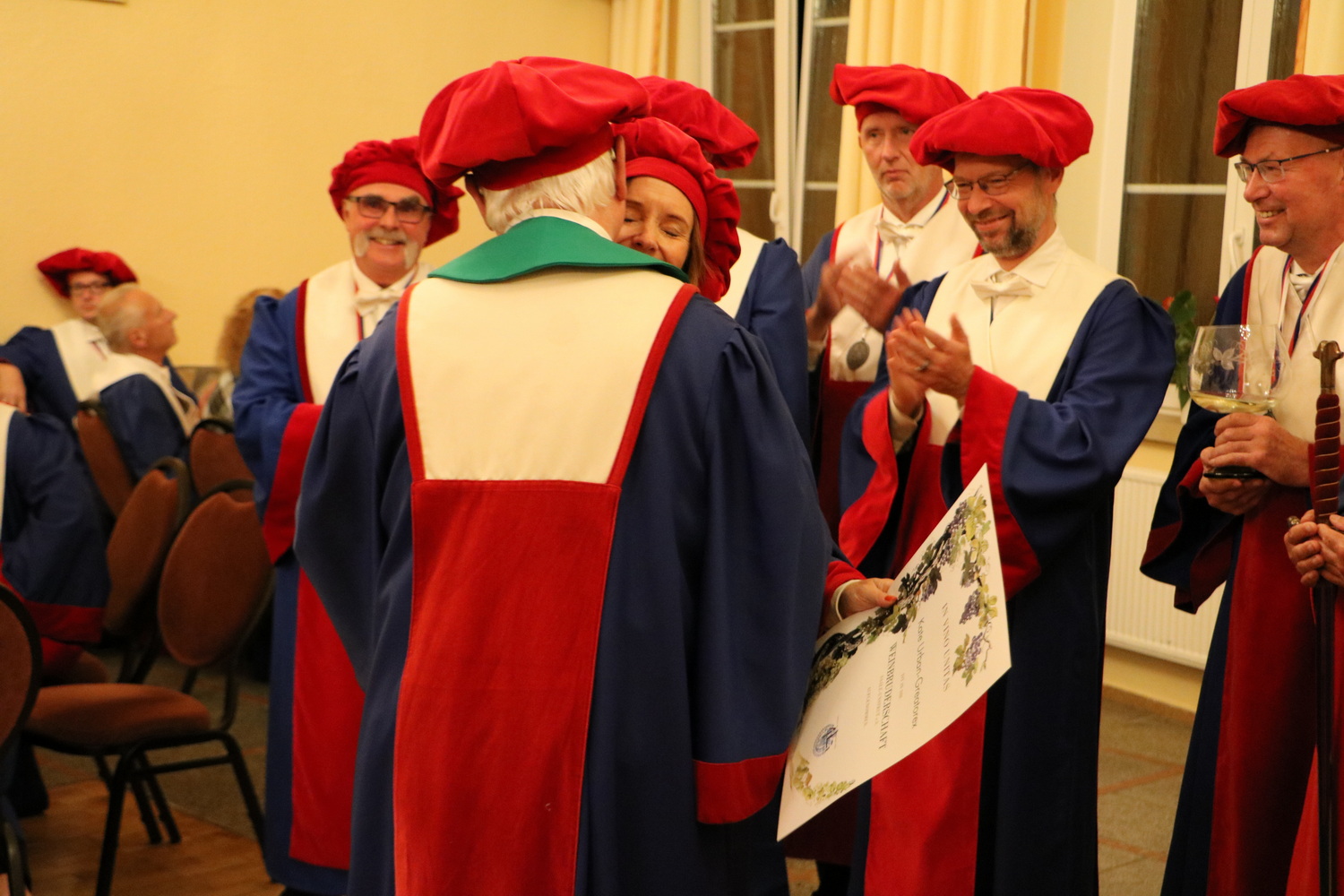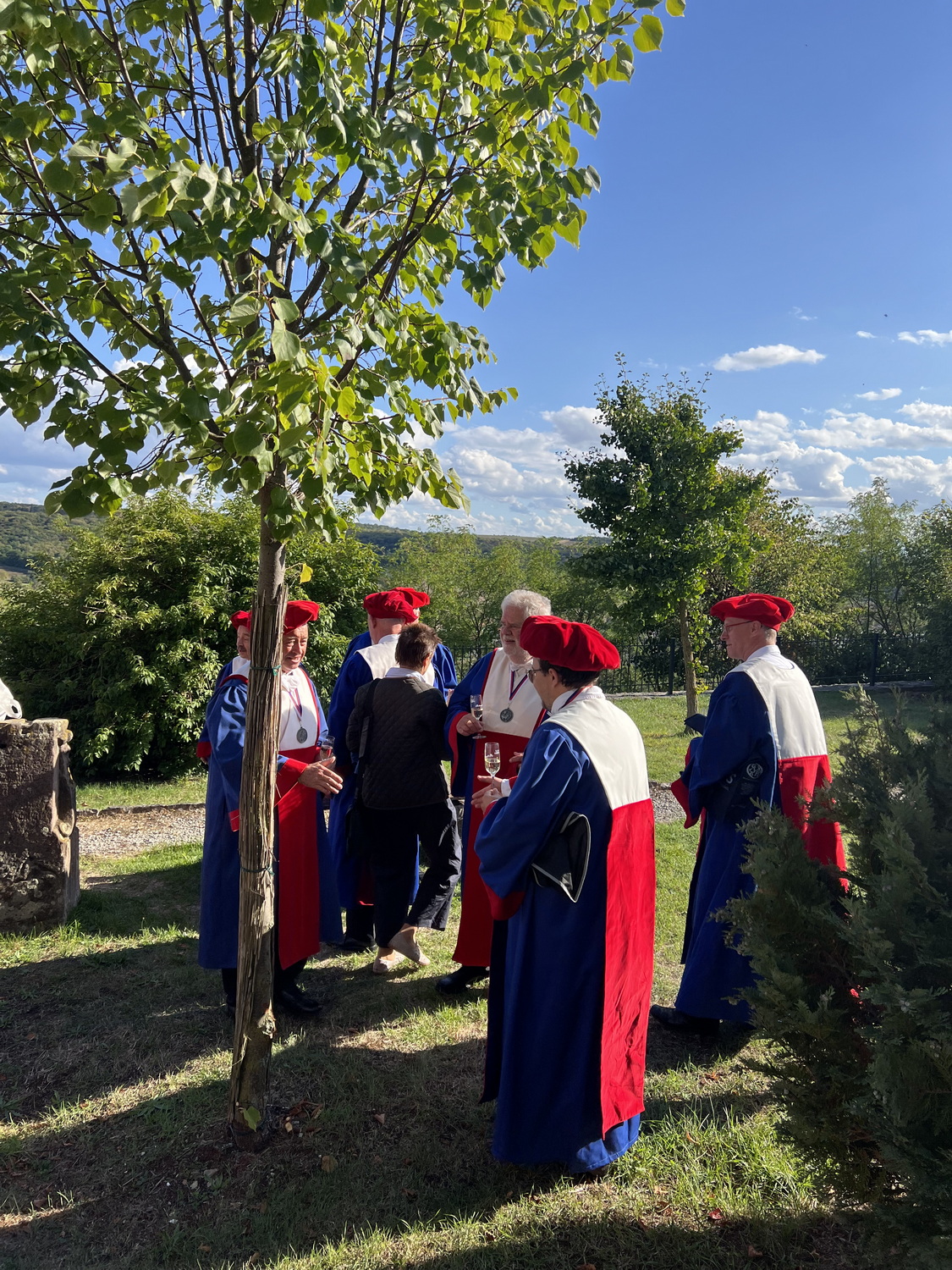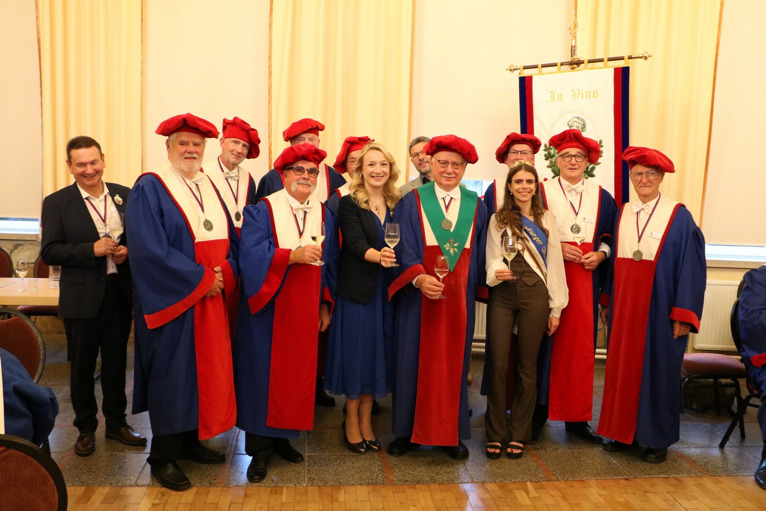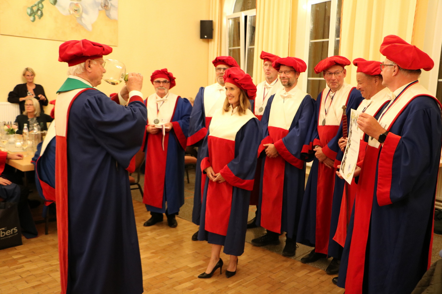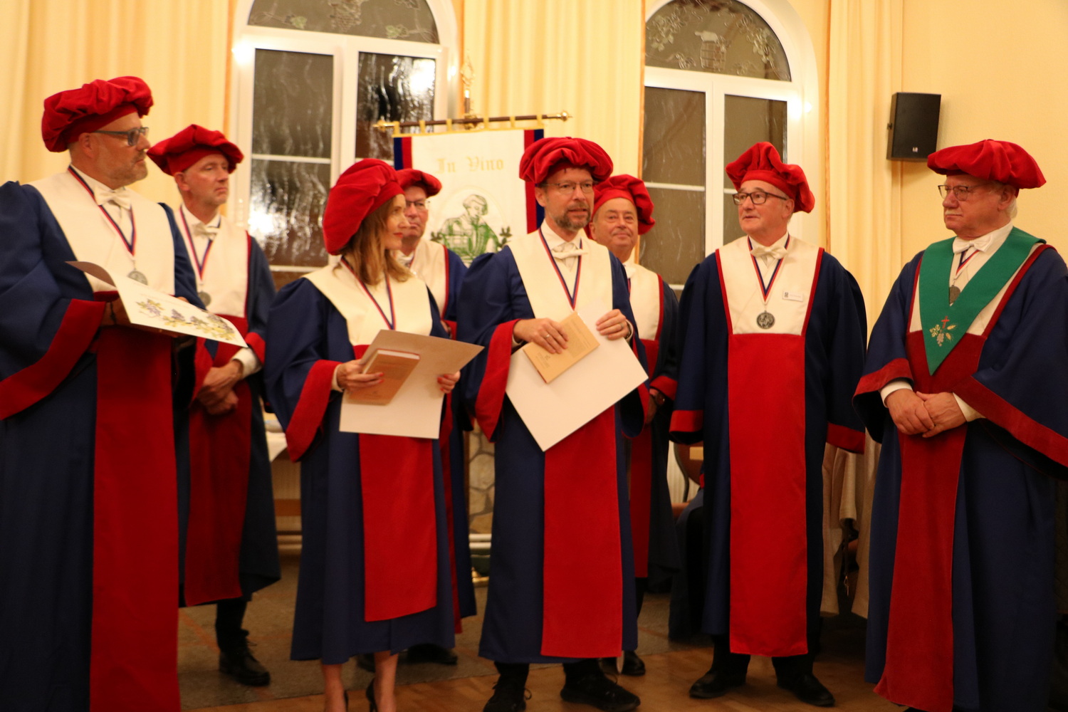 Jeder Anwärter stellte sich zunächst kurz vor und bestätigte seinen feierlichen Aufnahmeschwur. Danach erfolgte der symbolische Schwertschlag durch Ersten Bruderschaftsmeister Dieter Hanisch, ein Moment voller Geschichte und Bedeutung. Den Abschluss dieser besonderen Aufnahme bildete ein gemeinsamer Schluck Wein aus einem großen Glas, ein Zeichen echter Gemeinschaft. Anschließend erhielten die neuen Mitglieder ihre Bruderschaftsmedaille und die Aufnahmeurkunde. Ein Abend voller Genuss und Herzlichkeit. Beim gemeinsamen Abendessen hallten die Eindrücke des Tages noch lange nach. Gespräche erfüllten den Raum, mal bewegt, mal fröhlich, und oft erfüllt von Erinnerungen. Die anschließende Weinverkostung mit besonderen Weinen aus Rheinhessen, ausgewählt auf der Weinfahrt im Mai und vorgestellt von Kellermeister Andre Gussek, setzte einen genussvollen Schlusspunkt. Ein Tag, der in Erinnerung bleibt.