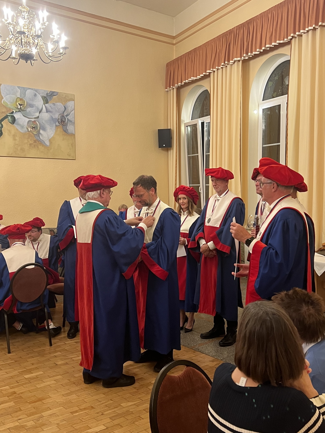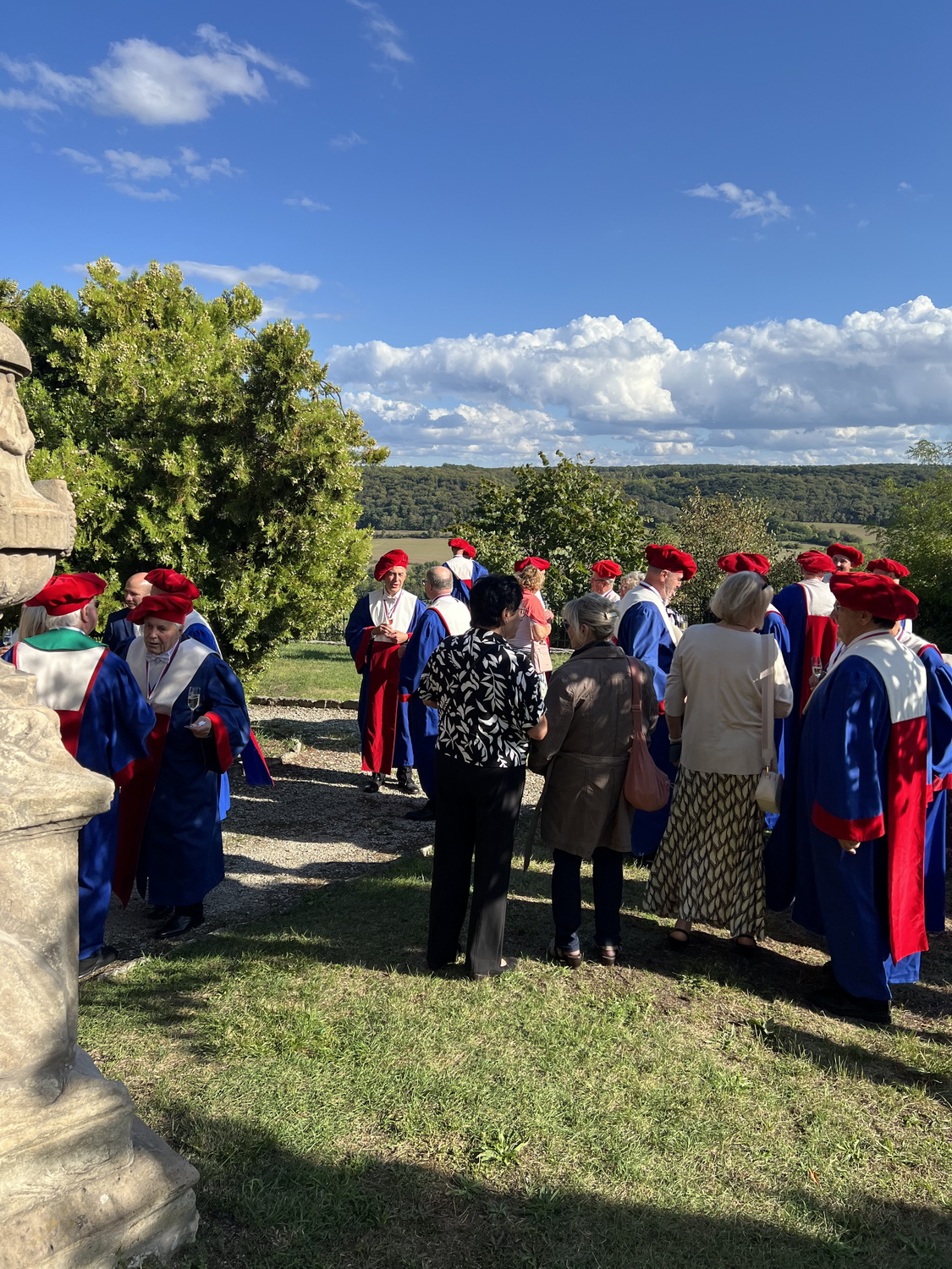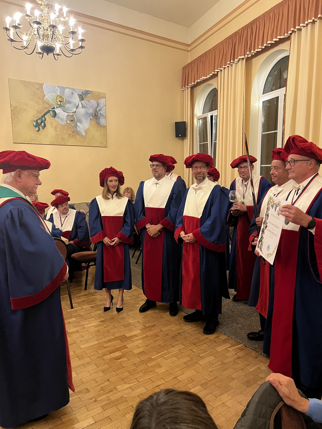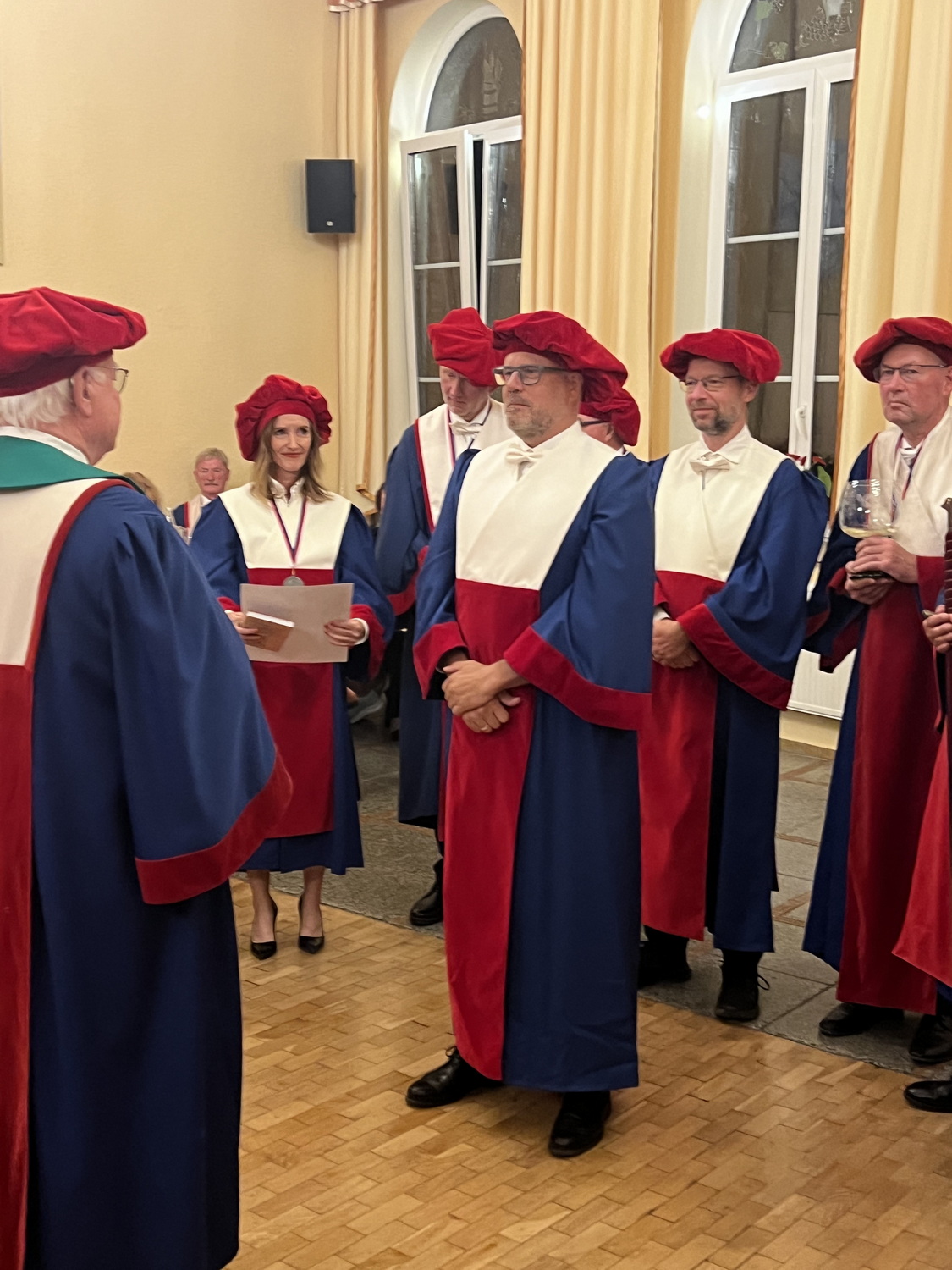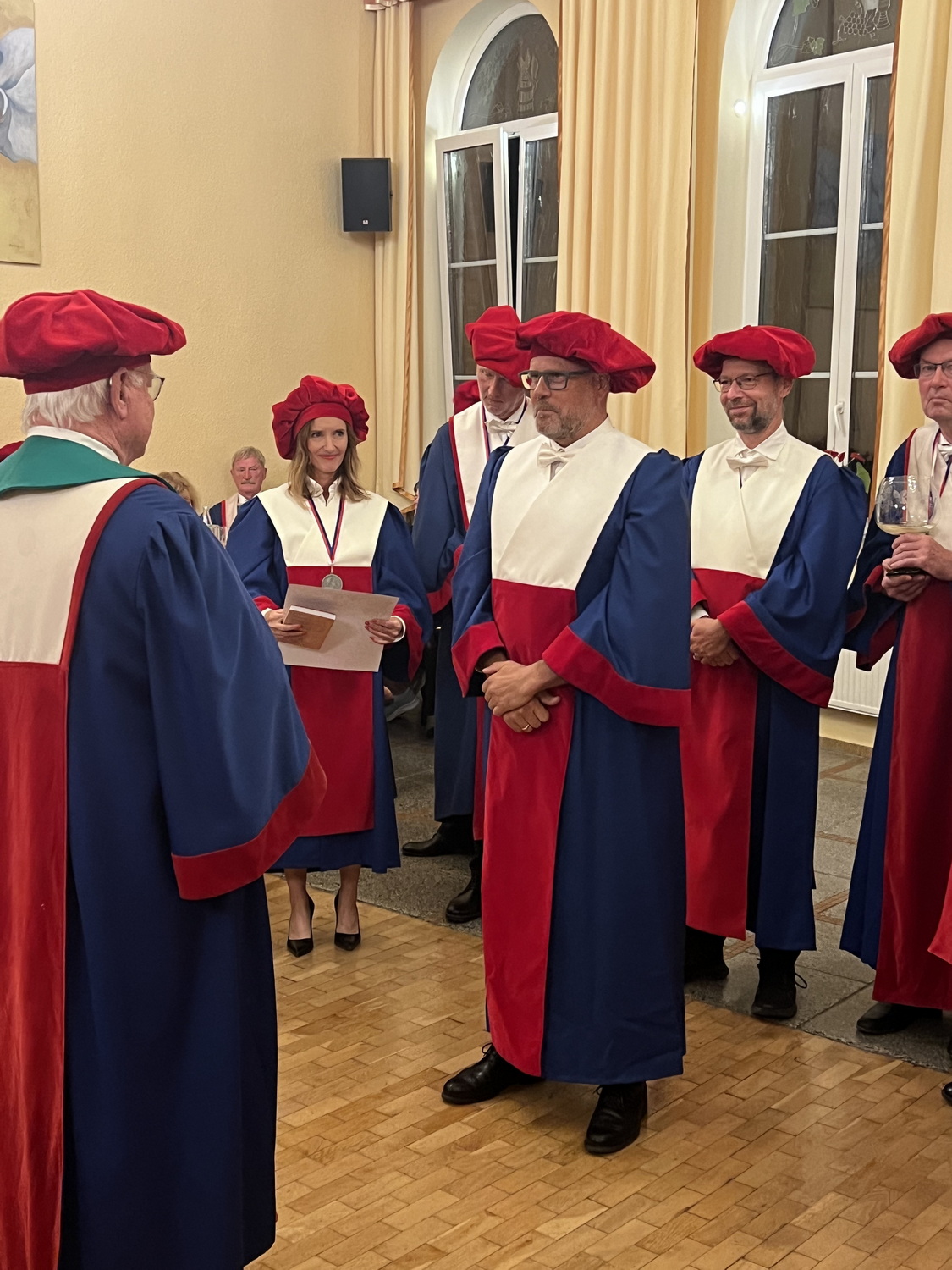 Jeder Anwärter stellte sich zunächst kurz vor und bestätigte seinen feierlichen Aufnahmeschwur. Danach erfolgte der symbolische Schwertschlag durch Ersten Bruderschaftsmeister Dieter Hanisch, ein Moment voller Geschichte und Bedeutung. Den Abschluss dieser besonderen Aufnahme bildete ein gemeinsamer Schluck Wein aus einem großen Glas, ein Zeichen echter Gemeinschaft. Anschließend erhielten die neuen Mitglieder ihre Bruderschaftsmedaille und die Aufnahmeurkunde. Ein Abend voller Genuss und Herzlichkeit. Beim gemeinsamen Abendessen hallten die Eindrücke des Tages noch lange nach. Gespräche erfüllten den Raum, mal bewegt, mal fröhlich, und oft erfüllt von Erinnerungen. Die anschließende Weinverkostung mit besonderen Weinen aus Rheinhessen, ausgewählt auf der Weinfahrt im Mai und vorgestellt von Kellermeister Andre Gussek, setzte einen genussvollen Schlusspunkt. Ein Tag, der in Erinnerung bleibt.