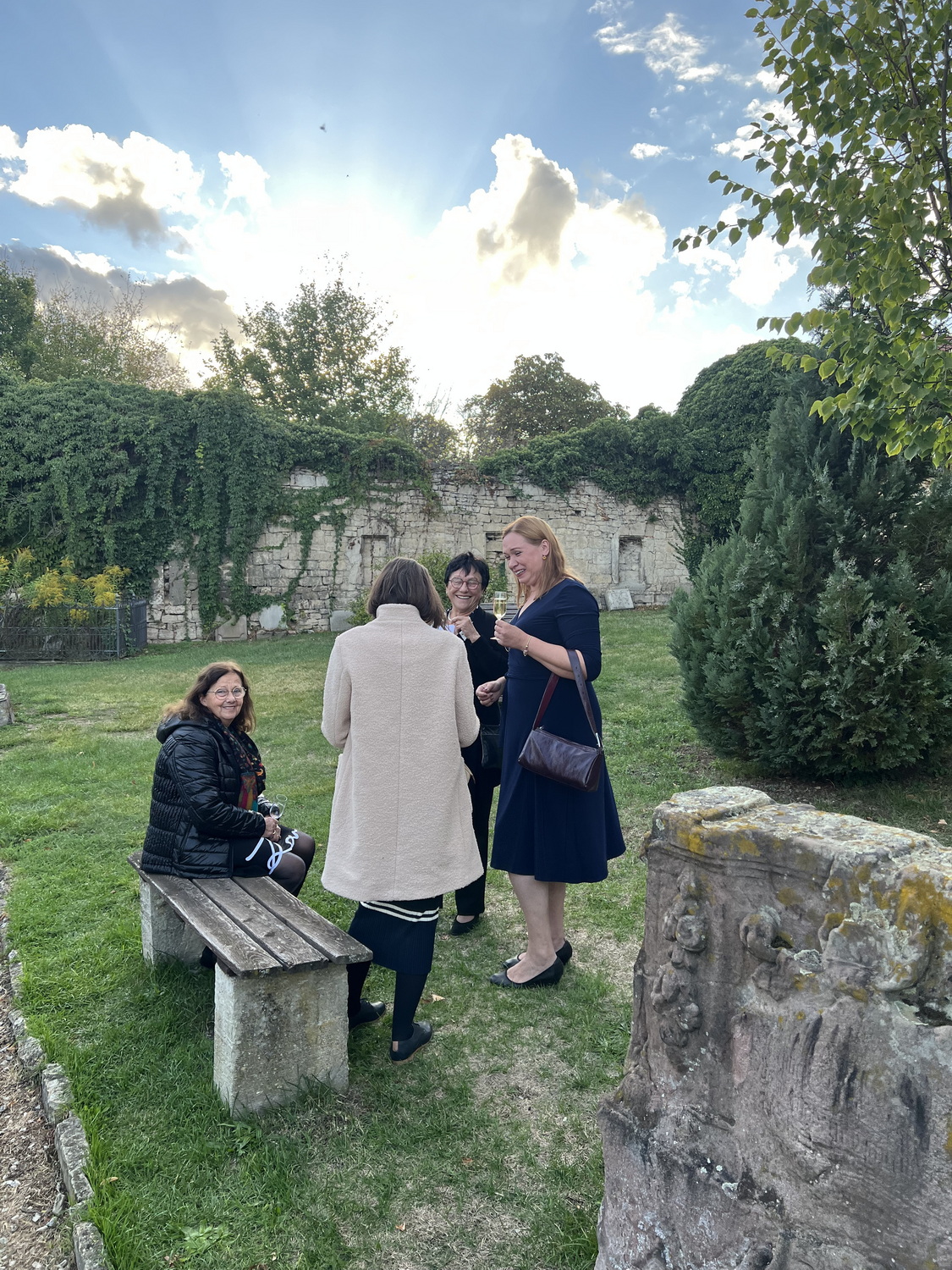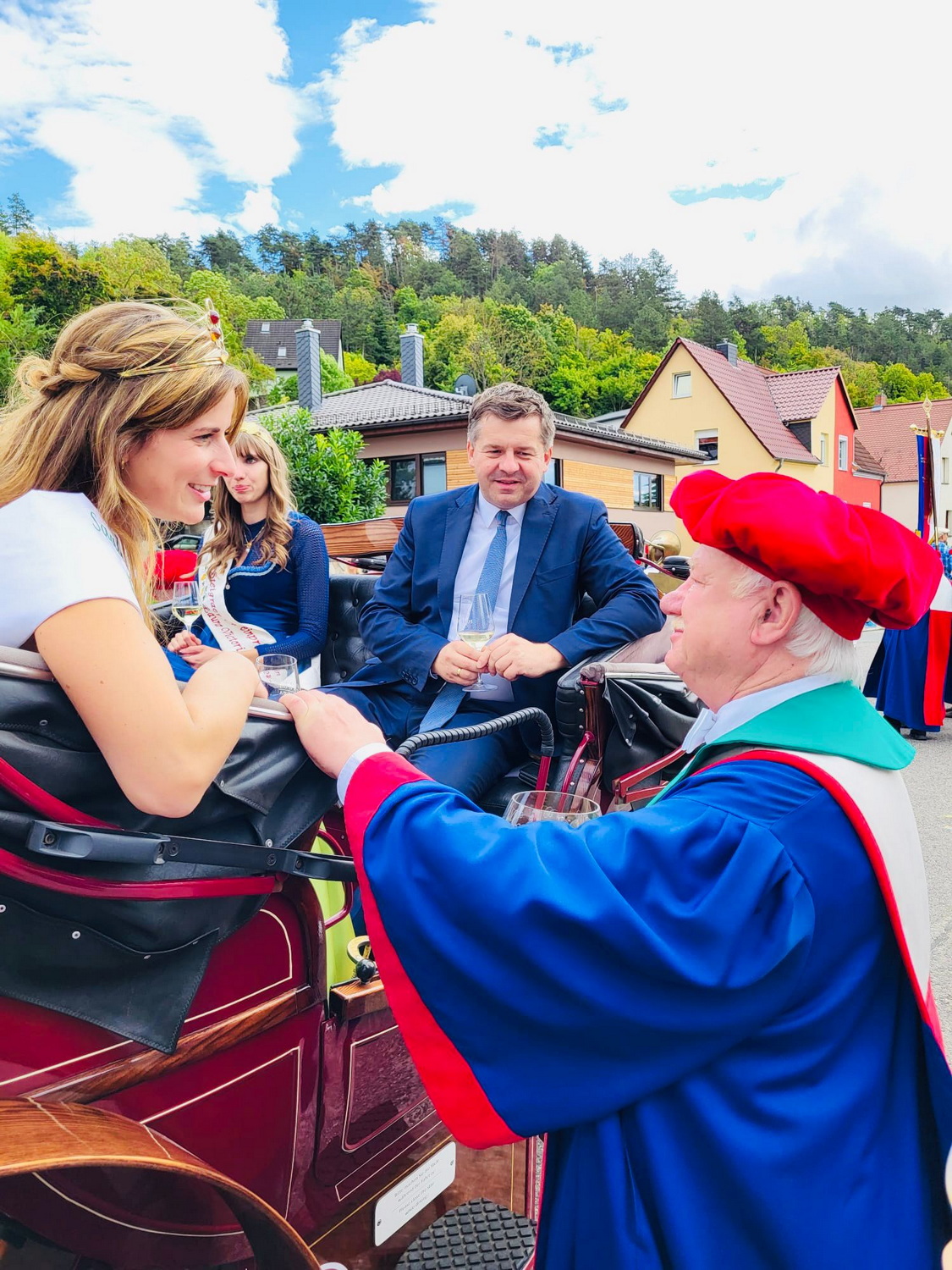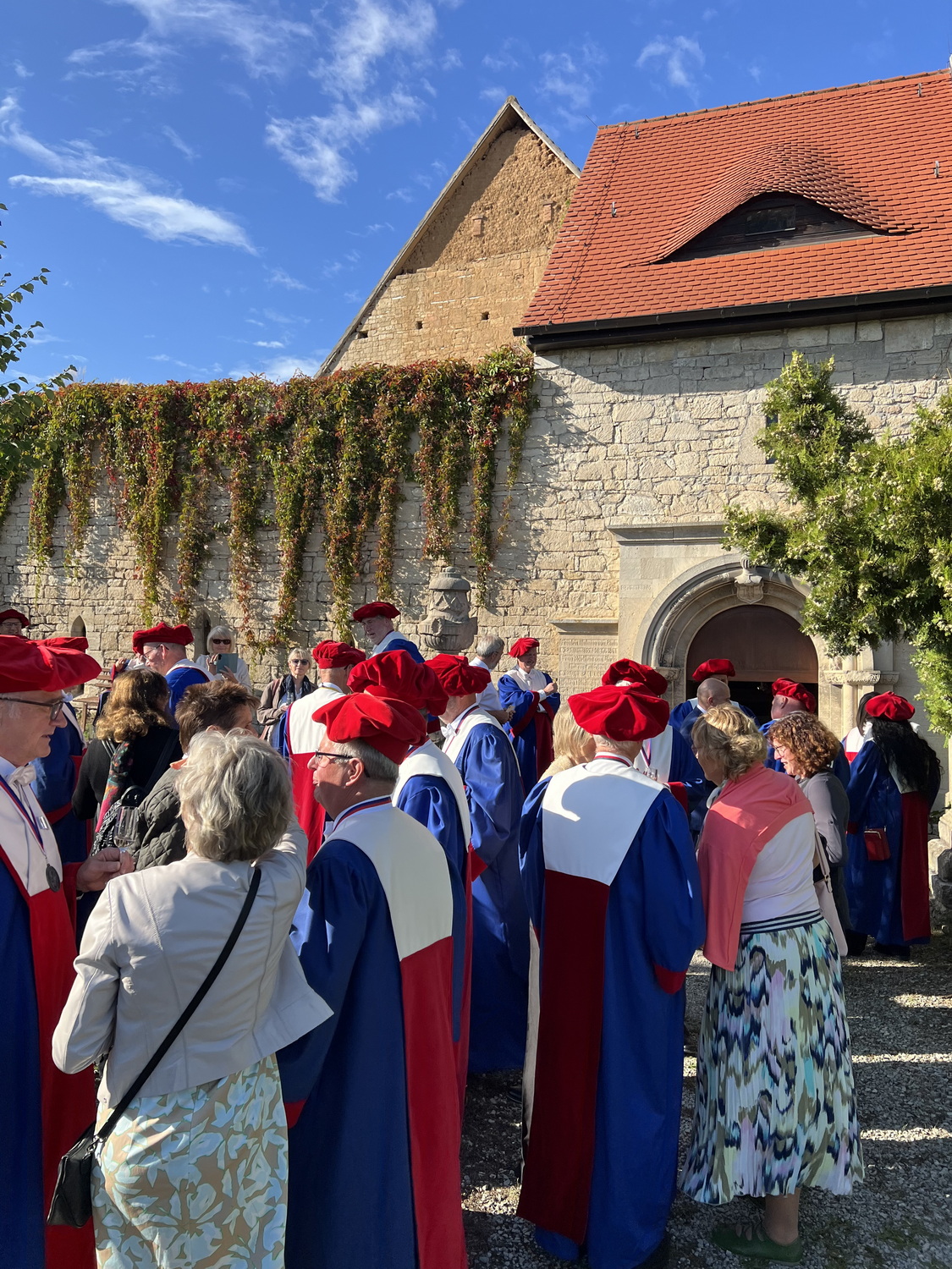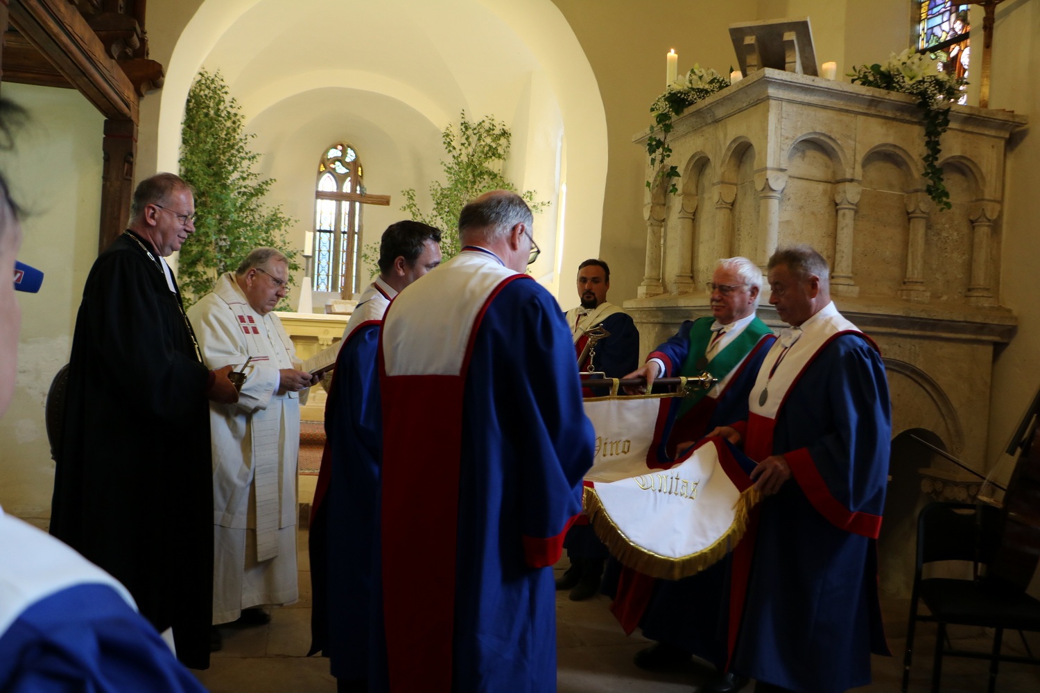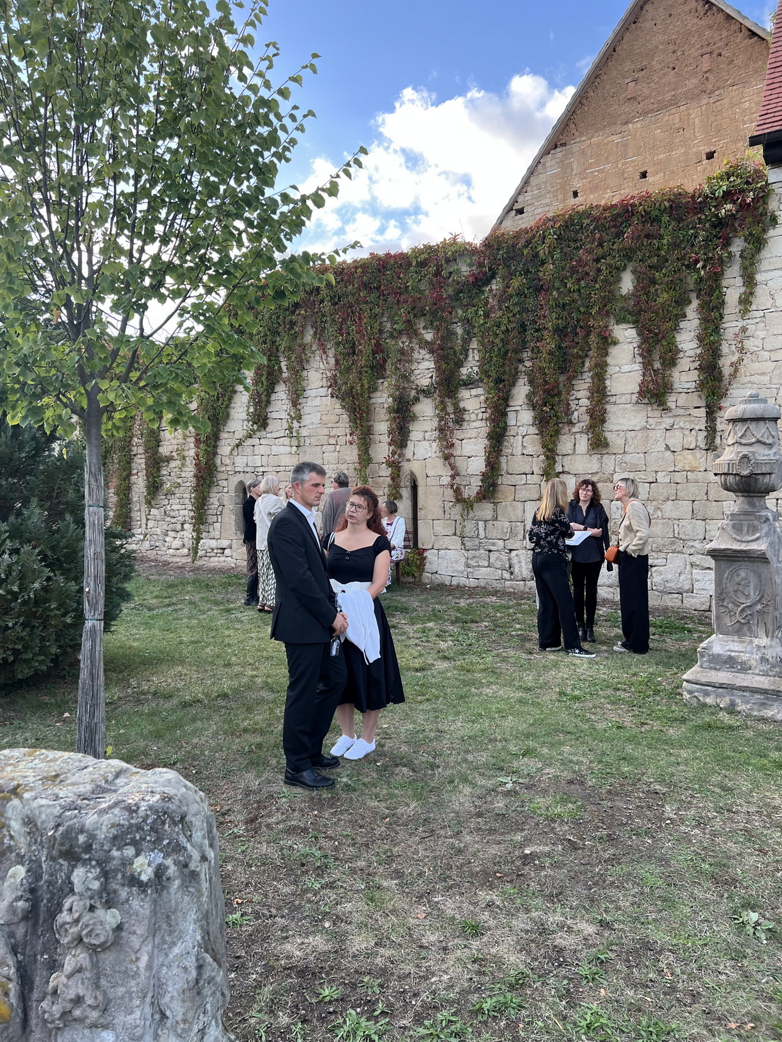Es war ein später Sommernachmittag, als die Weinbruderschaft Saale-Unstrut e.V. am 12. September 2025 zusammenkam, ein Tag, der sich schon beim ersten Schritt in das Tal nach Zscheiplitz wie ein besonderer Moment anfühlte. Die ehrwürdige Klosterkirche erhob sich still über den Weinbergen, und wer an diesem Nachmittag eintraf, spürte sofort, dass heute ein Stück Bruderschaftsgeschichte geschrieben werden würde. Ein Beginn voller Begegnungen. Bereits um 16:30 Uhr füllte sich der Vorplatz der Kirche mit Stimmen, Lachen und lebhaften Begrüßungen. Beim Sektempfang klirrten die Gläser, während Weinschwestern und Weinbrüder wie alte Freunde aufeinander zugingen. Bekannte Gesichter strahlten, neue Mitglieder und Begleitungen fühlten sich sofort willkommen, und eine Atmosphäre von Herzlichkeit, Gemeinschaft und gespannter Vorfreude lag über dem Platz. Als die Stellprobe zur Fahnenweihe begann, glitt die gesellige Stimmung sanft in feierliche Konzentration hinüber, und der Übergang in den Einzug in die Kirche vollzog sich wie ein kleines Ritual, ruhig, würdevoll und getragen vom Gefühl, Teil eines besonderen Tages zu sein. Die Weihe der neuen Vereinsfahne.