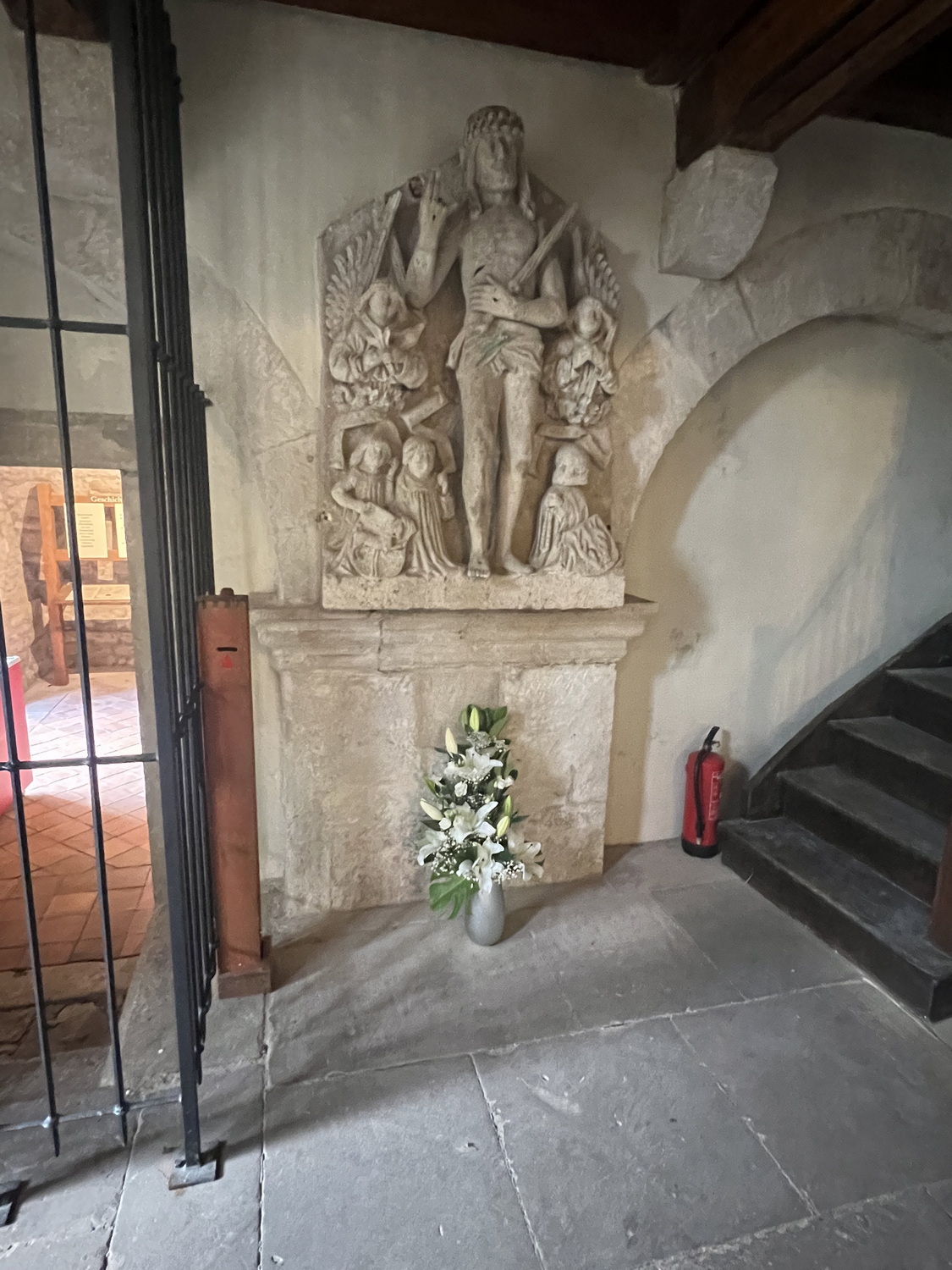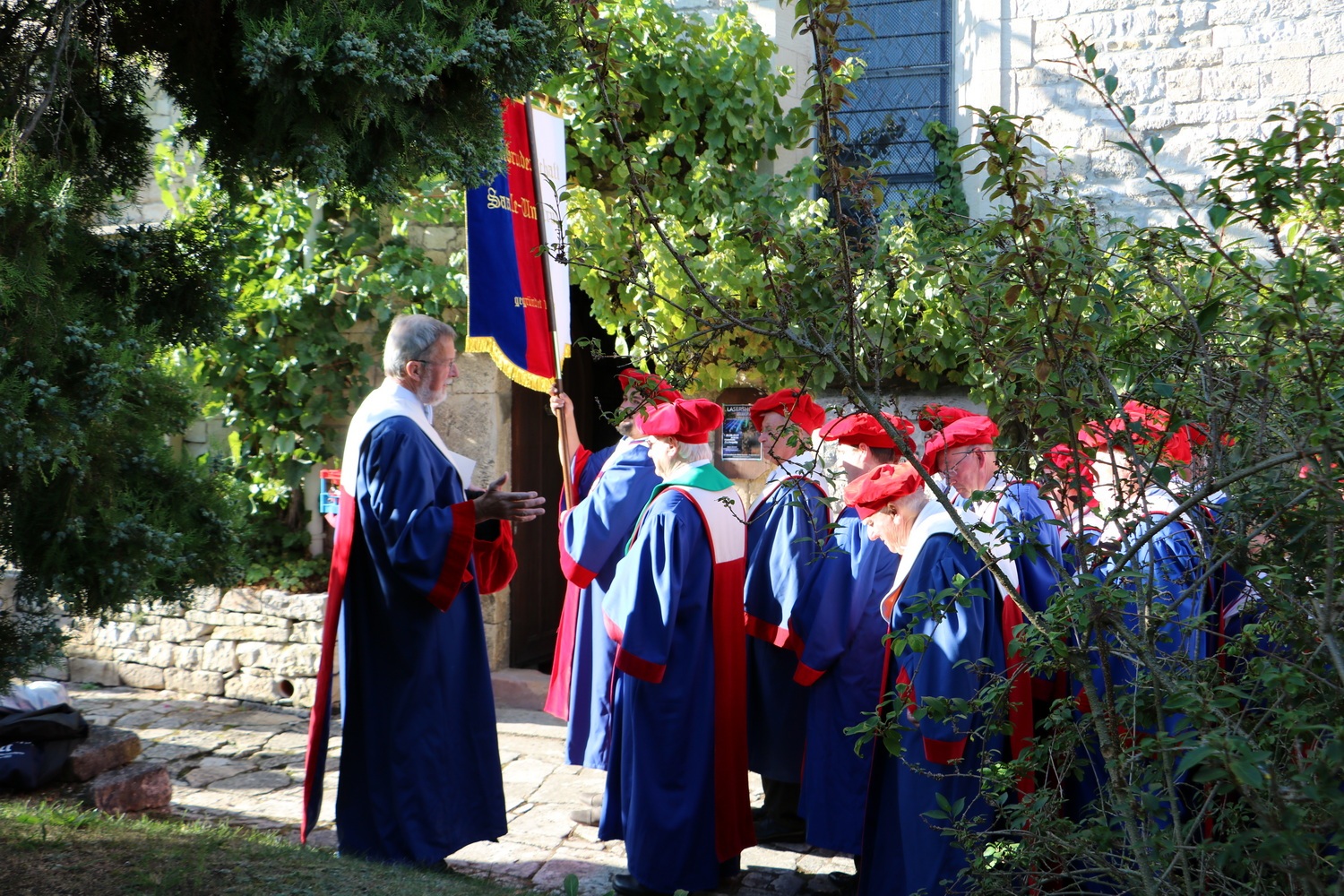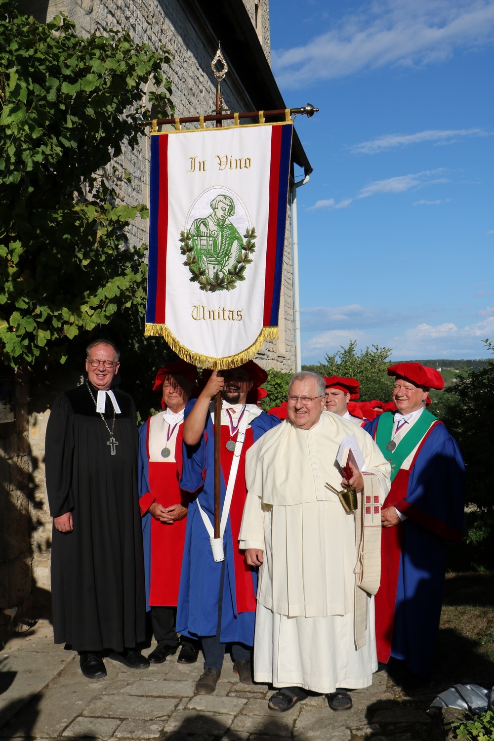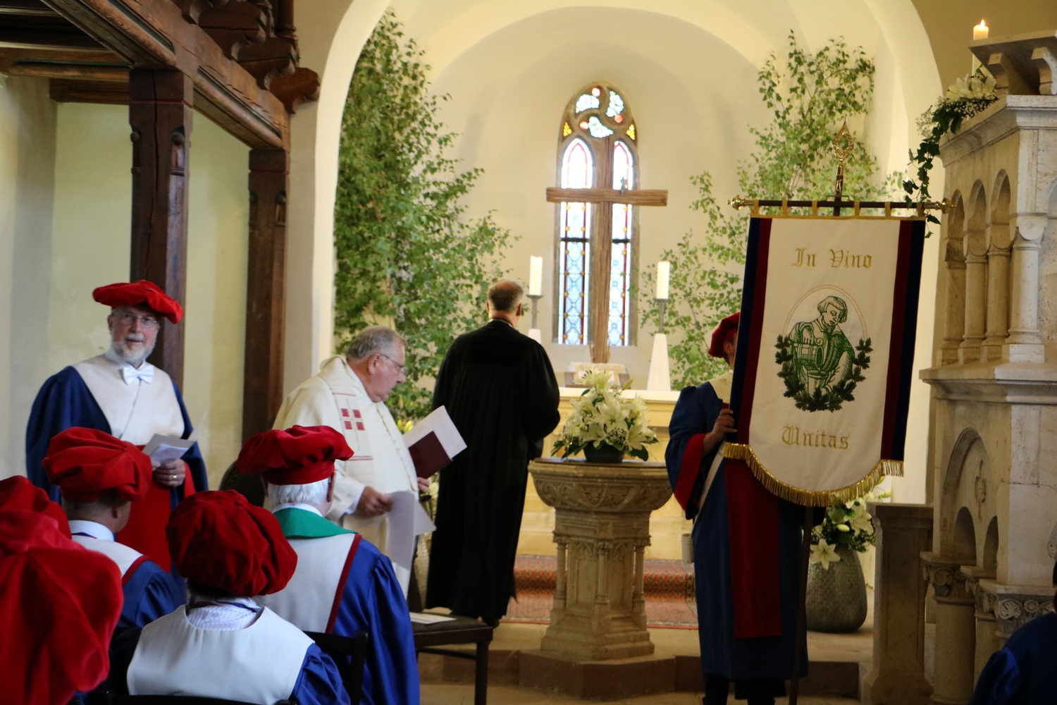 Um 17:30 Uhr zogen die Weinschwestern und Weinbrüder in die festlich geschmückte Klosterkirche ein. In dem ehrfurchtgebietenden Raum begann die feierliche Weihe der neuen Fahne, ein Moment von großer Bedeutung, der alle Anwesenden tief berührte. Die Zeremonie wurde von Bischof Dr. Johann Schneider und Prior Prof. Dr. Clemens Dölken mit großer Würde geleitet. Präzeptor Weinbruder Braun koordinierte den Ablauf und sorgte für eine harmonische und feierliche Zeremonie. Bischof Schneider eröffnete die Feier trinitarisch, bevor Prior Dölken mit warmen und tiefsinnigen Worten auf die Bedeutung dieses Tages einstimmte. Psalmgebet, Tagesgebet und eine besinnliche Ansprache erfüllten die Kirche mit einer ergreifenden Stille.