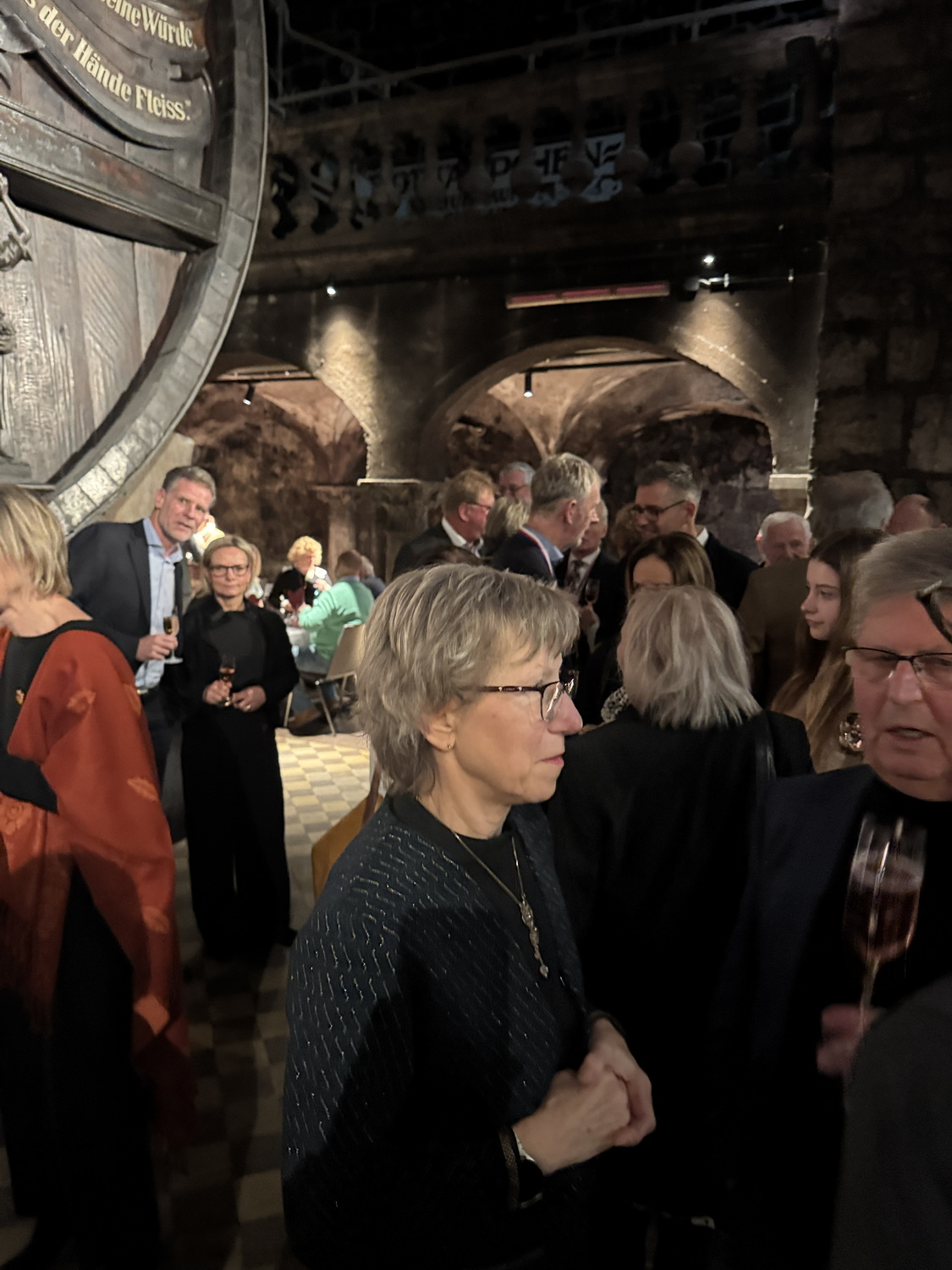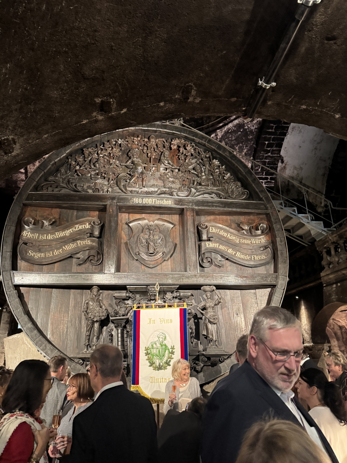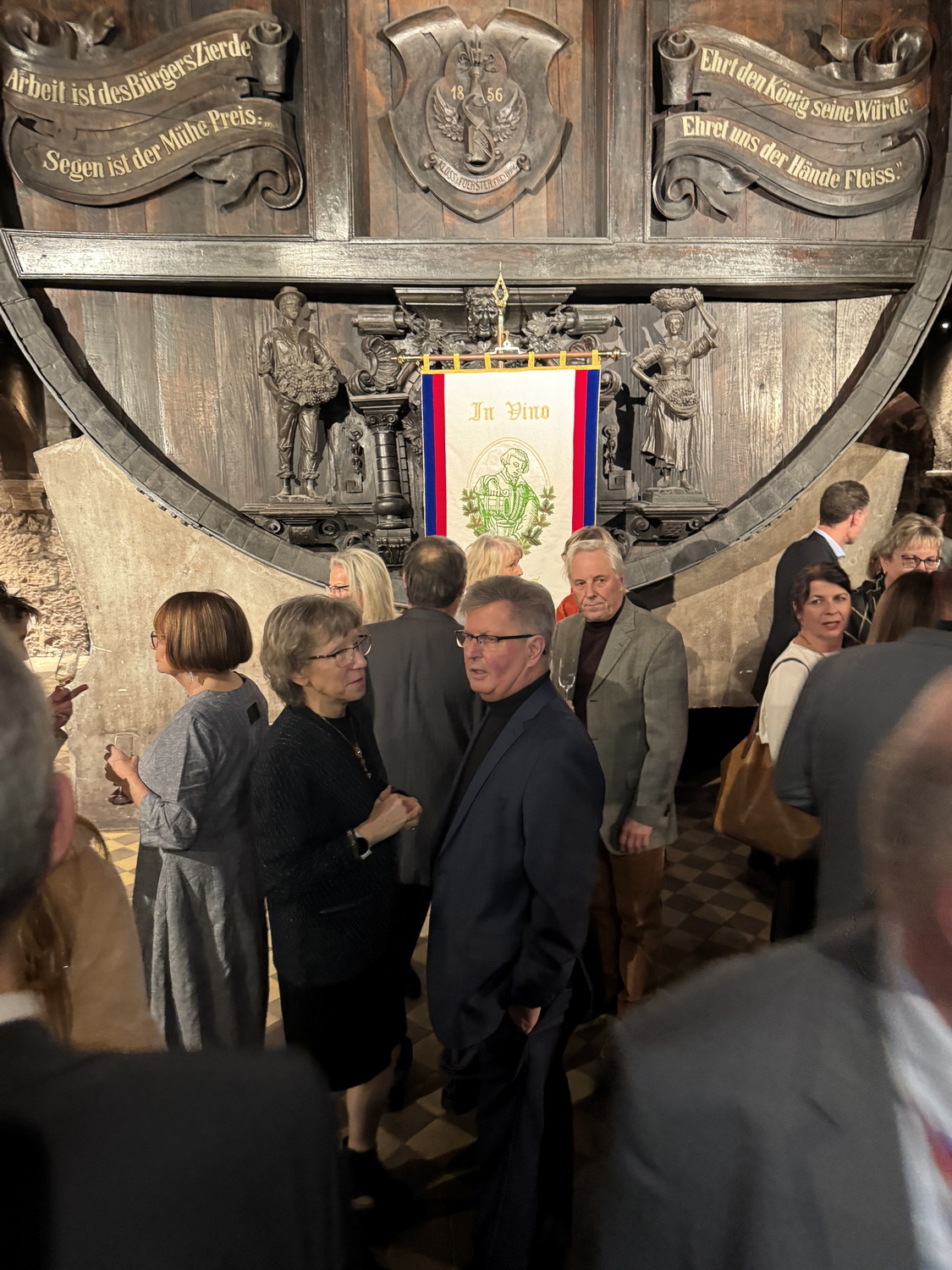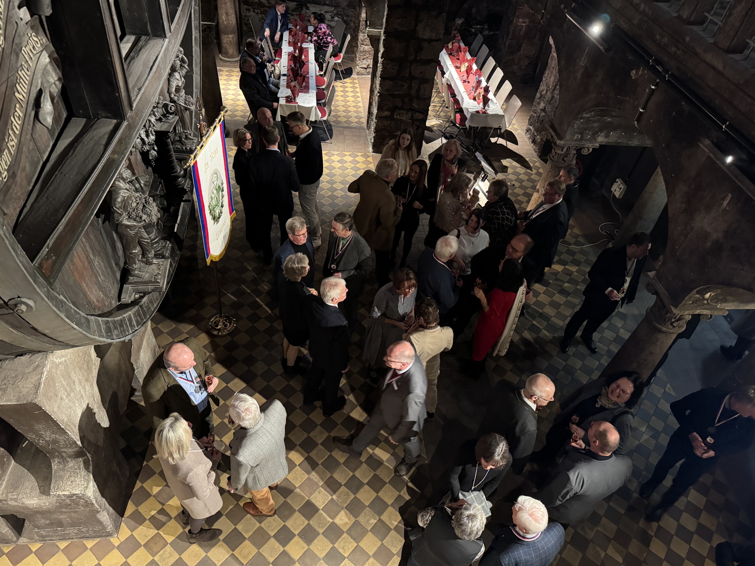 Die Feier fand im beeindruckenden Domkeller der Sektkellerei statt, in dessen historischem Gewölbe das größte Cuvéefass Deutschlands steht und vor dem die Fahne der Bruderschaft aufgestellt war.