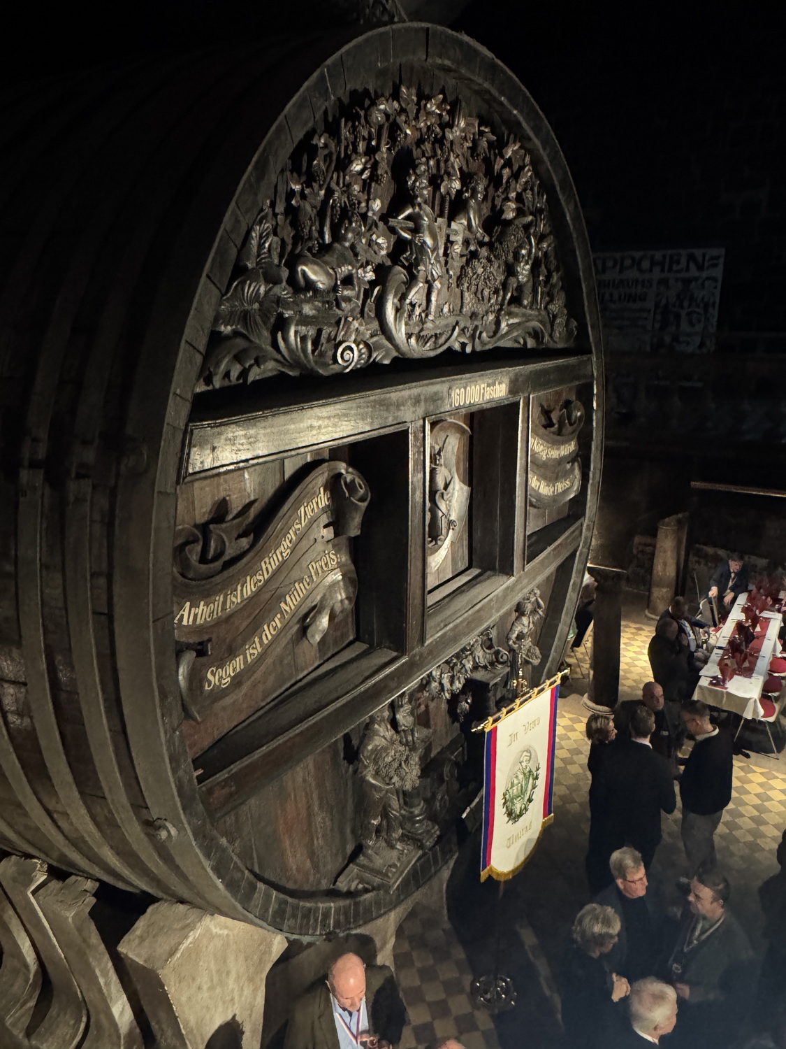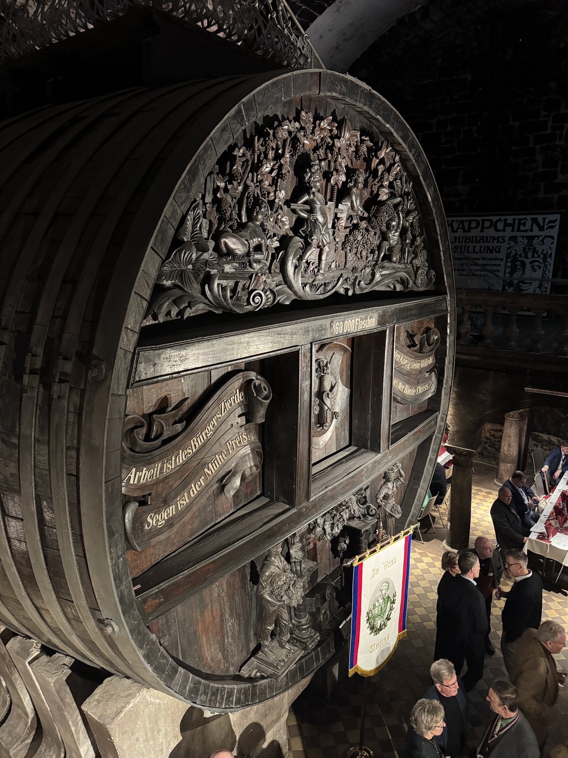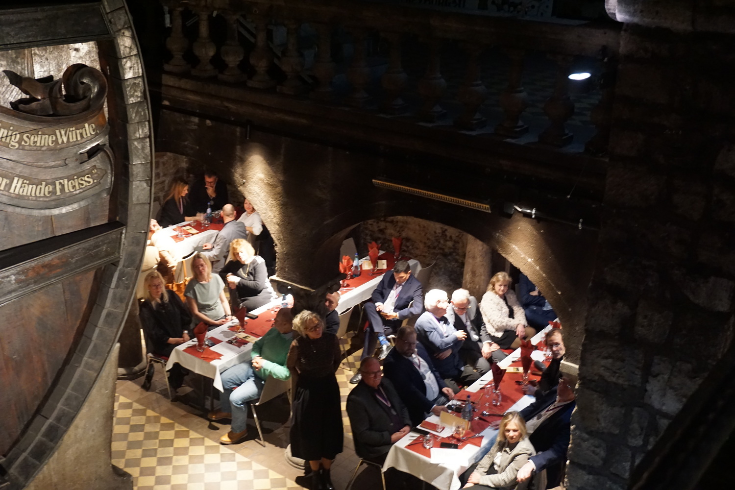 Die Feier fand im beeindruckenden Domkeller der Sektkellerei statt, in dessen historischem Gewölbe das größte Cuvéefass Deutschlands steht und vor dem die Fahne der Bruderschaft aufgestellt war.