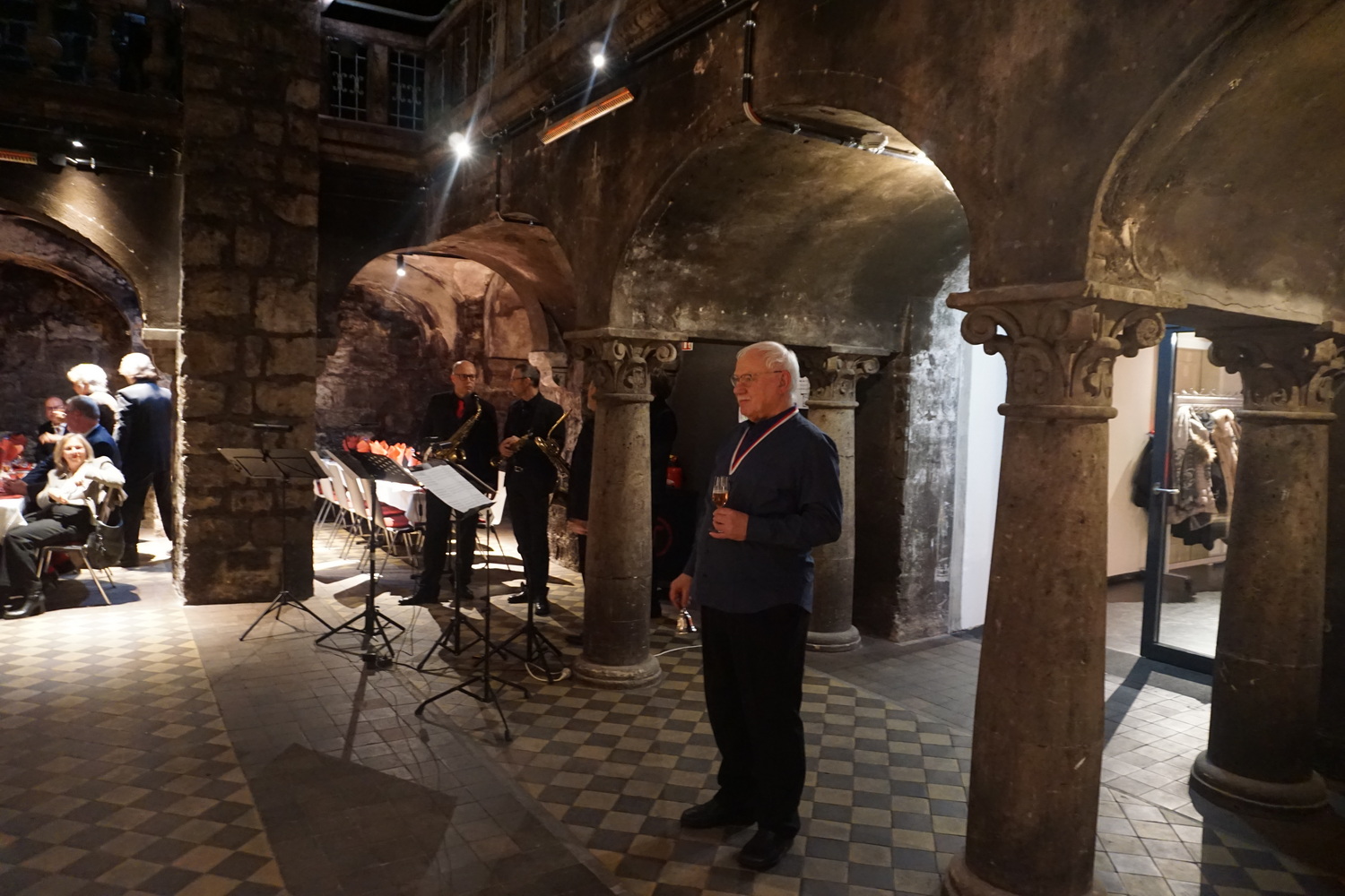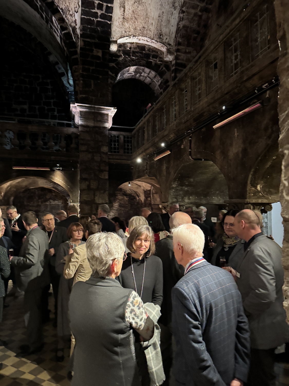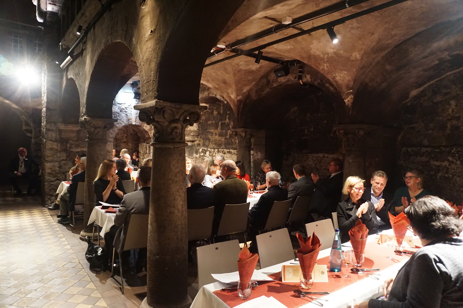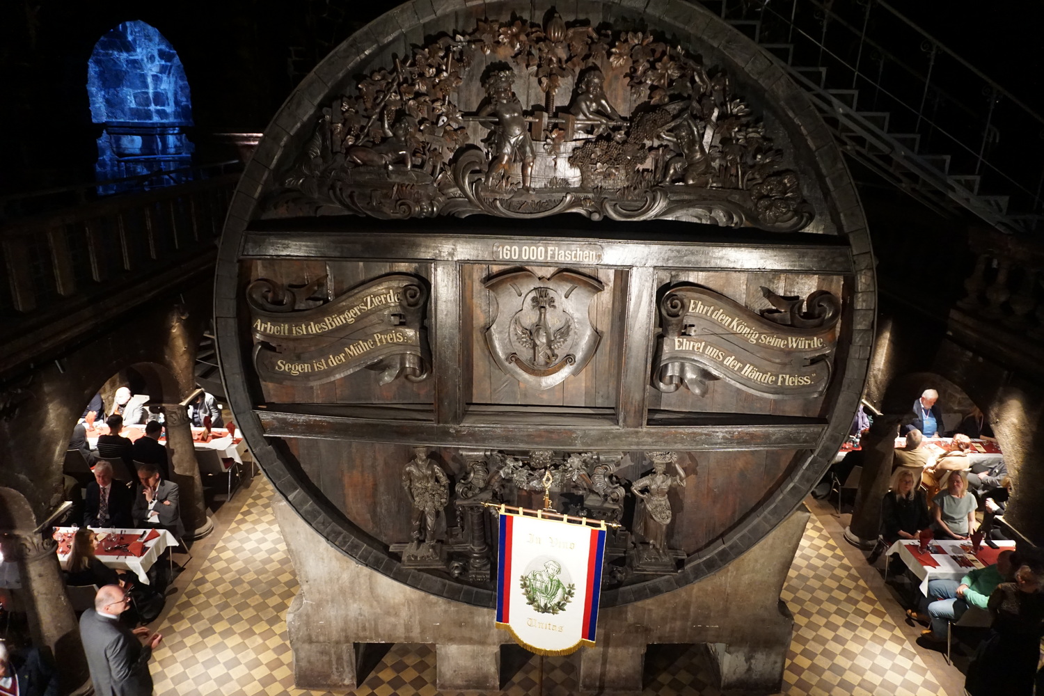Die Feier fand im beeindruckenden Domkeller der Sektkellerei statt, in dessen historischem Gewölbe das größte Cuvéefass Deutschlands steht und vor dem die Fahne der Bruderschaft aufgestellt war.